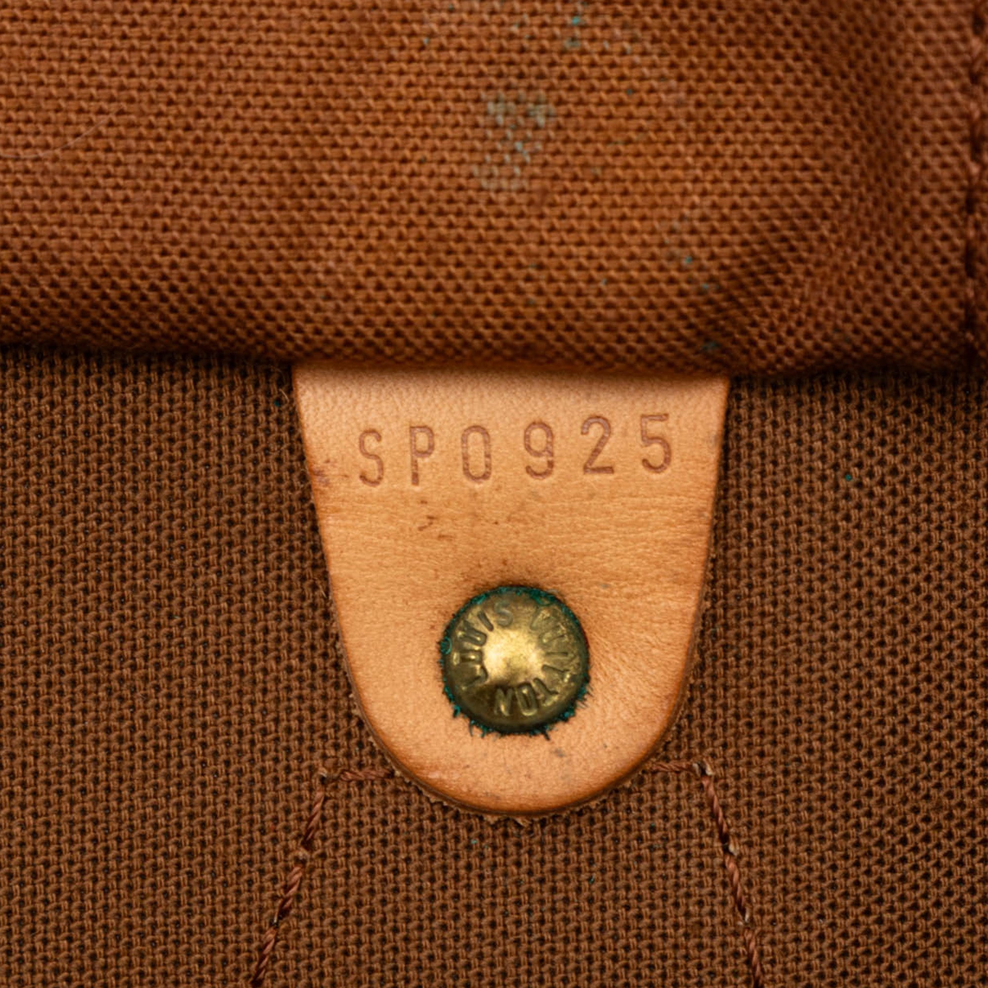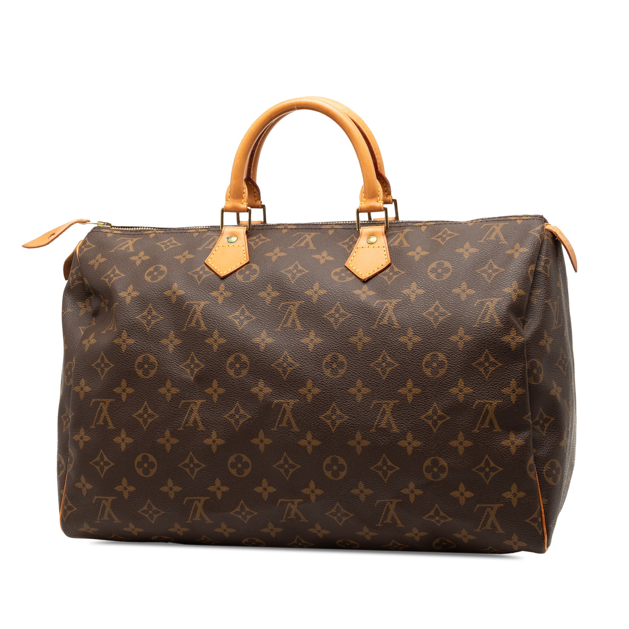 Product Details: Brown Louis Vuitton Monogram Speedy 40 Boston Bag. The Speedy 40 features a monogram canvas body with vachetta leather trim, rolled vachetta leather handles, and a top zip closure. 9.8" L x 15.7" W x 7.5" D, 3.3" drop. Serial number SP0925.