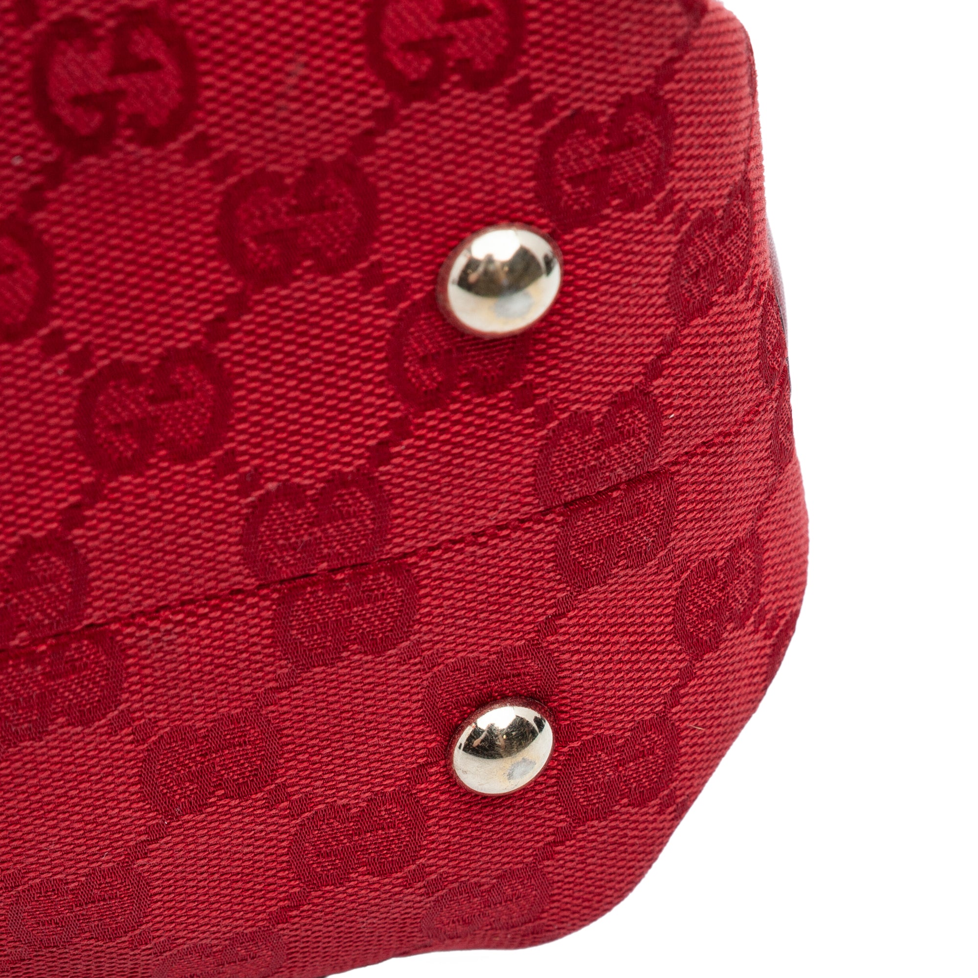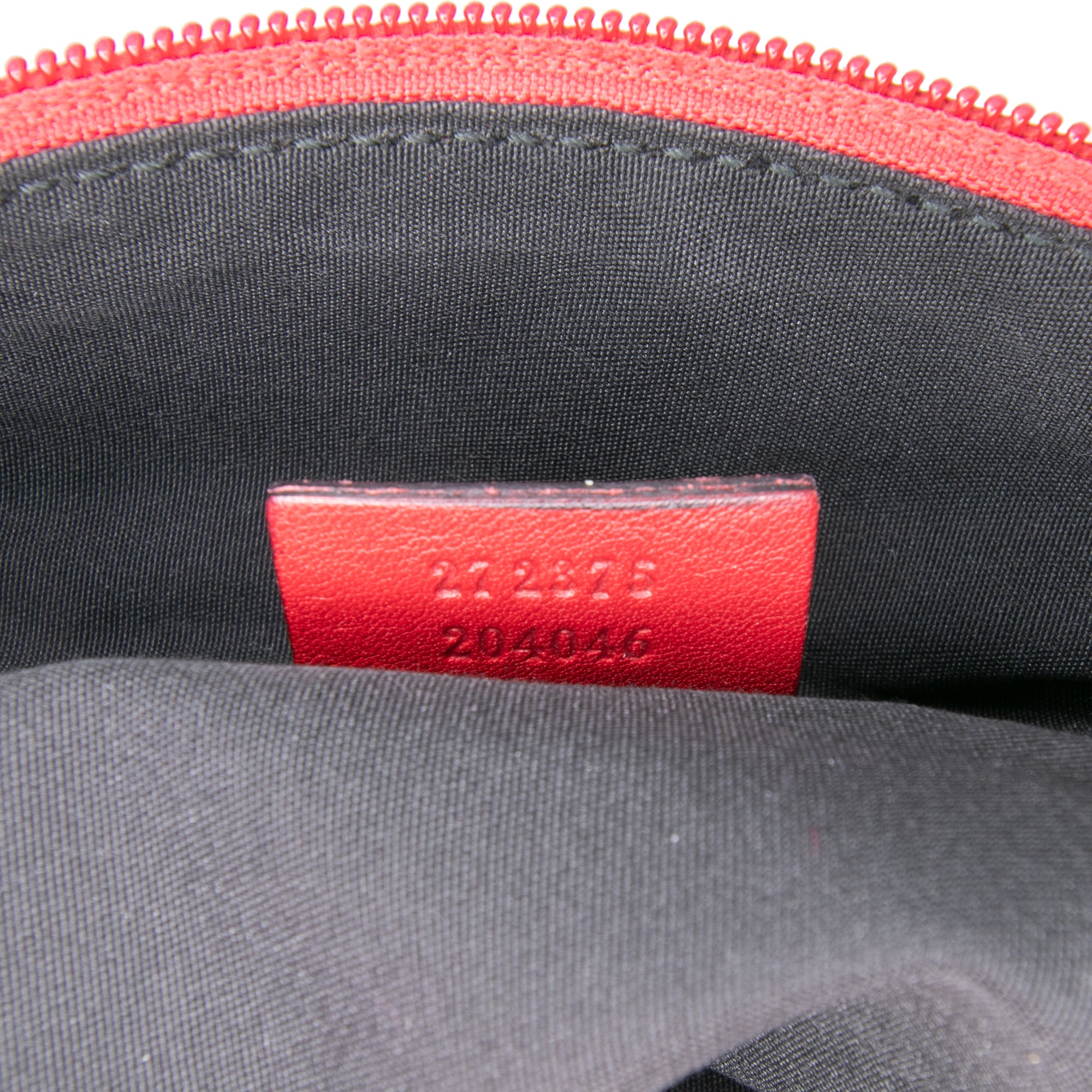 Product Details: Red Gucci GG Canvas Boston Bag. This boston bag features a canvas body with leather trim, rolled leather handles, a top zip closure, and an interior zip pocket. 7.5" L x 13" W x 5.1" D, 3.9" drop. Serial number 272375 204046.