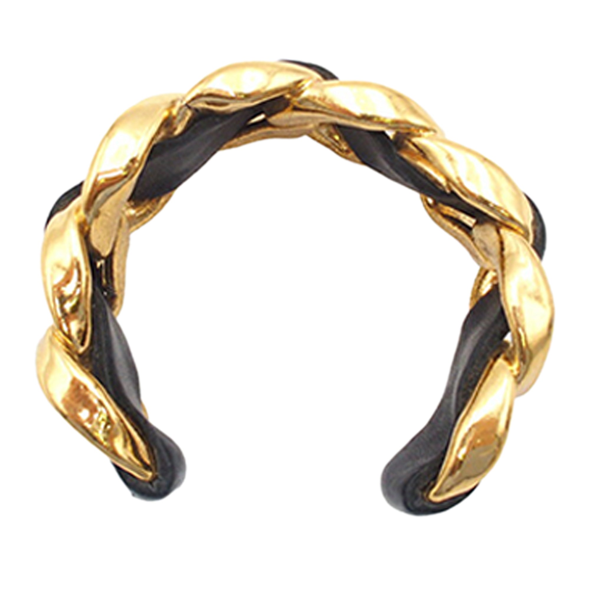Product Details: Gold Chanel Gold Plated Leather Woven Chain Cuff Bracelet. This bracelet features a gold-tone leather woven metal body. 7.1" L x 1.2" W x 0" D.