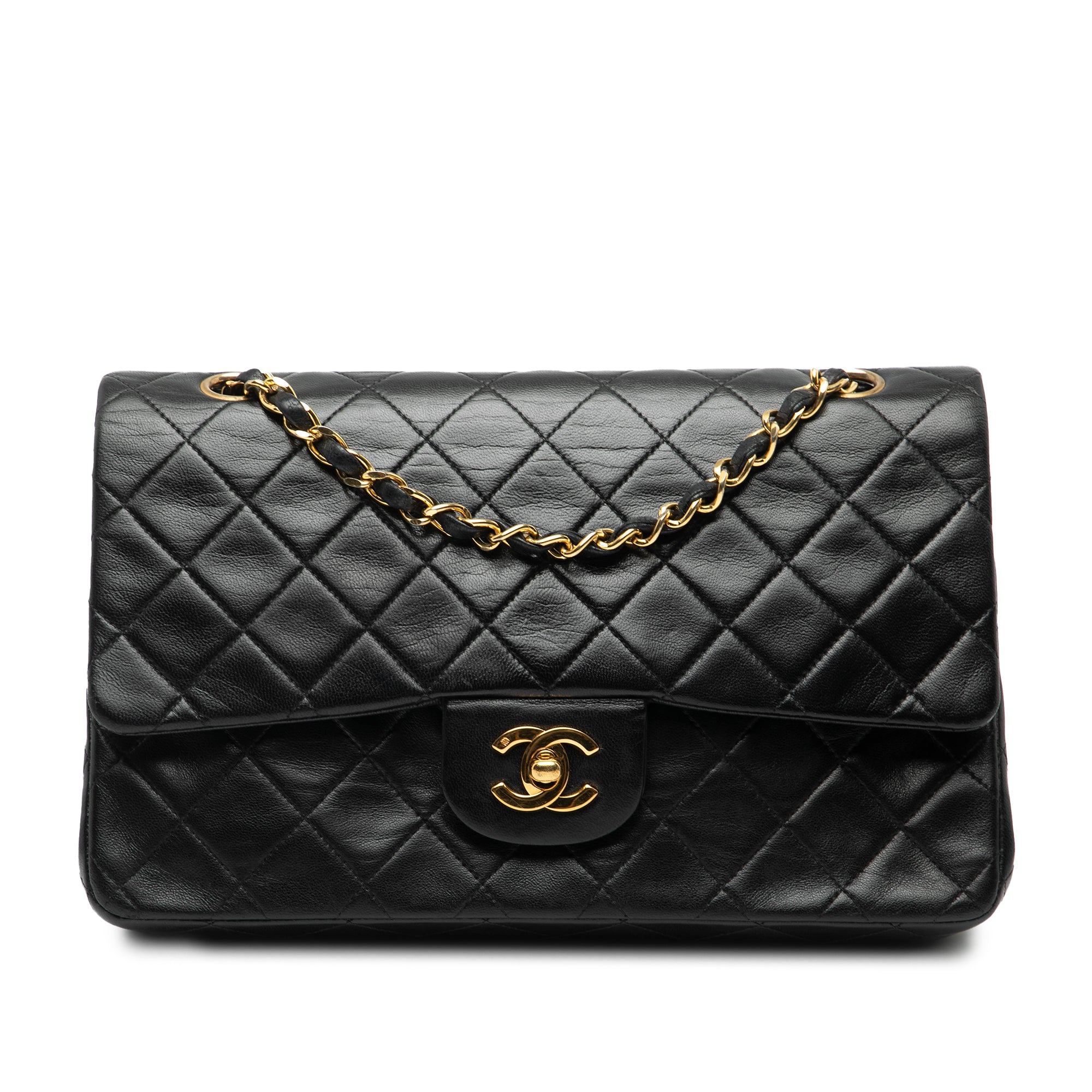 Product Details: Black Chanel Medium Classic Lambskin Double Flap Shoulder Bag. This shoulder bag features a quilted lambskin body, leather woven chain straps, double front flaps with interlocking Cs and a twist lock closure, an exterior back slip pocket, and interior zip and slip pockets. 6.3" L x 9.8" W x 2.6" D, 9.4" drop. Serial number 2031758.