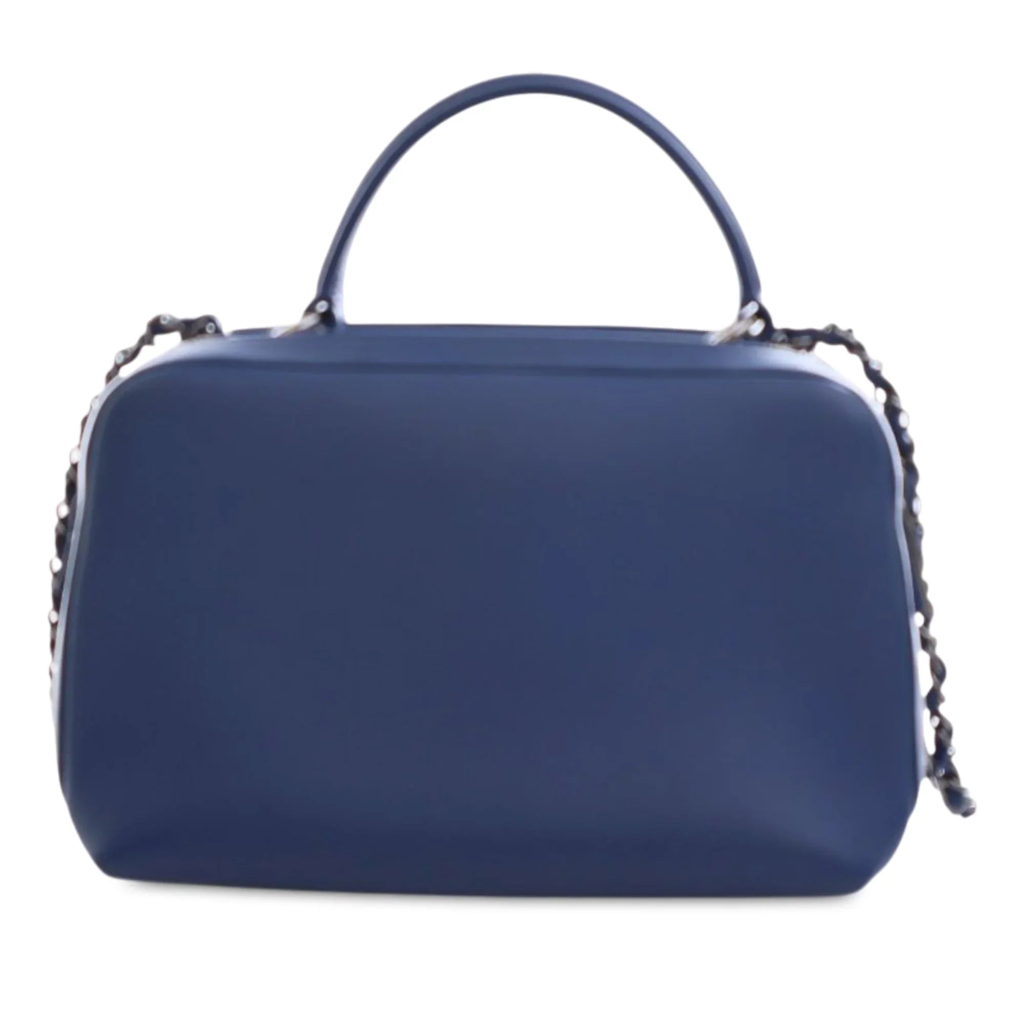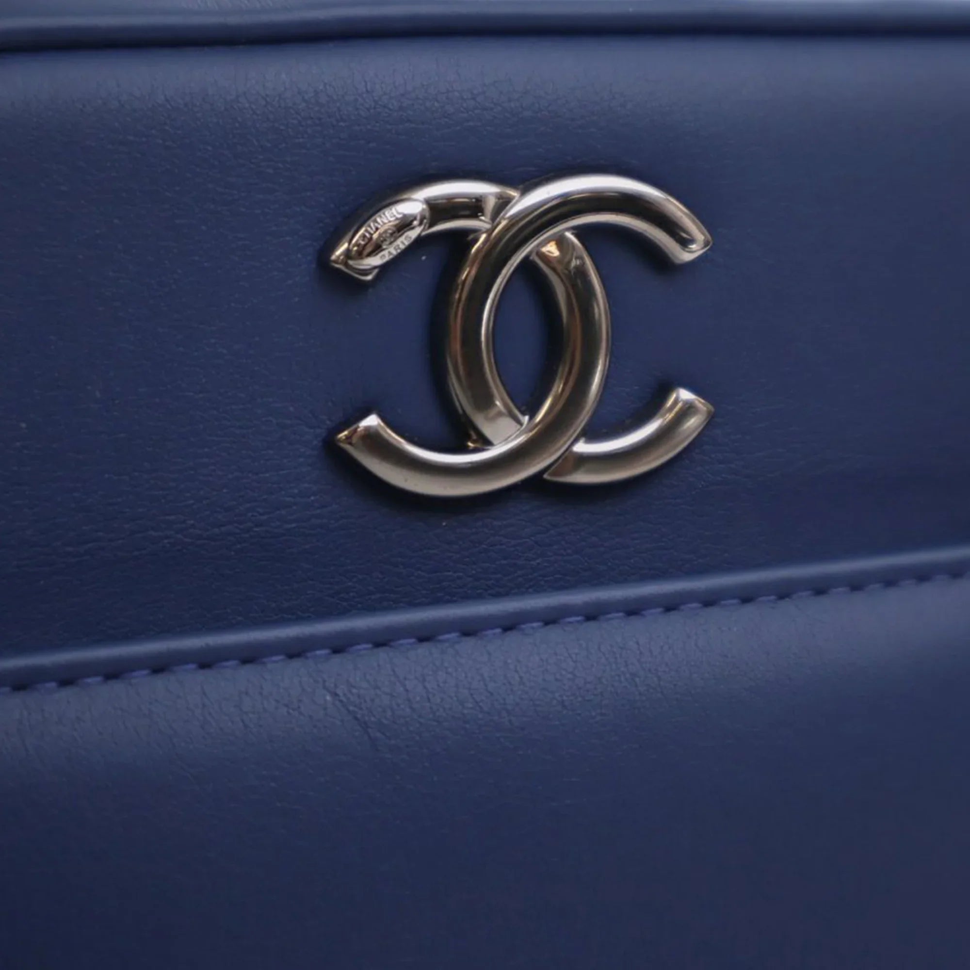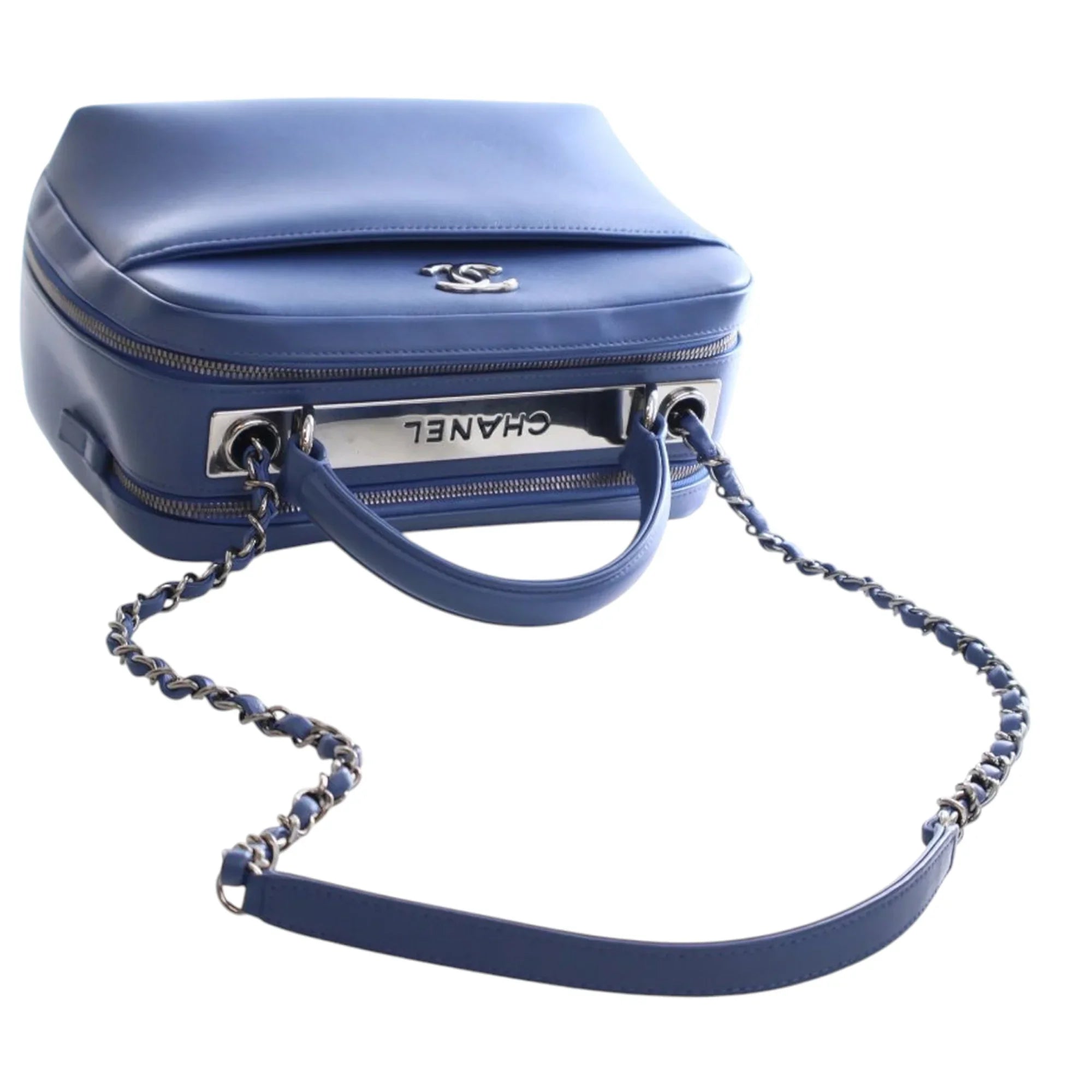 Product Details: Blue Chanel Medium Calfskin Trendy CC Bowling Bag Satchel. The Trendy CC satchel features a leather body, a rolled leather top handle, a leather woven chain link strap with leather shoulder guard, top zip closures, an exterior front slip pocket, and interior zip and slip pockets. 7" L x 10.5" W x 6" D.