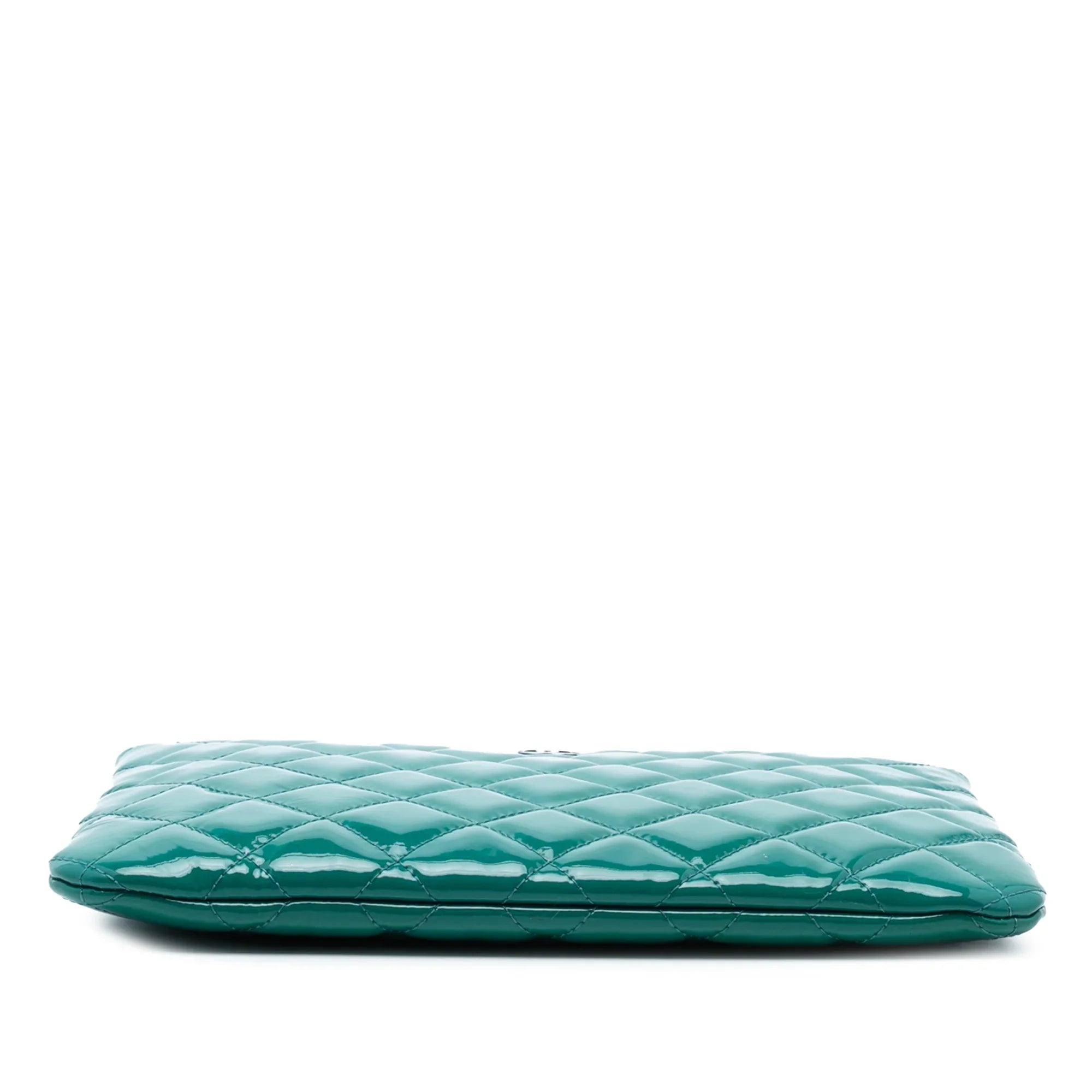 Product Details: Blue Chanel Small CC Quilted Patent O Case Clutch. This clutch bag features a quilted patent leather body and a top zip closure. 6.7" L x 9.4" W x 0.8" D. Serial number 20556607.