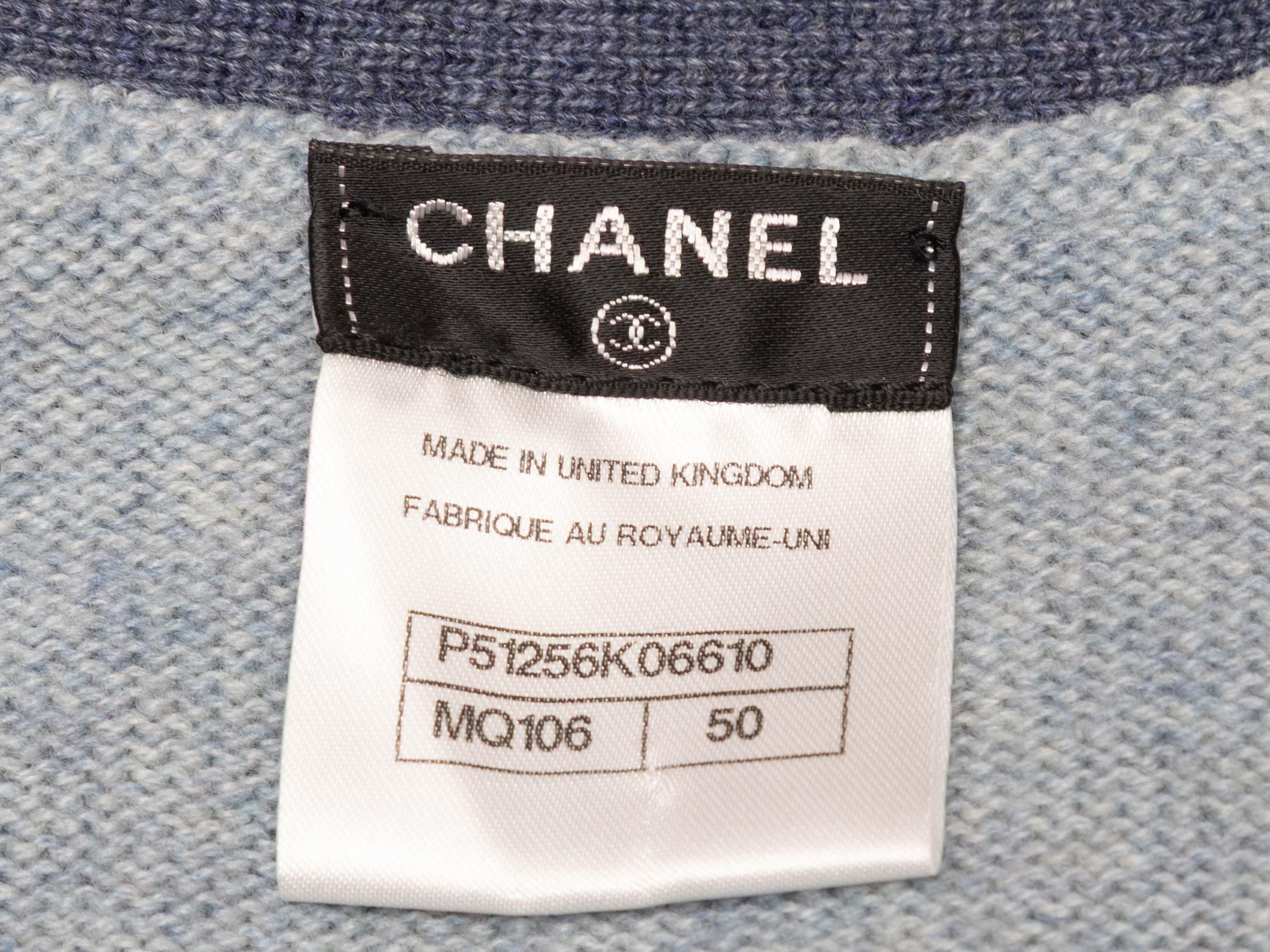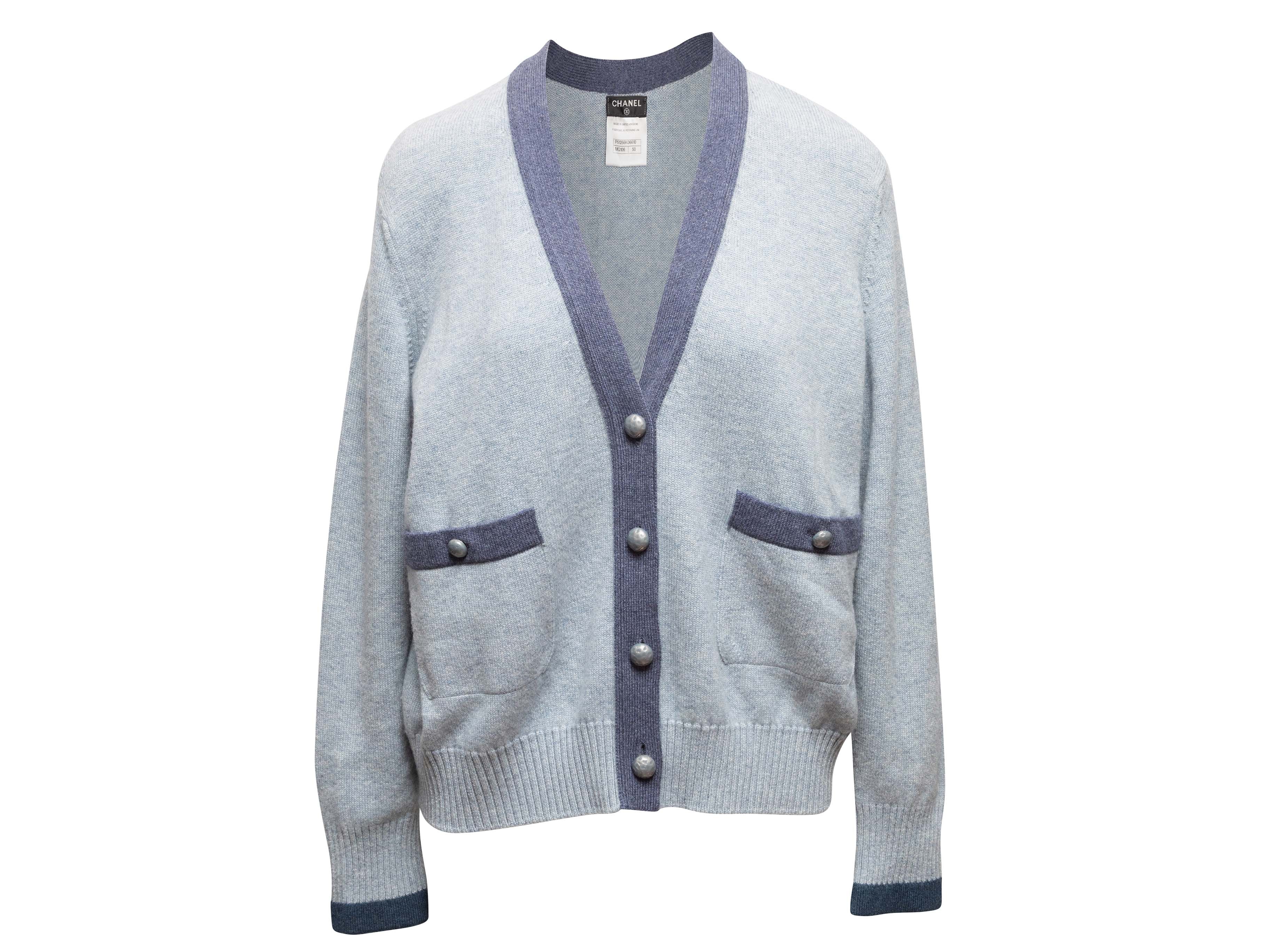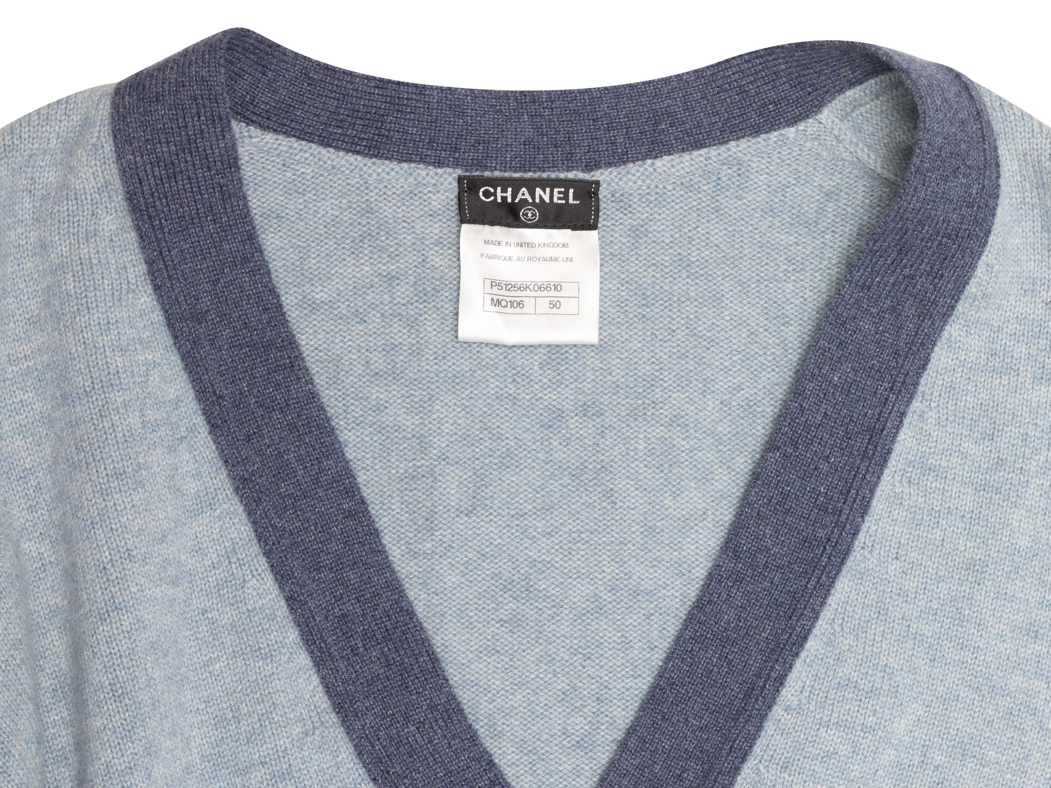 Product Details: Light blue and navy cashmere V-neck cardigan by Chanel. Dual hip pockets. Button closures at center front. 45.5" bust, 18" shoulder width, 25" length.