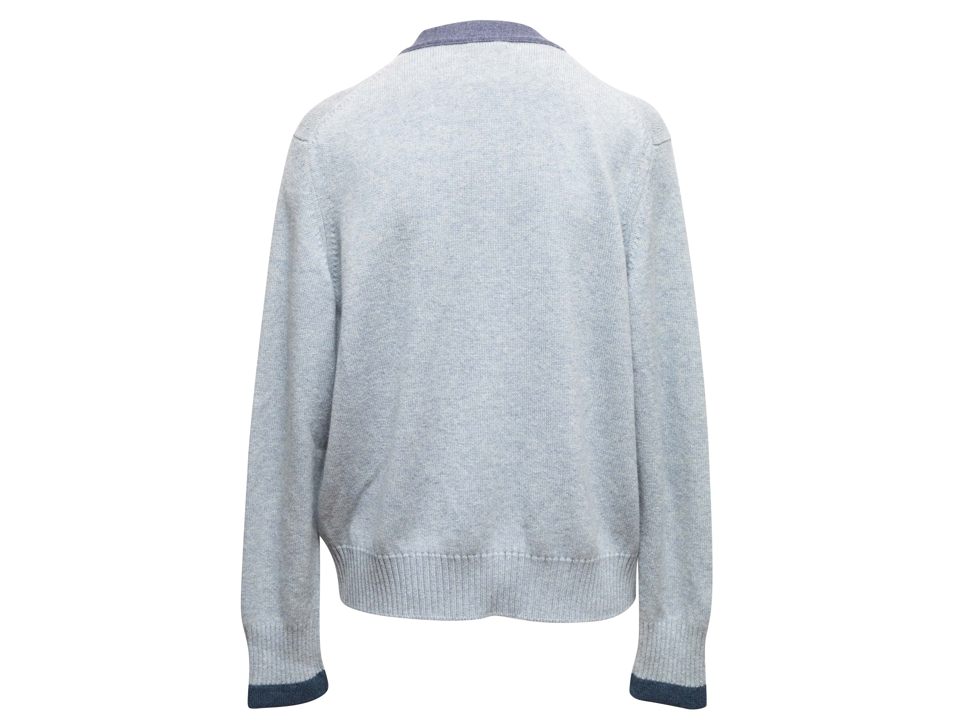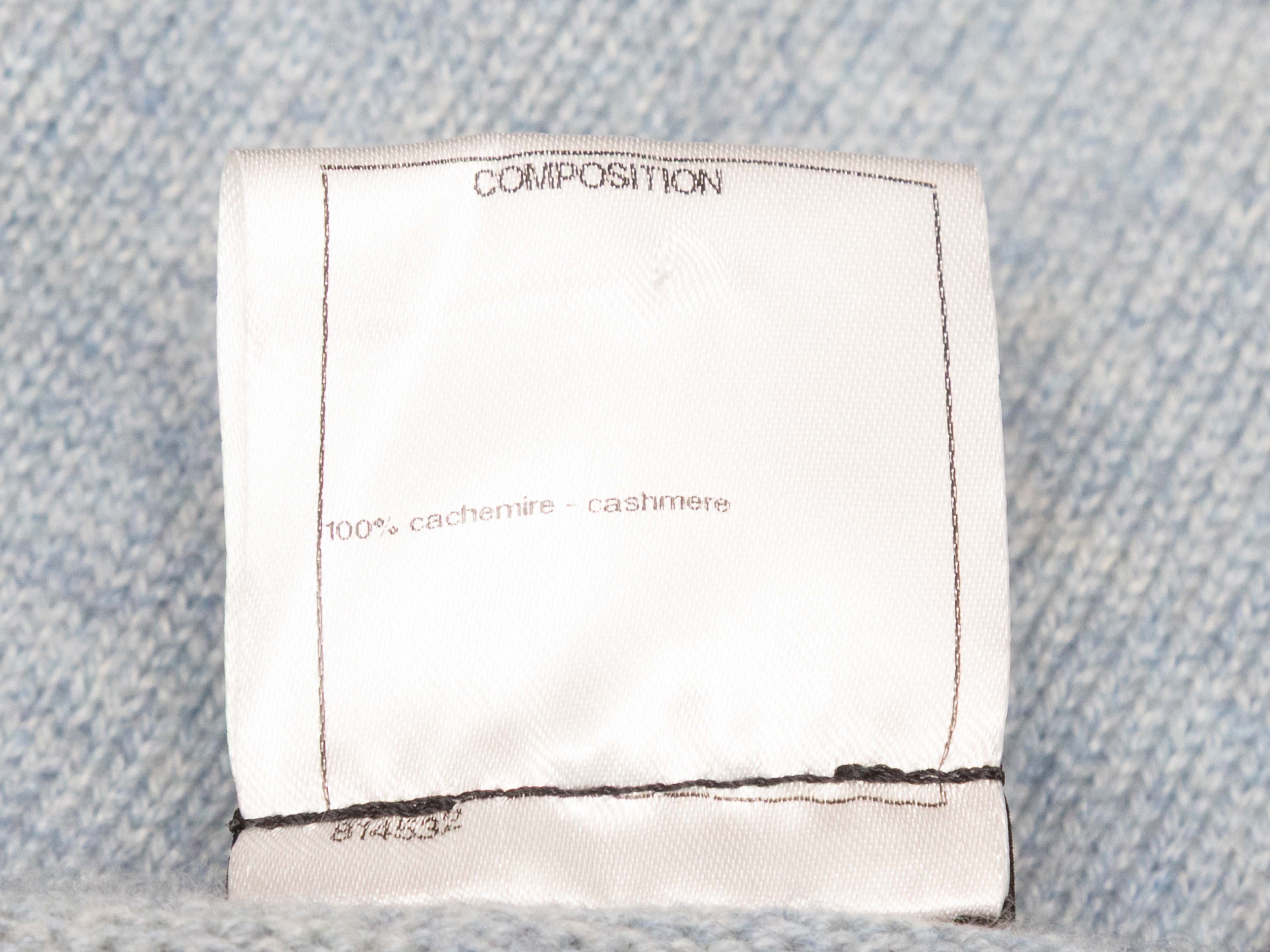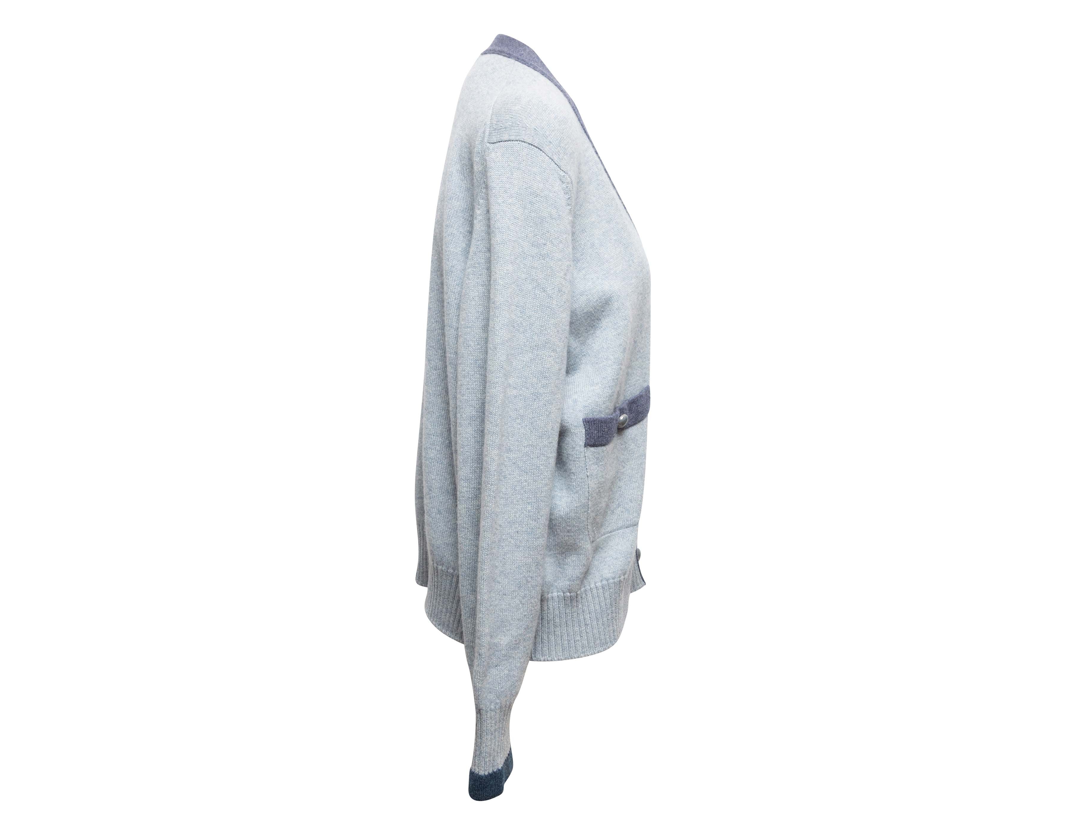 Product Details: Light blue and navy cashmere V-neck cardigan by Chanel. Dual hip pockets. Button closures at center front. 45.5" bust, 18" shoulder width, 25" length.