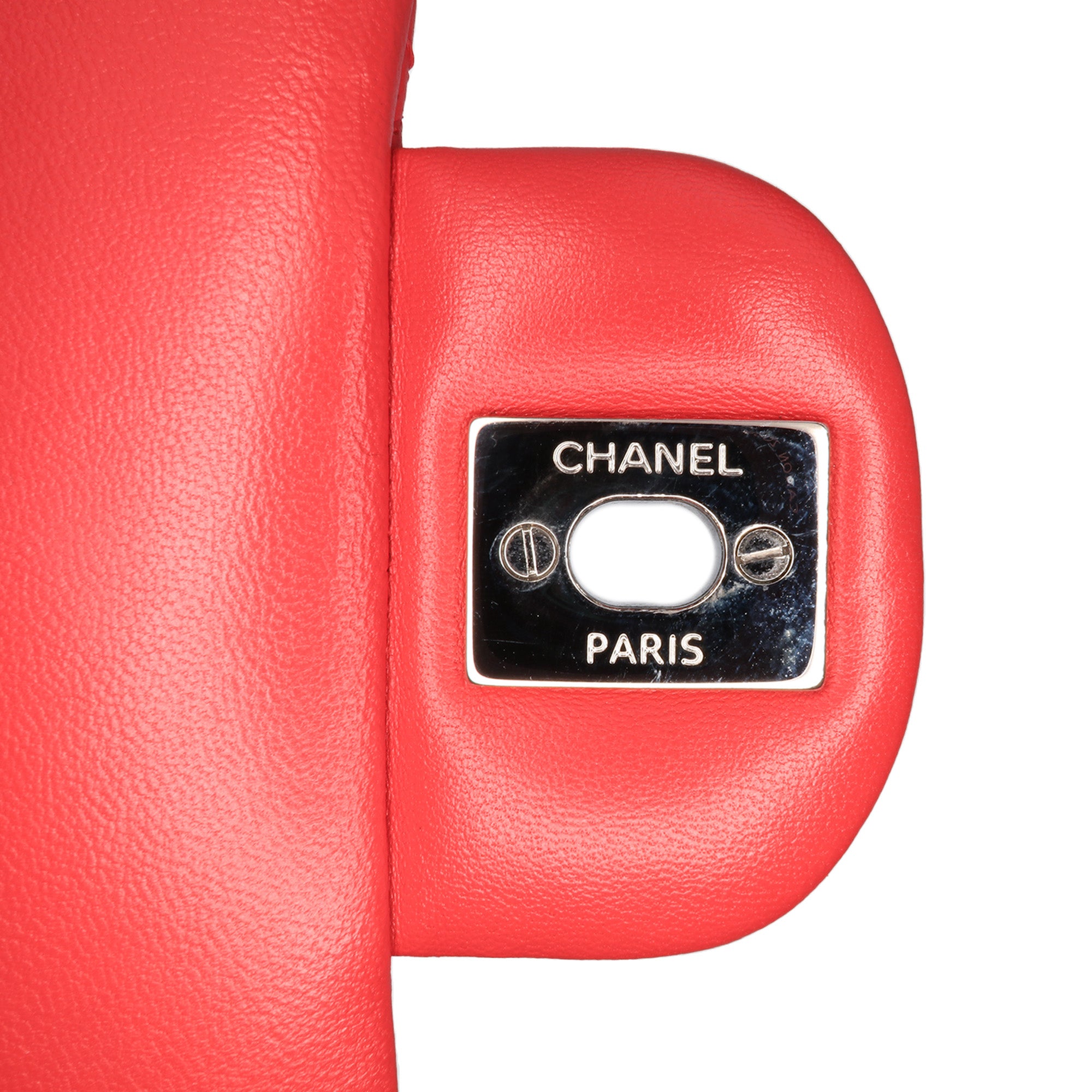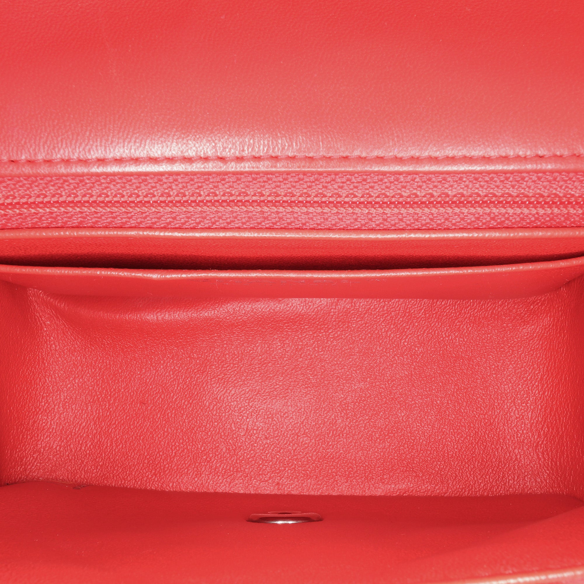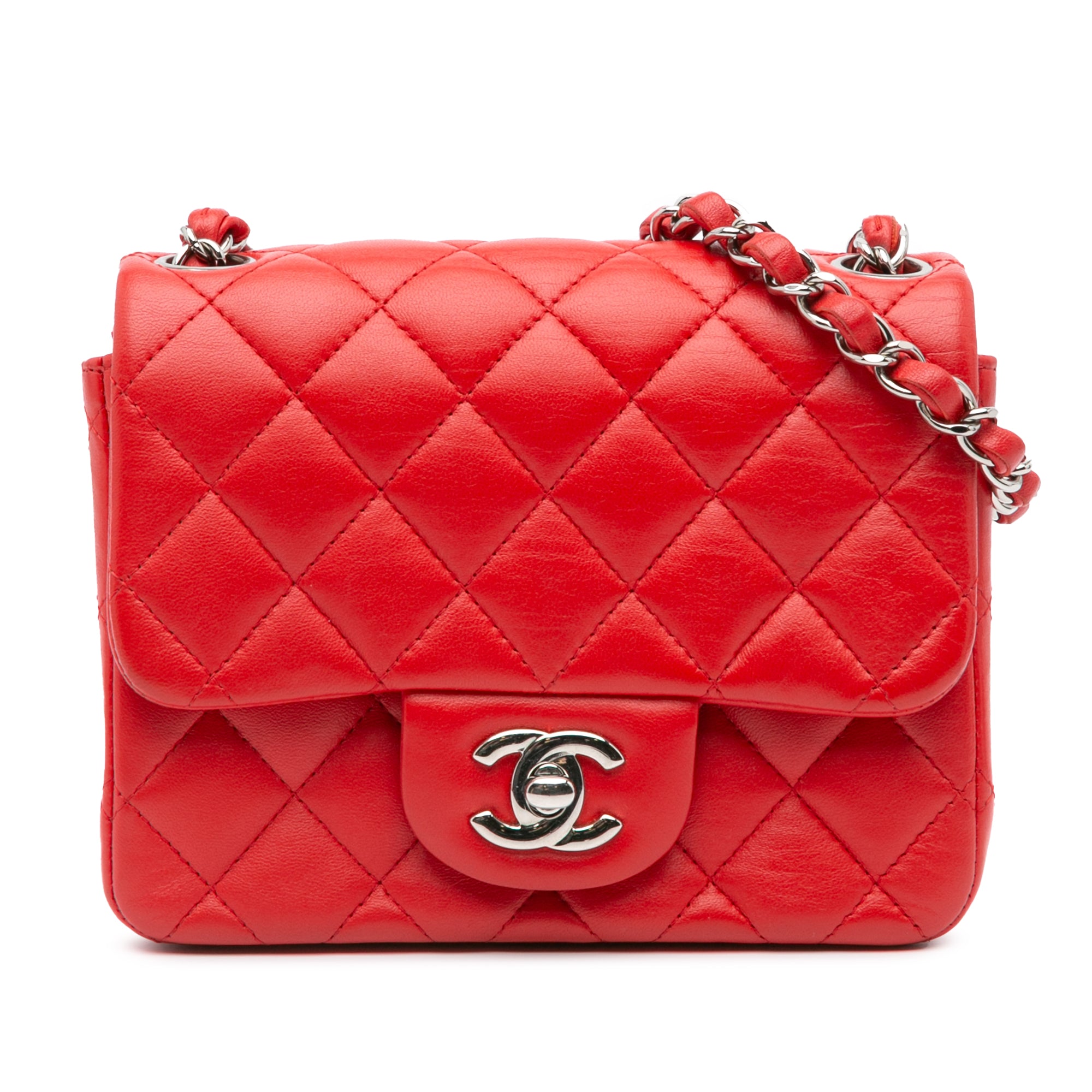 Product Details: Red Chanel Mini Square Classic Lambskin Flap Crossbody Bag. This crossbody bag features a quilted lambskin leather body, a leather woven chain link shoulder strap, a flap with CC turn lock closure, and interior zip and slip pockets. 5.3" L x 6.7" W x 3" D. Serial number 22629752.