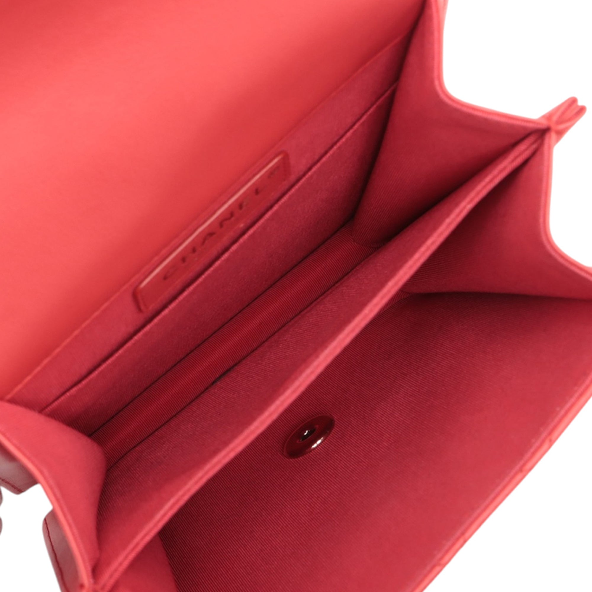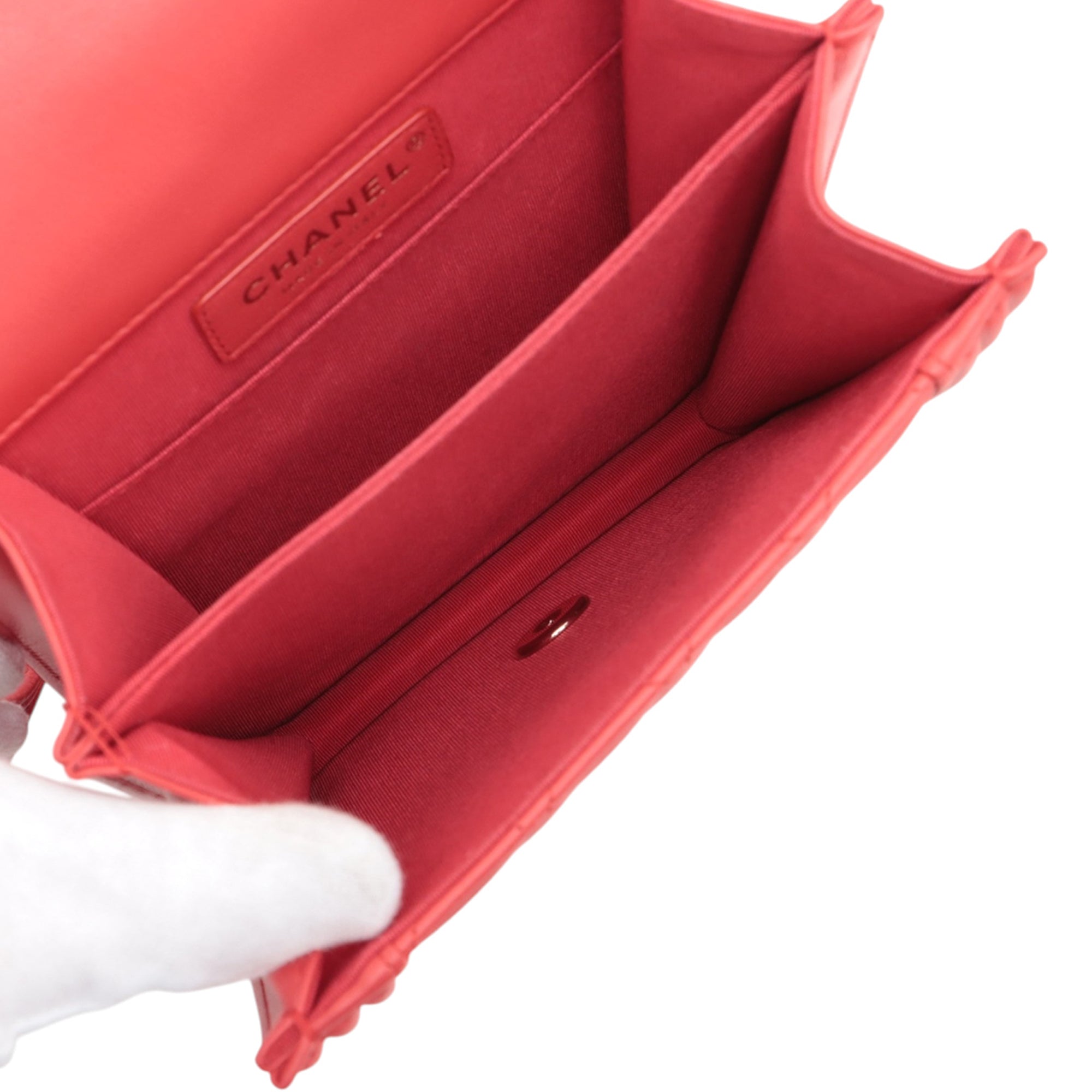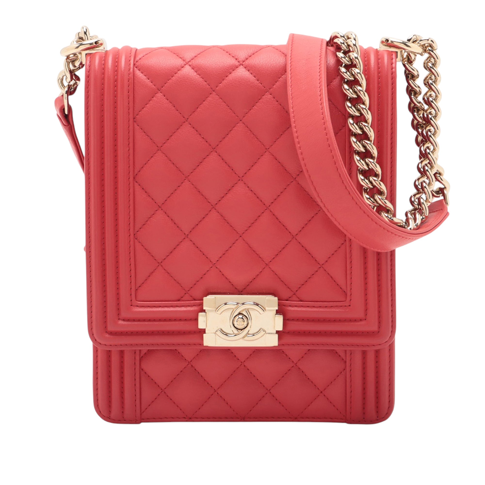 Product Details: Red Chanel Quilted Lambskin North South Boy Flap Crossbody Bag. The North South Boy Flap features a lambskin leather body, a curb chain strap with leather shoulder guard, a front flap with a CC push-lock closure, and an interior slip pocket. 7.9" L x 6.3" W x 2.6" D. Serial number 27553484.