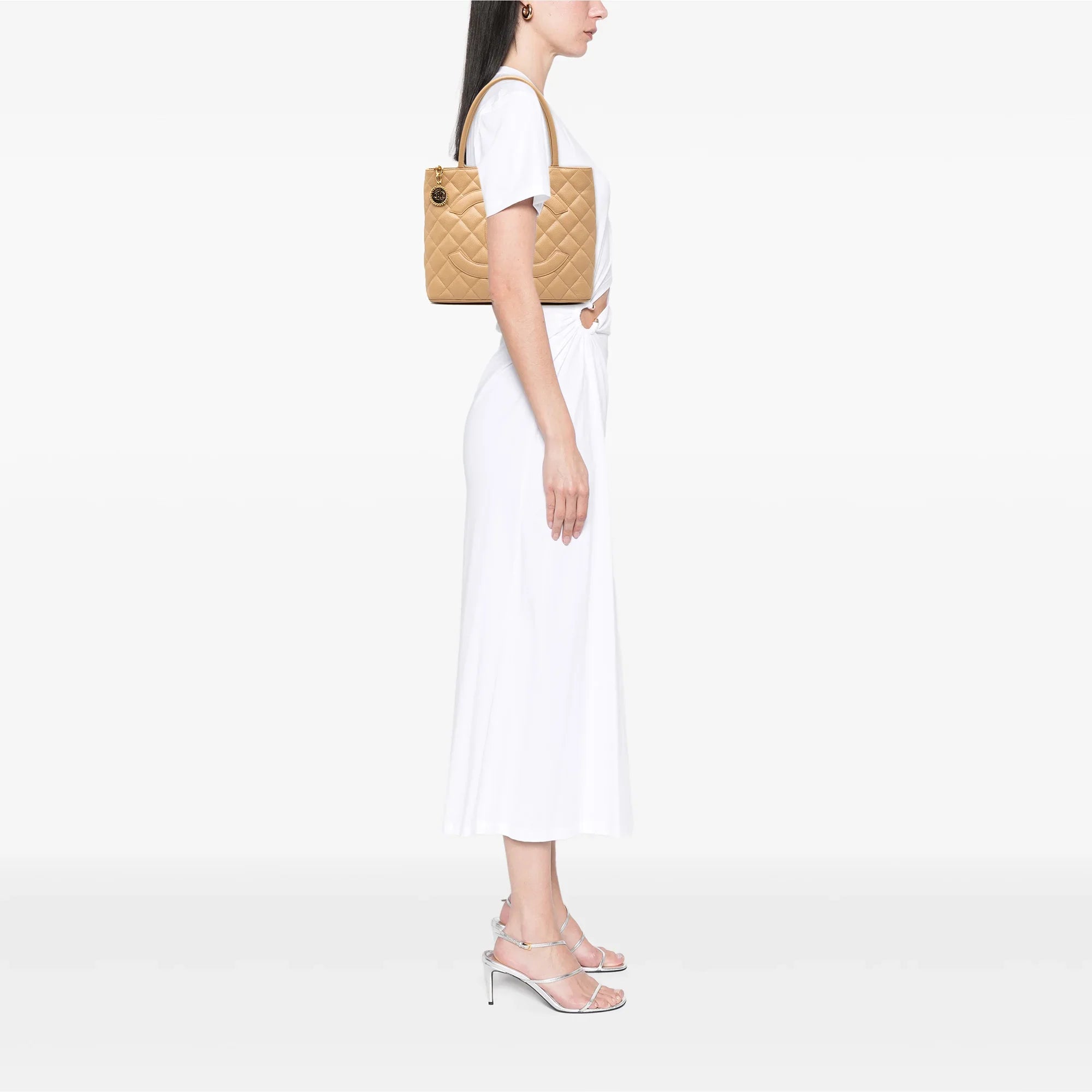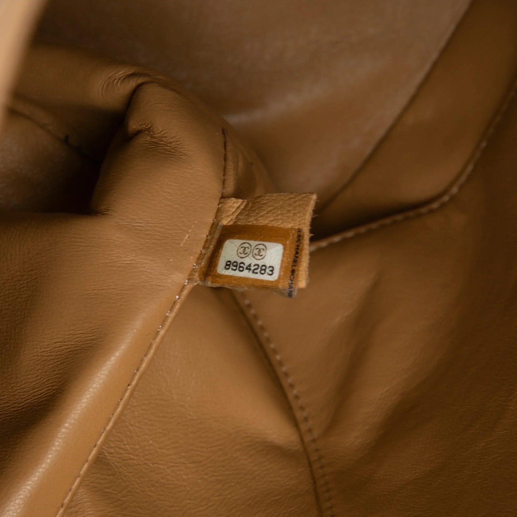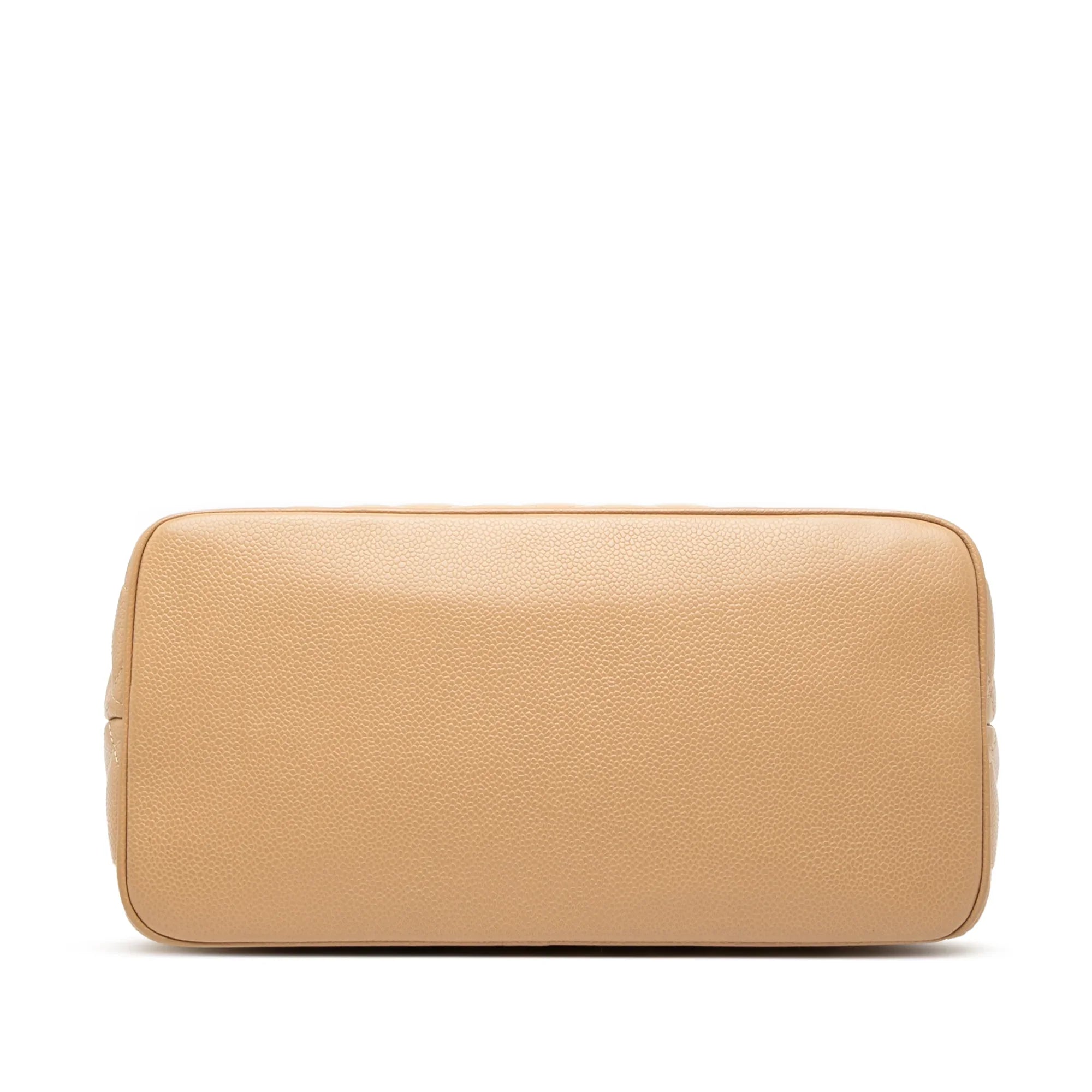 Product Details: Tan Chanel Caviar Medallion Tote. The Medallion tote bag features a quilted caviar leather body, rolled leather handles, a top zip closure, an exterior back slip pocket, and interior zip and slip pockets. 9.1" L x 11.4" W x 5.7" D. Serial number 8964283.
