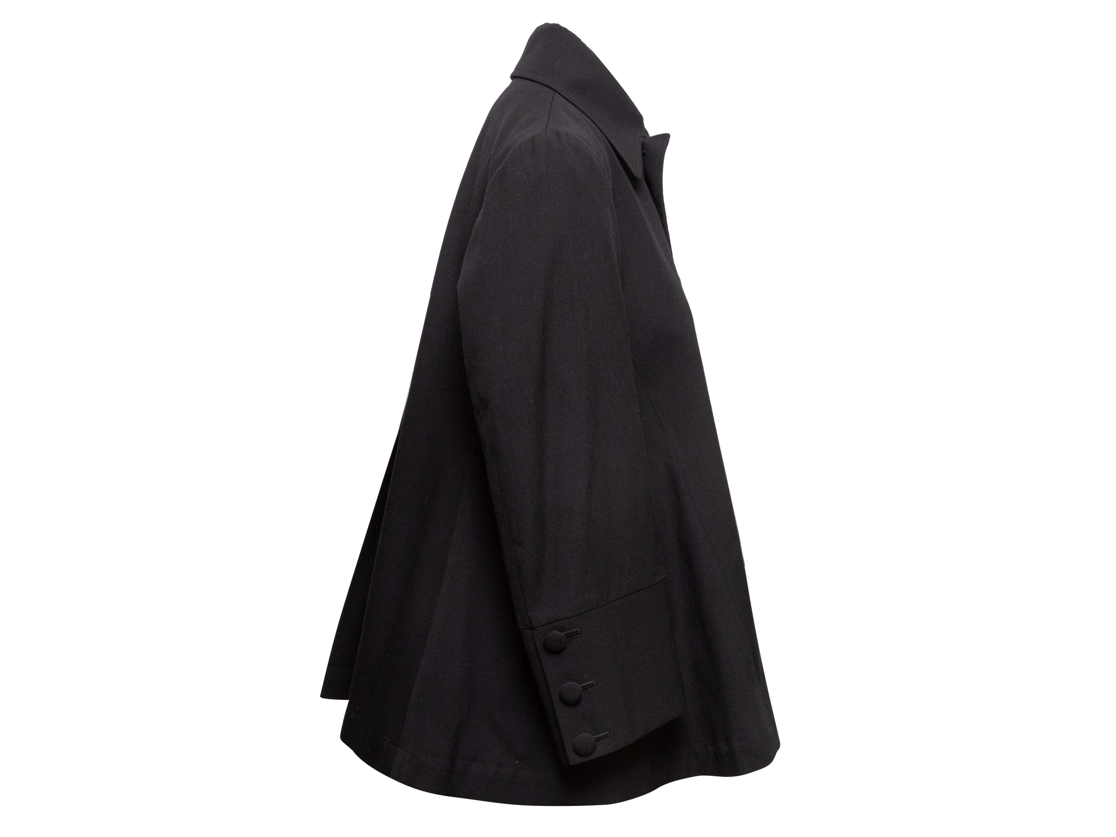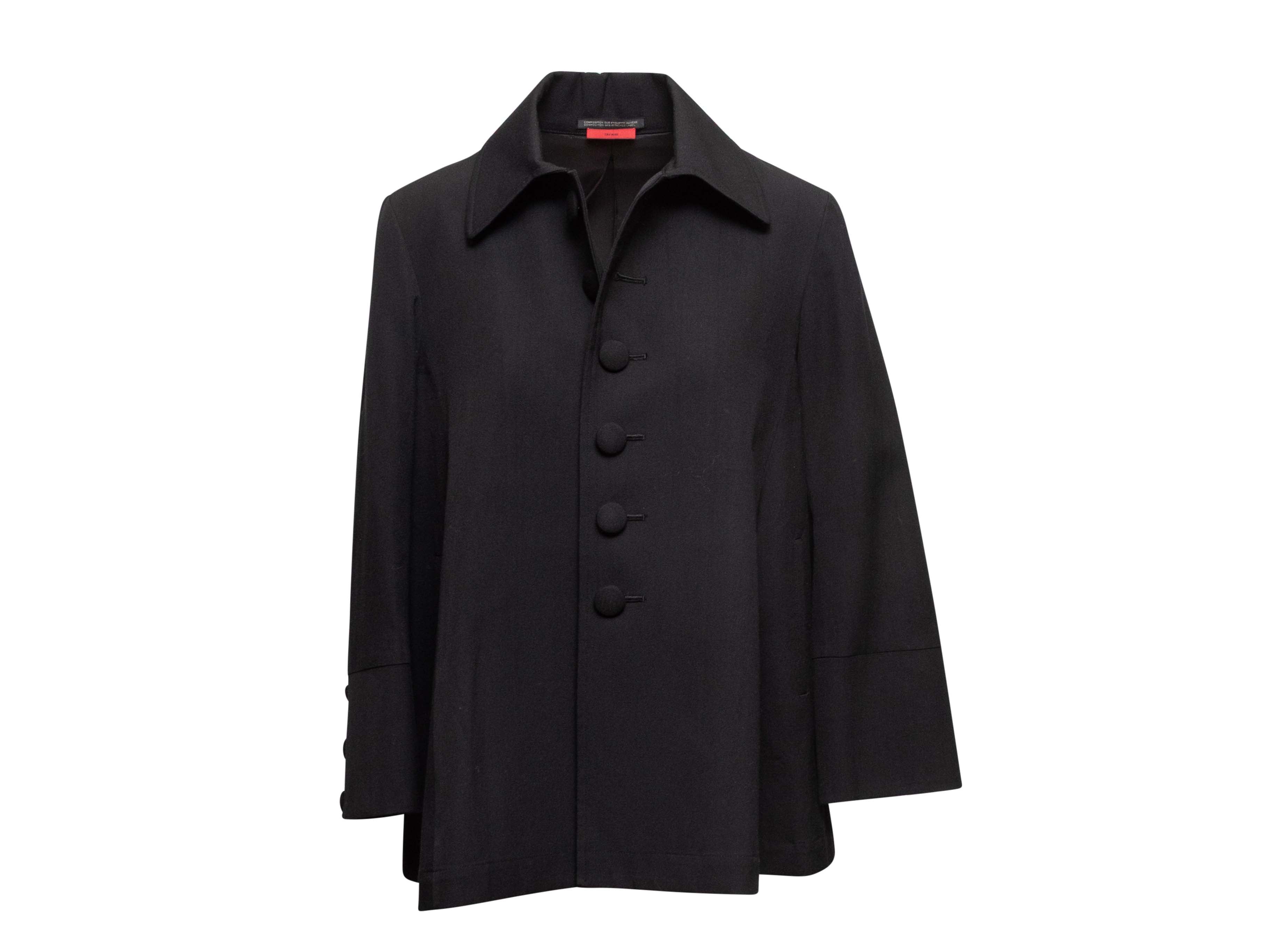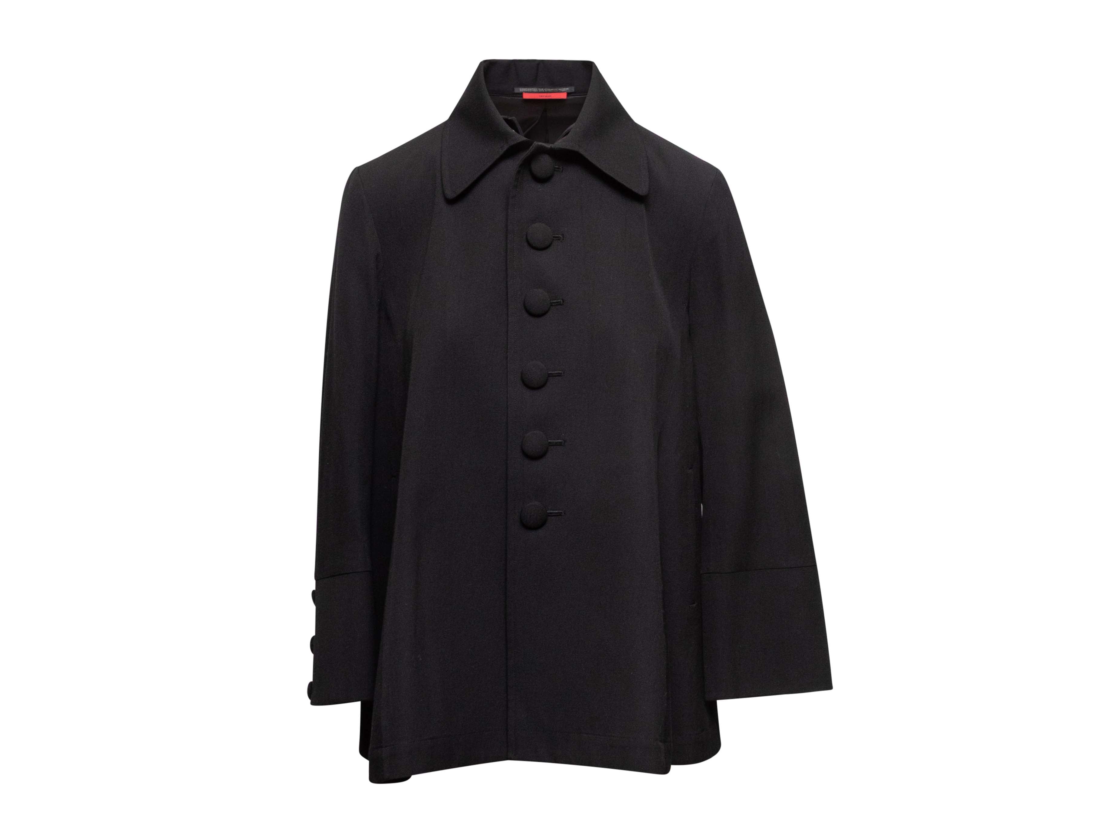 Product Details: Black wool coat by Yohji Yamamoto. Pointed collar. Dual hip pockets. Fabric covered button closures at front. 39" bust, 16" shoulder width, 22" sleeve length, 28" length.