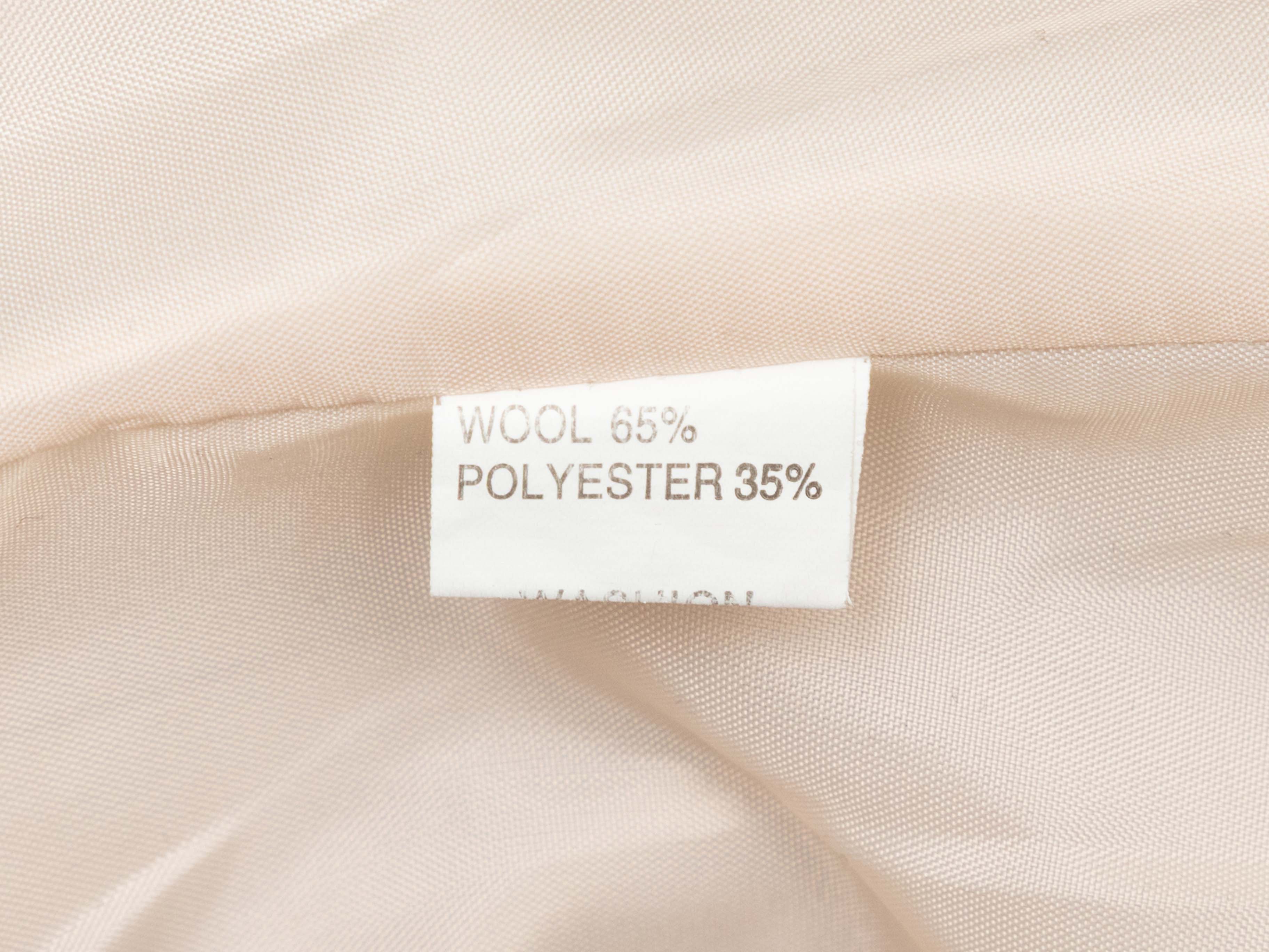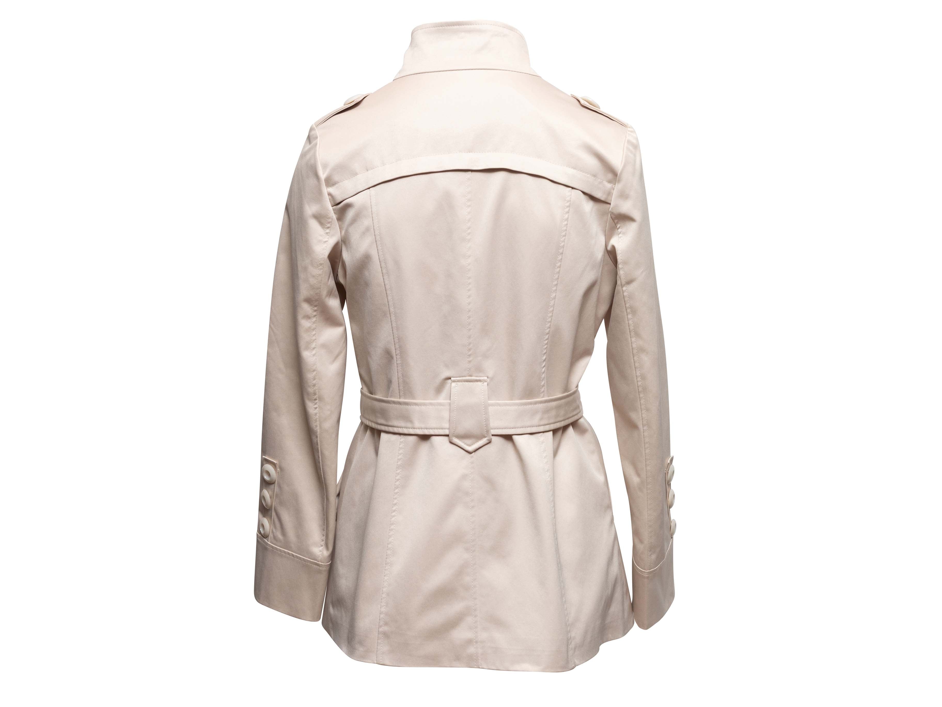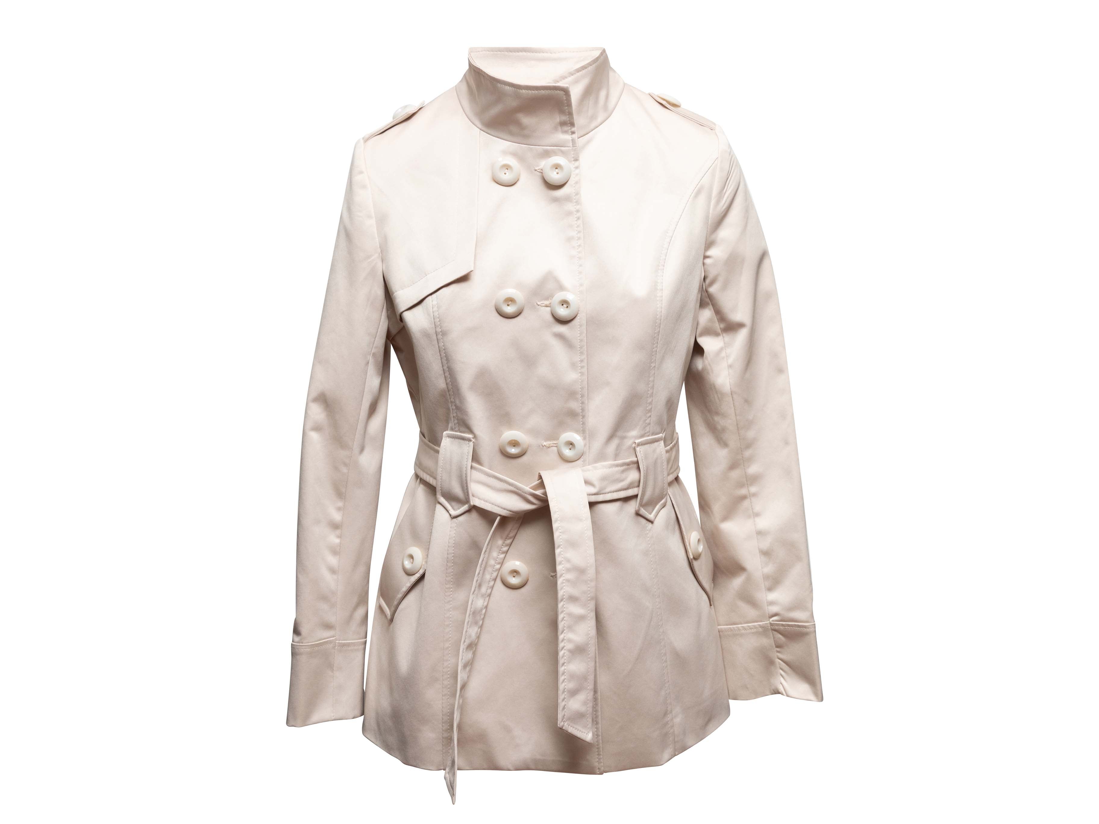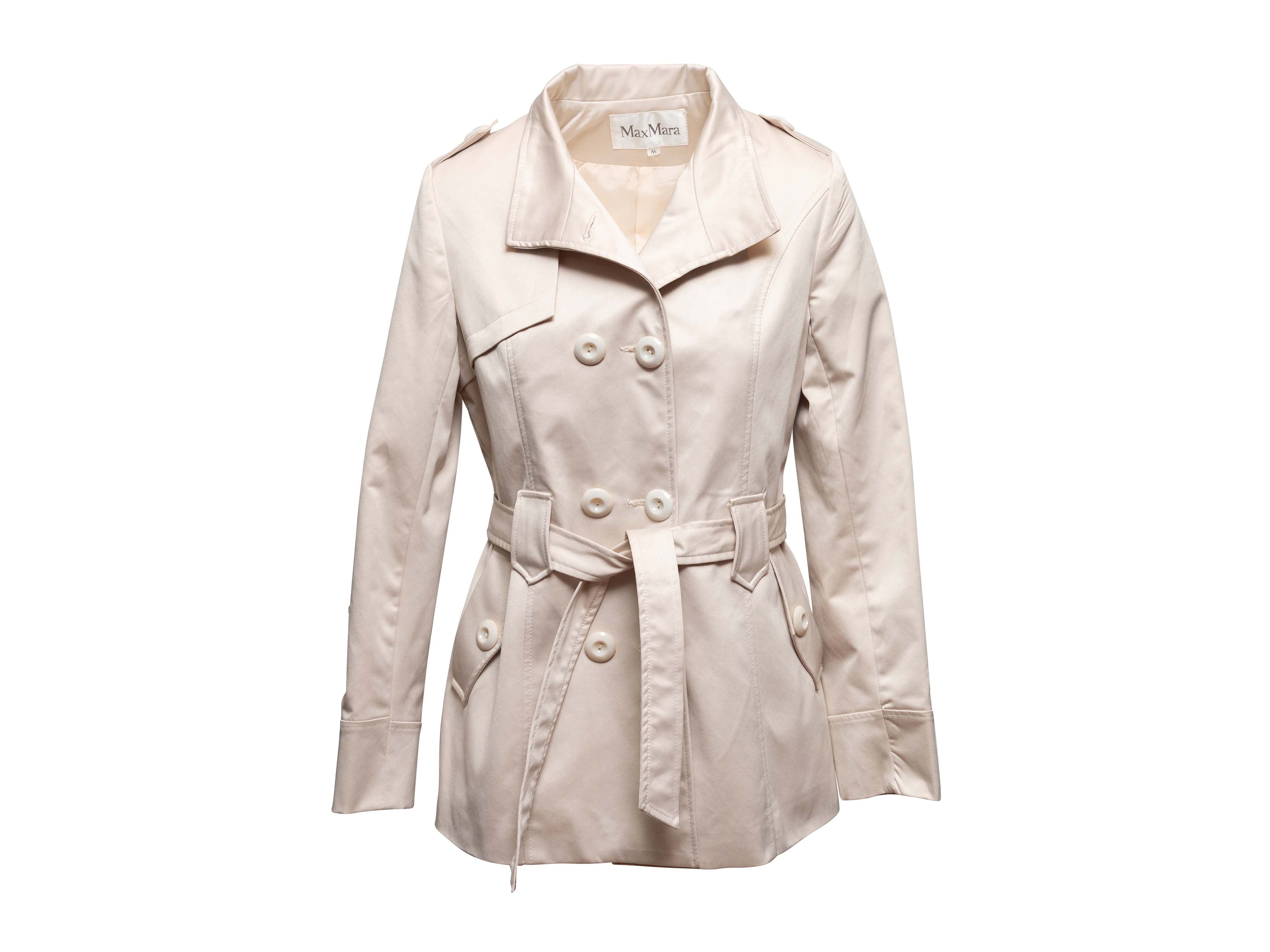 Product Details: Cream wool-blend double-breasted coat by Max Mara. Stand collar. Dual hip pockets. Front button and sash tie closures. 34" bust, 15" shoulder width, 24" sleeve length, 28" length.