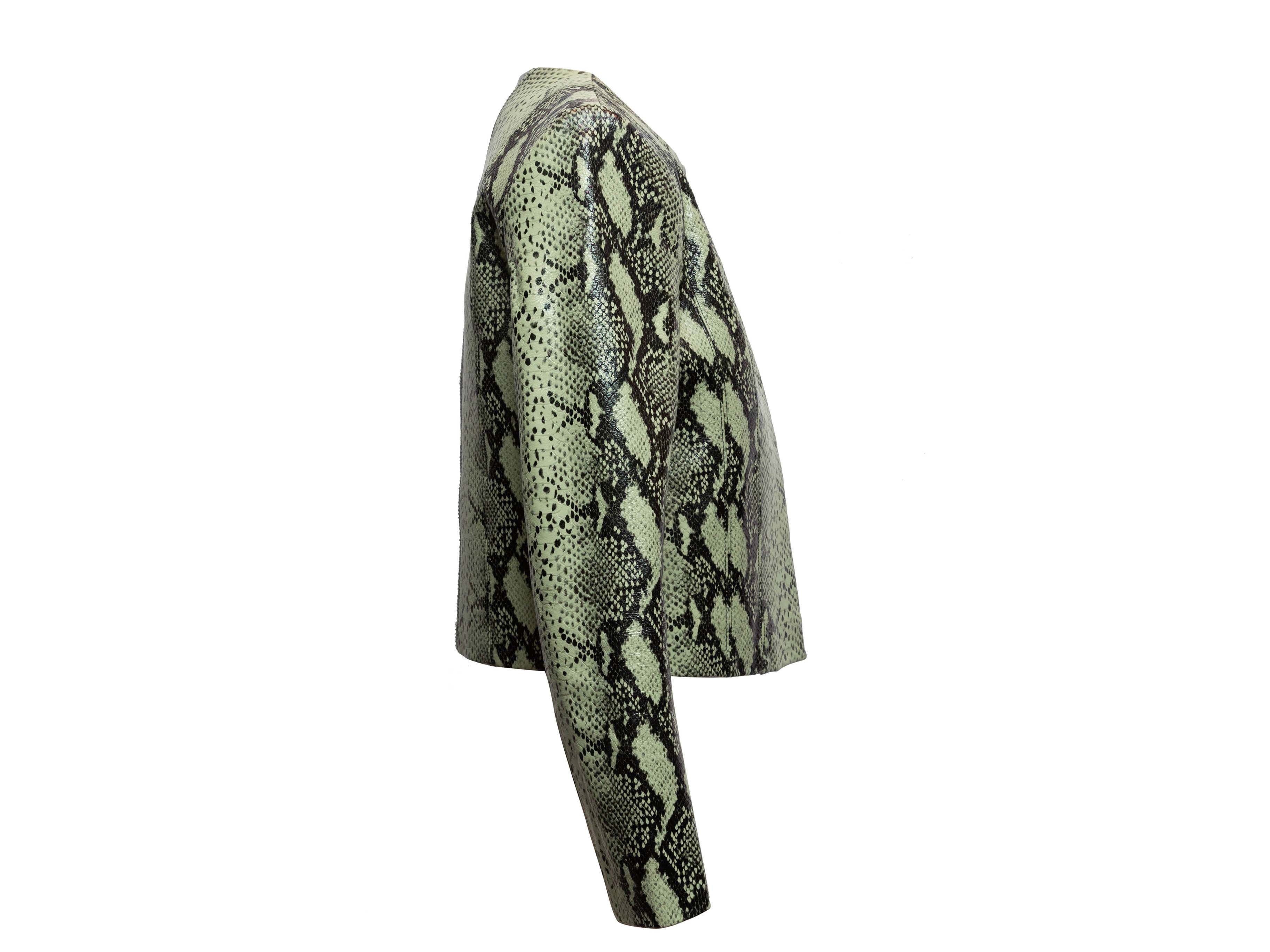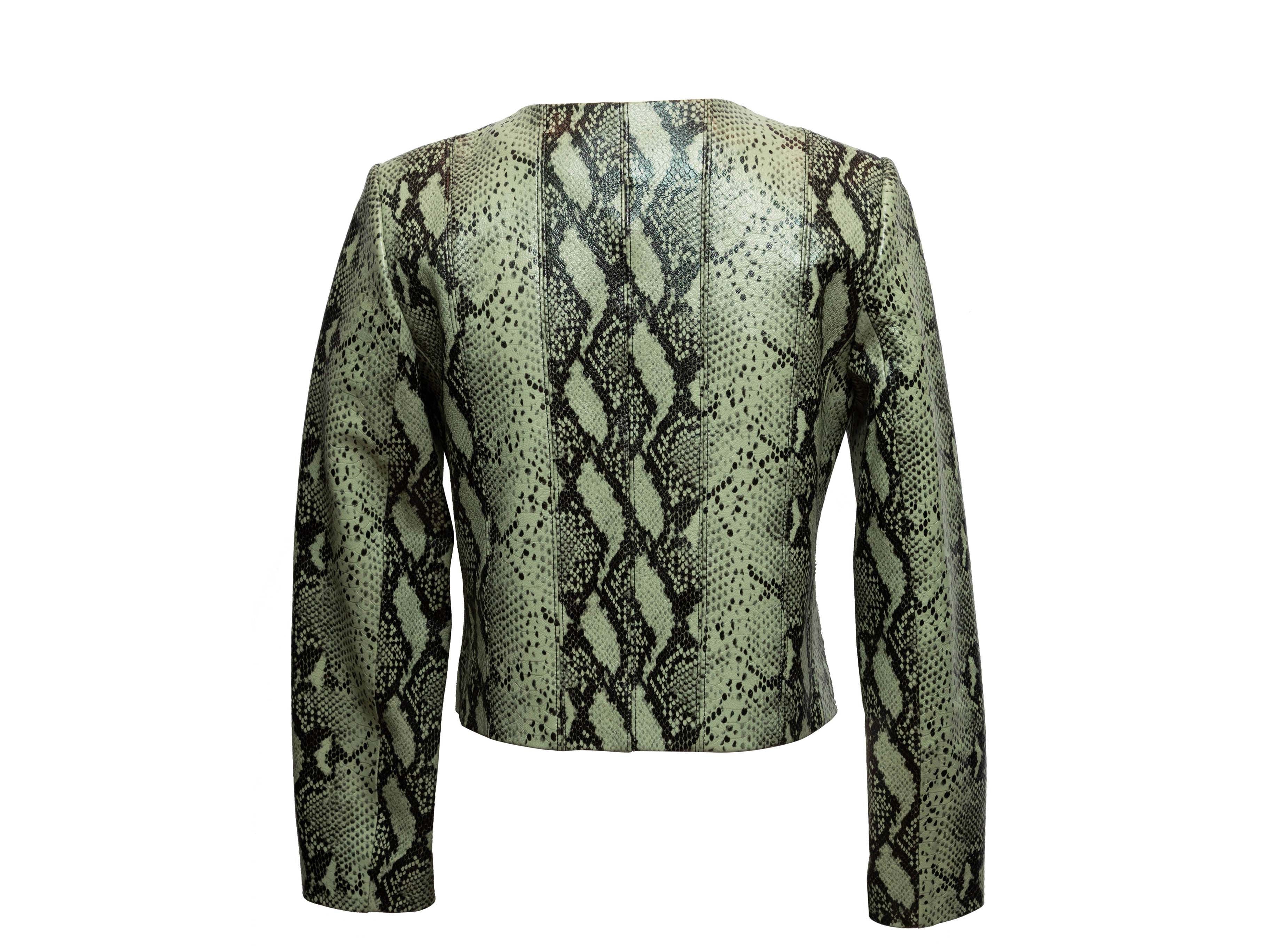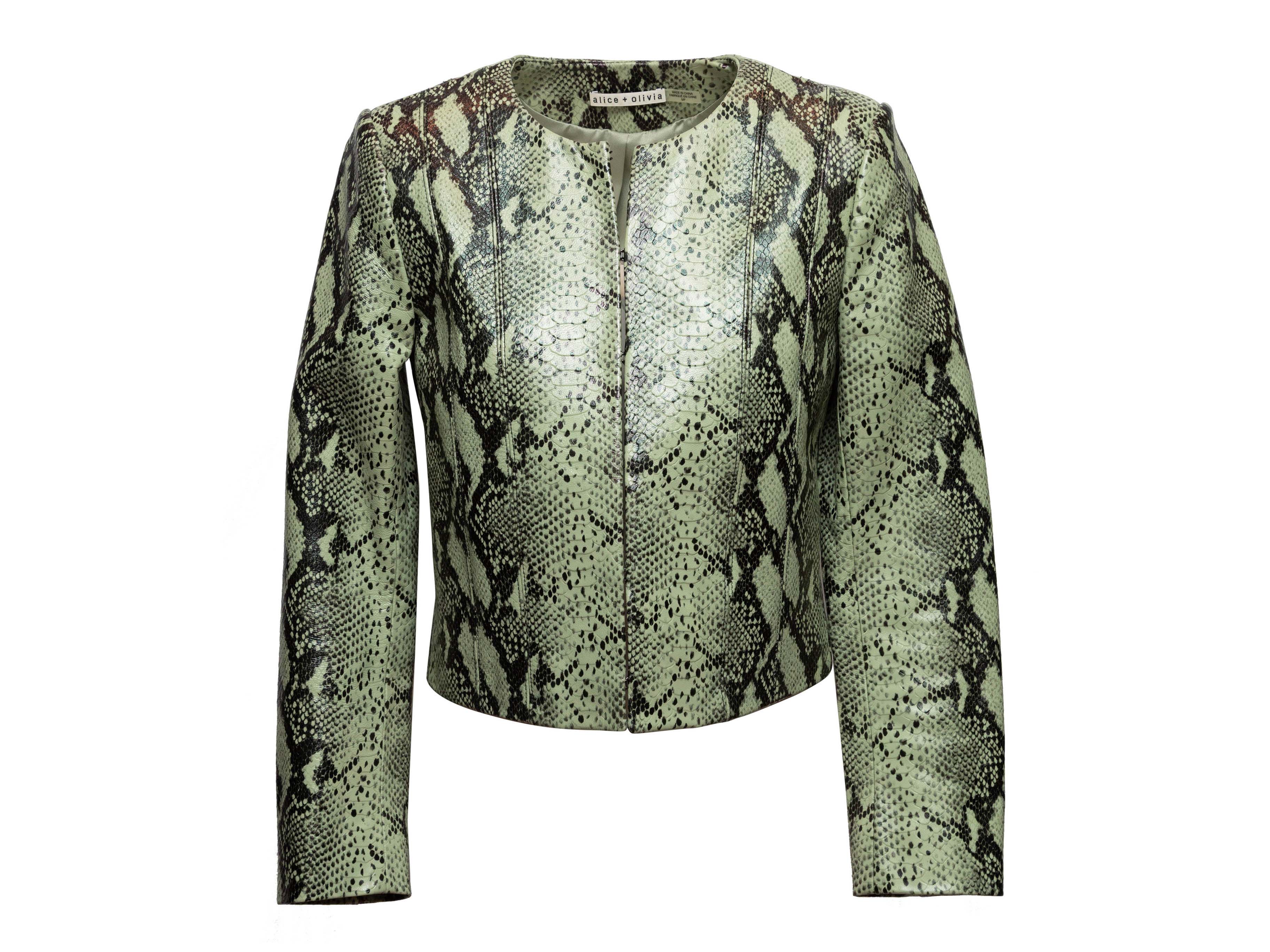 Product Details: Green and black snakeskin printed leather jacket by Alice + Olivia. Crew neck. Hook-and-eye front closures. 32" bust, 14" shoulder width, 24" sleeve length, 19.5" length.