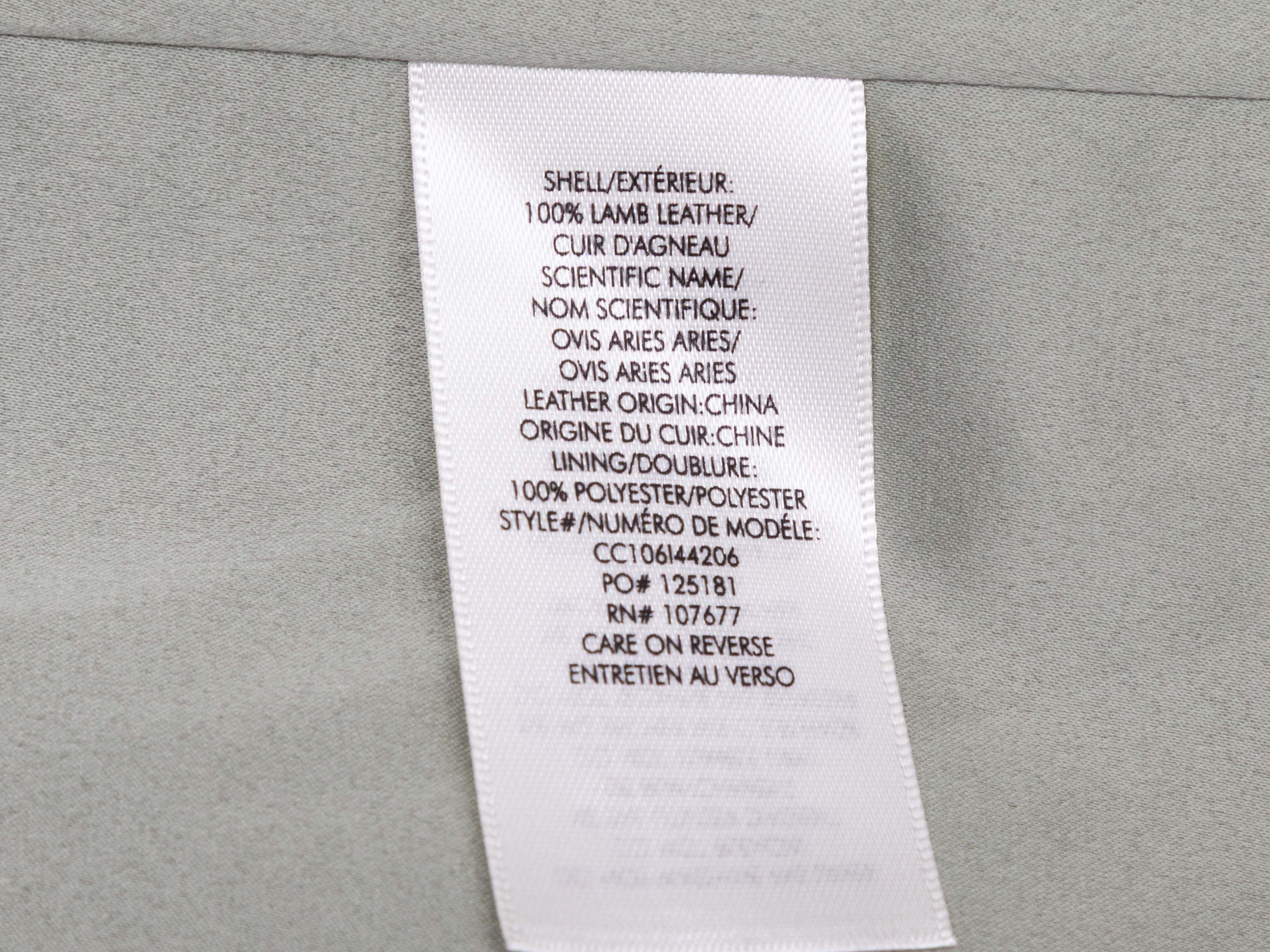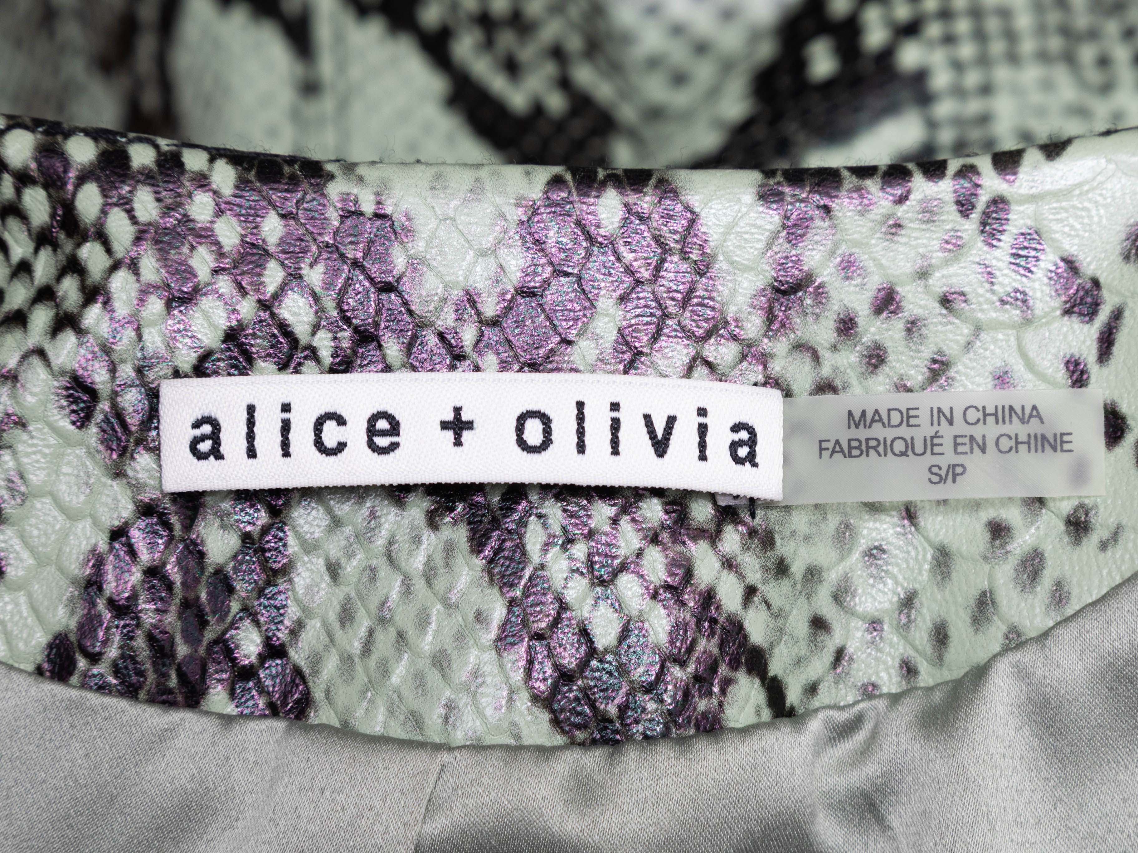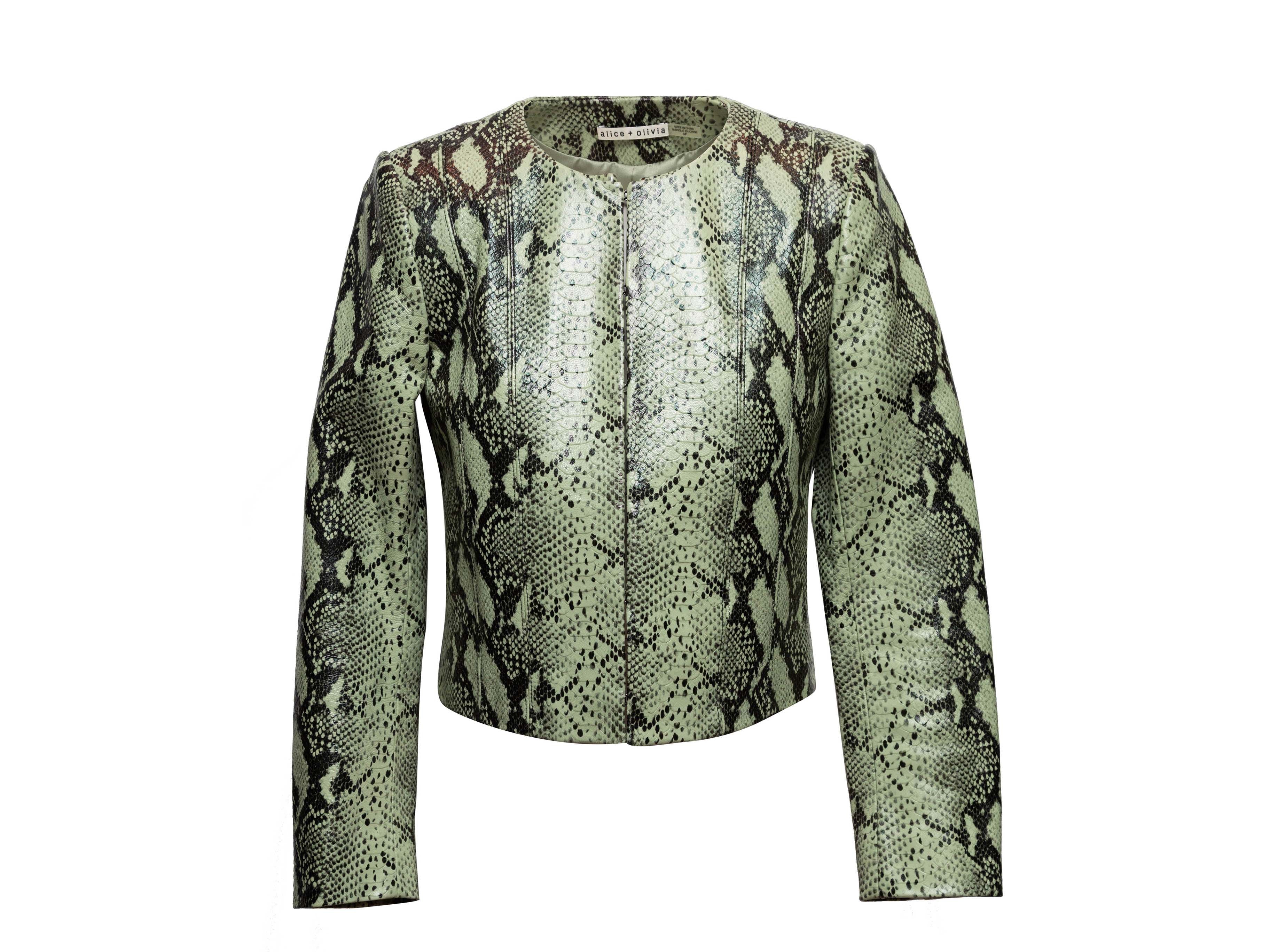 Product Details: Green and black snakeskin printed leather jacket by Alice + Olivia. Crew neck. Hook-and-eye front closures. 32" bust, 14" shoulder width, 24" sleeve length, 19.5" length.
