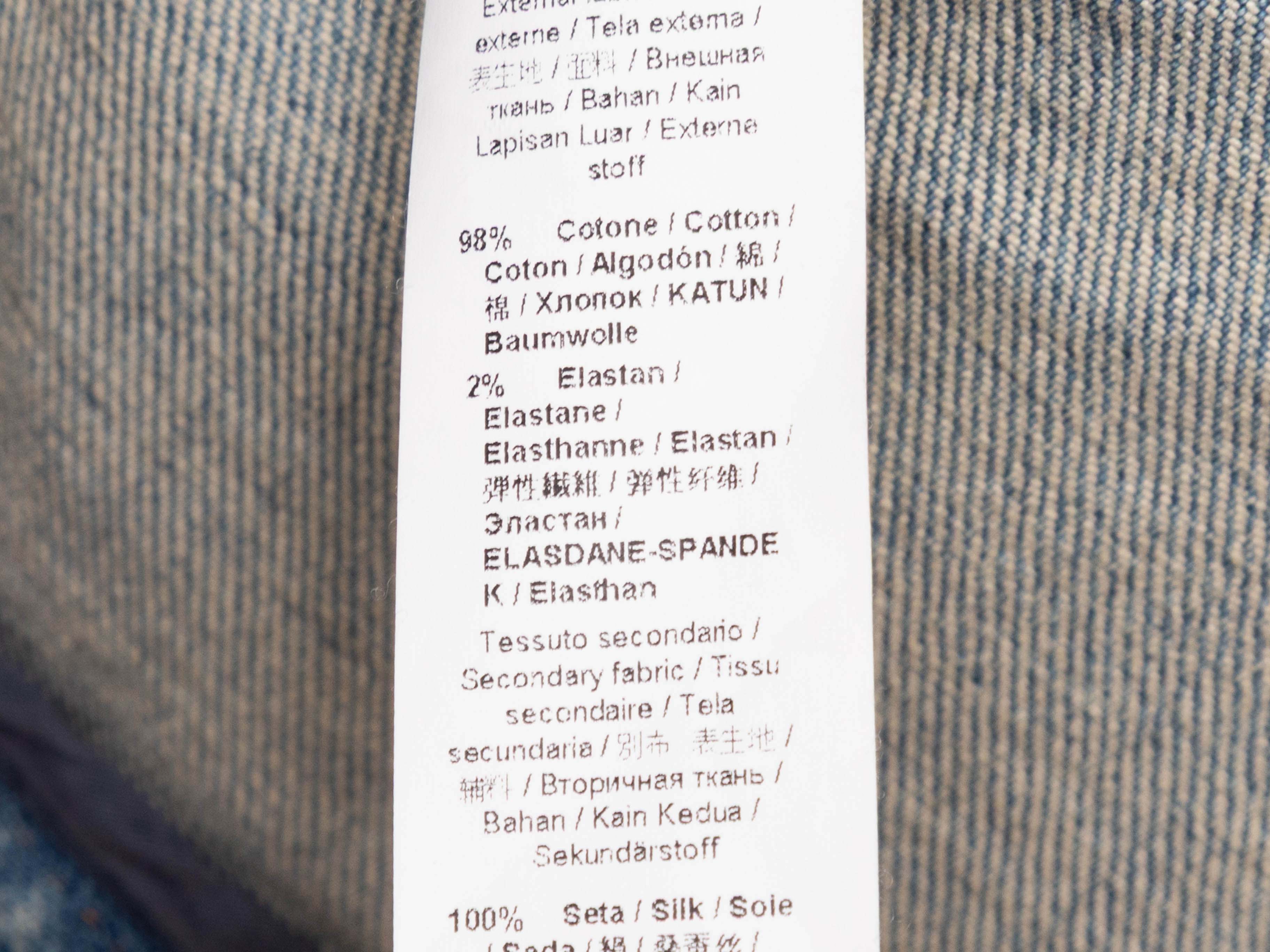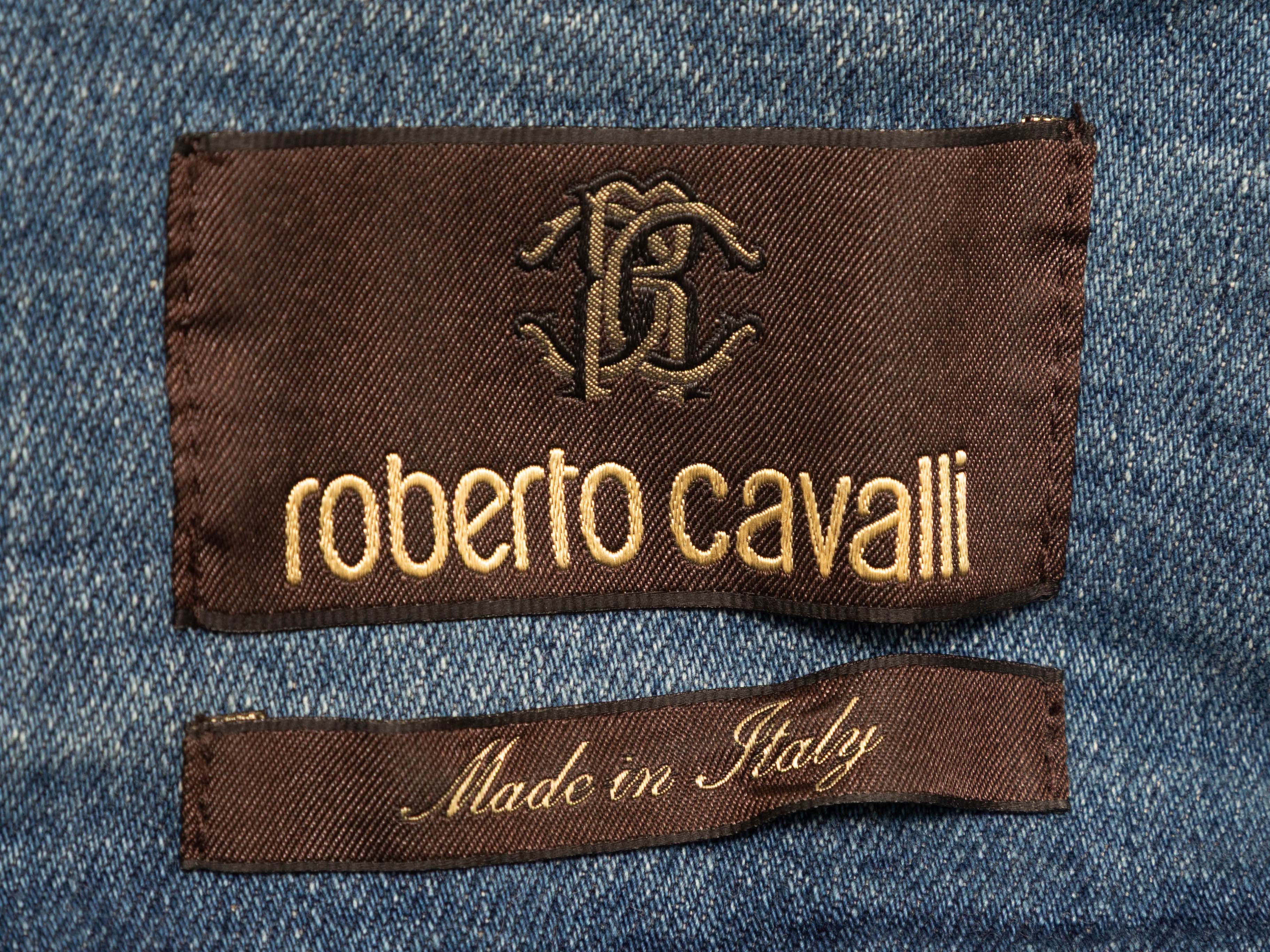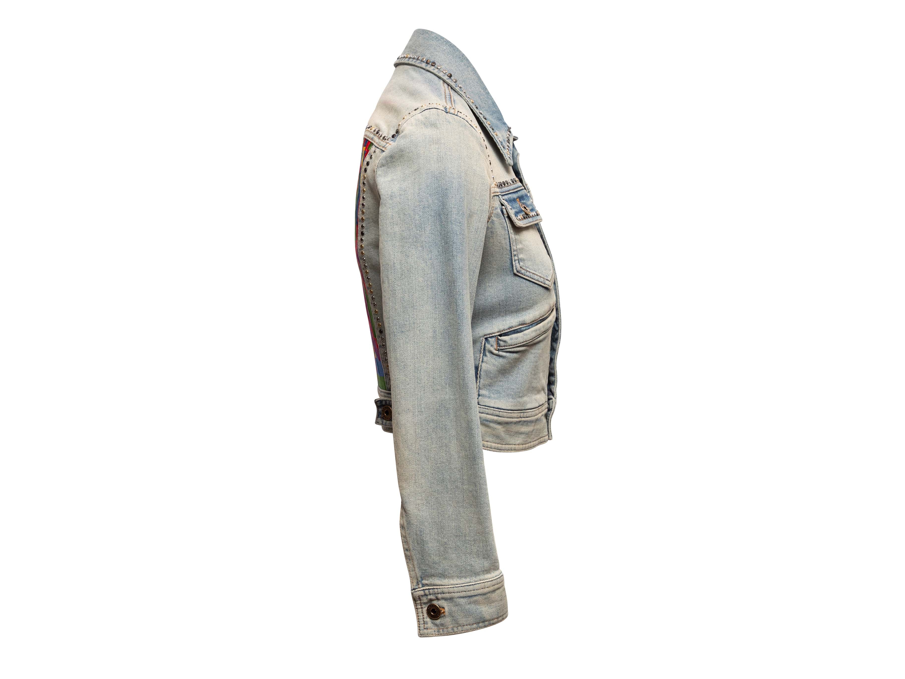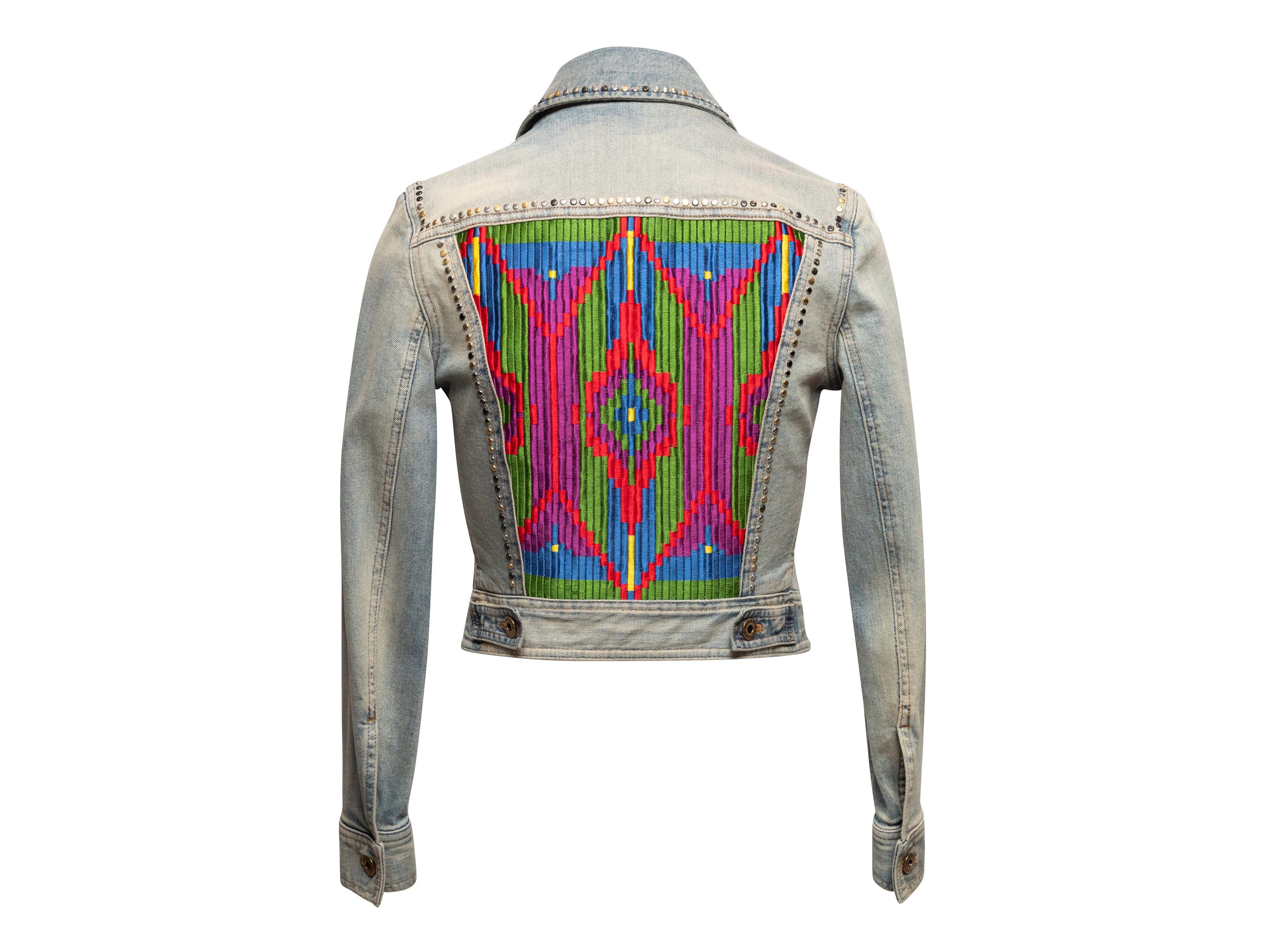 Product Details: Light wash studded denim jacket by Roberto Cavalli. Silver-tone hardware. Pointed collar. Four front pockets. Southwestern woven textile panel at back. 30" bust, 14" shoulder width, 22" sleeve length, 19" length.