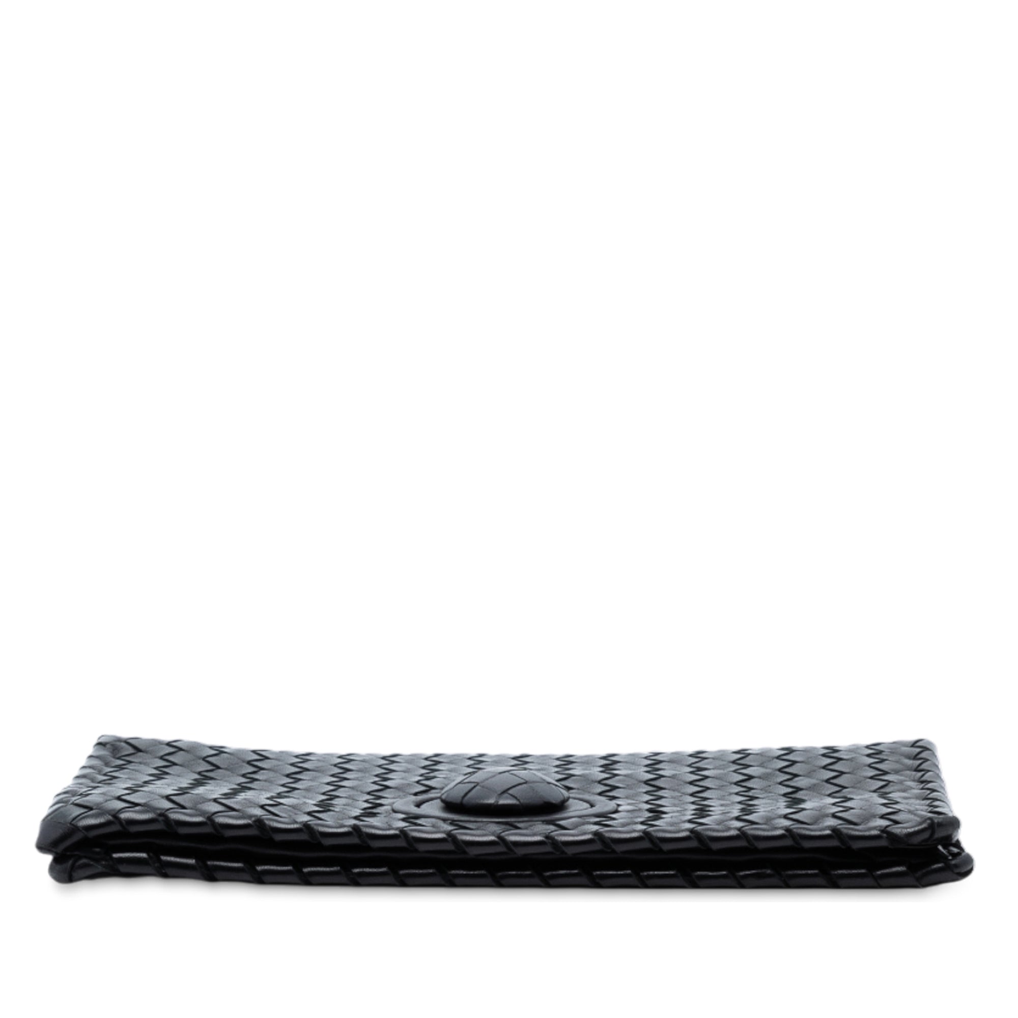 Product Details: Black Bottega Veneta Nappa Intrecciato Turn Lock Clutch. This clutch features a woven nappa leather body, a front flap with a turn lock closure, and an interior zip pocket. 6.1" L x 11.2" W x 0.8" D. Serial number B00629093M.