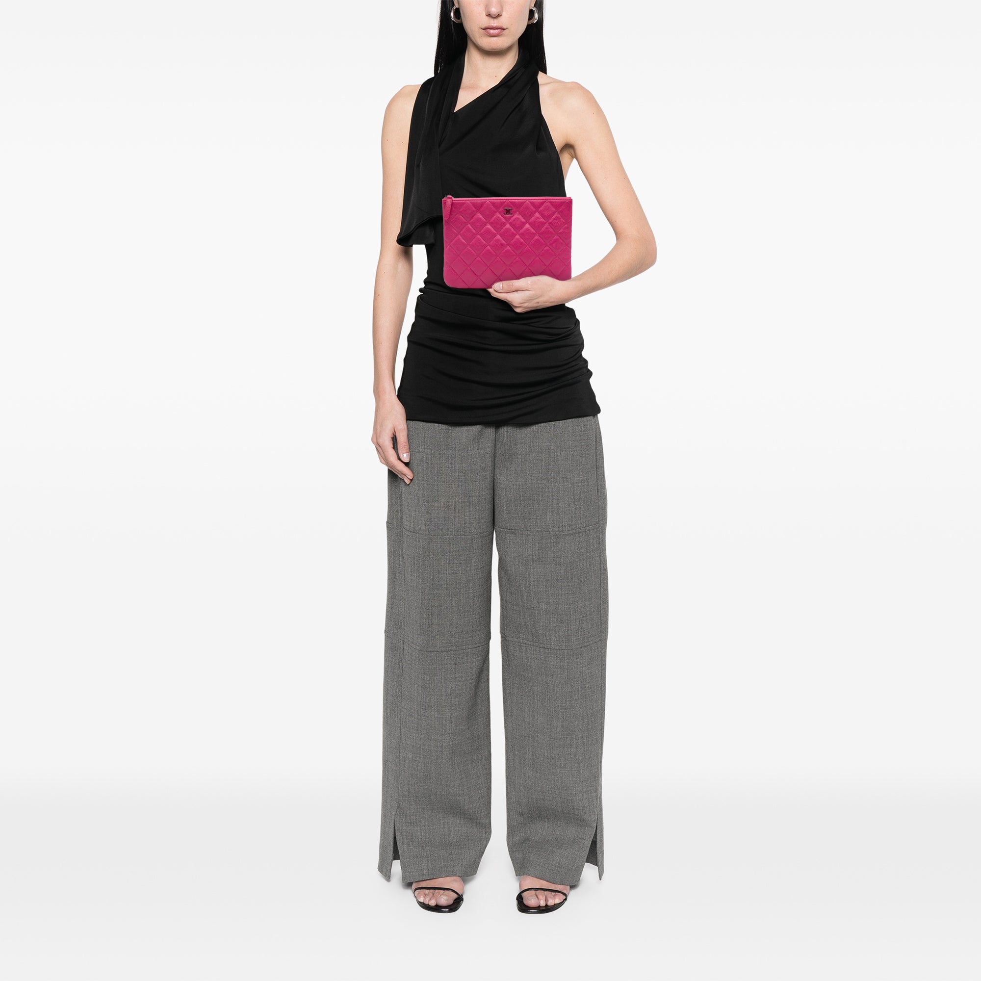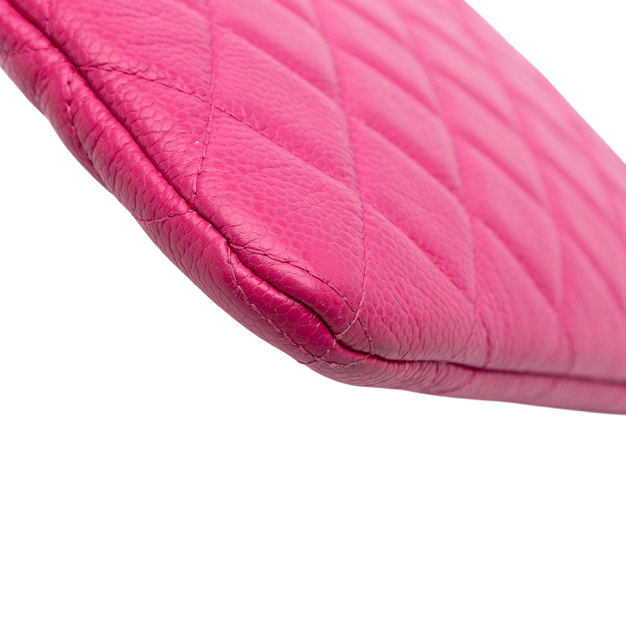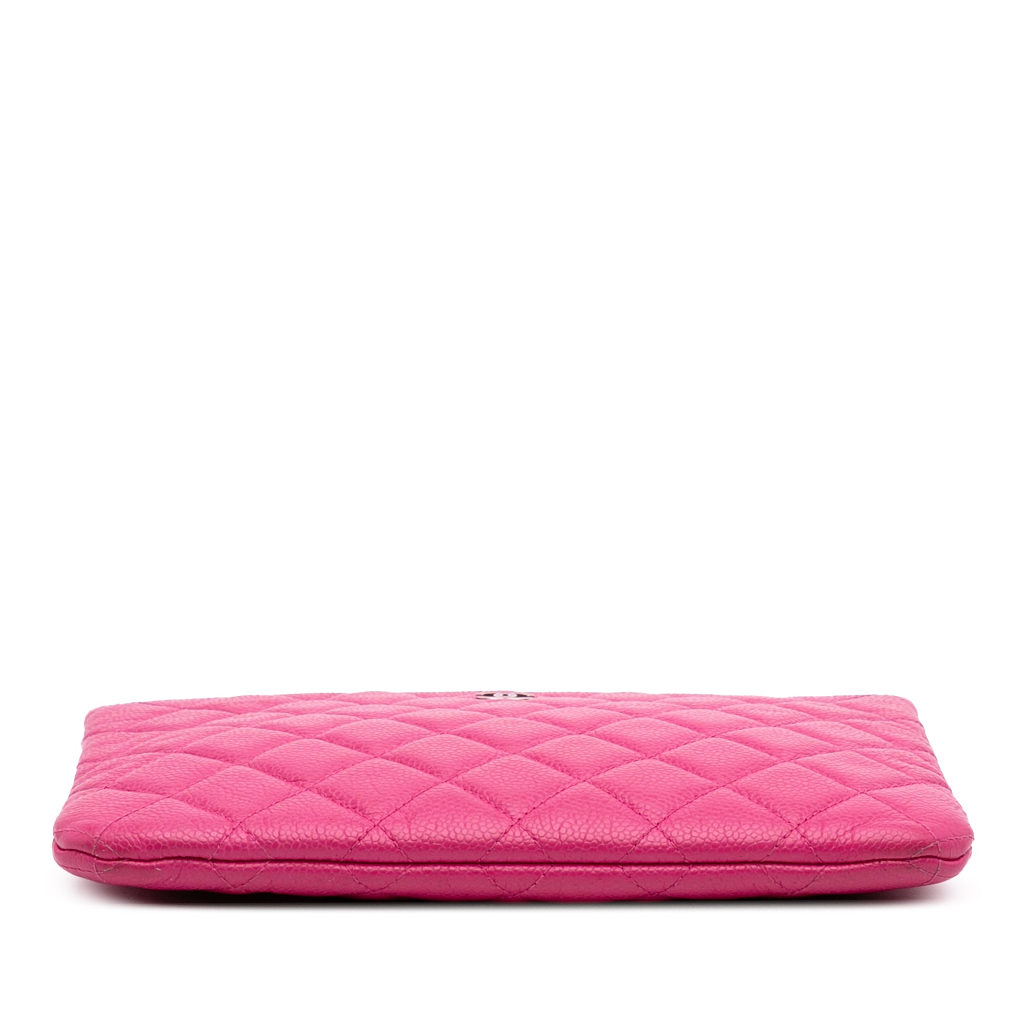 Product Details: Pink Chanel Small Quilted Caviar O Case Clutch. This clutch bag features a quilted caviar leather body and a top zip closure. 6.7" L x 9.4" W x 0.6" D. Serial number 20906430.