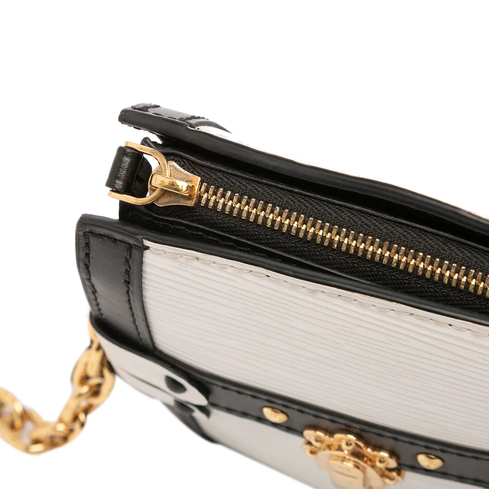 Product Details: White Louis Vuitton Epi Trunk Clutch Crossbody Bag. The Trunk clutch features an epi leather body, a detachable chain link strap with an adjustable leather shoulder guard, a top strap with an S-lock closure, a top zip closure, and an interior slip pocket. 5.9" L x 8.9" W x 1.6" D.