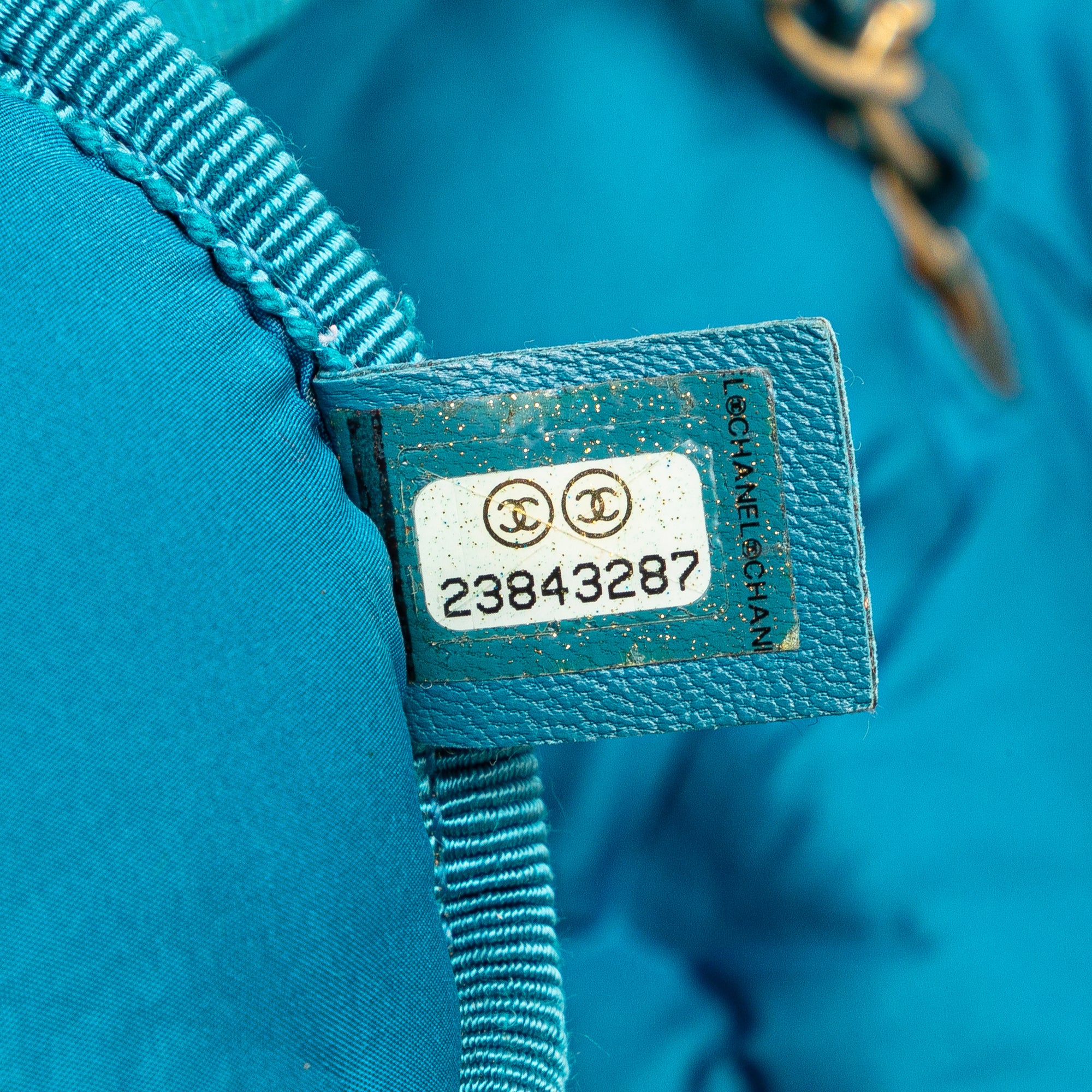 Product Details: Blue Chanel Maxi Tweed Chesterfield Single Flap Crossbody Bag. This crossbody bag features a tweed body, a curb chain strap, a front flap with a twist lock closure, and an interior zip pouch. 9.1" L x 12.6" W x 2.8" D, 9.8" drop. Serial number 23843287.