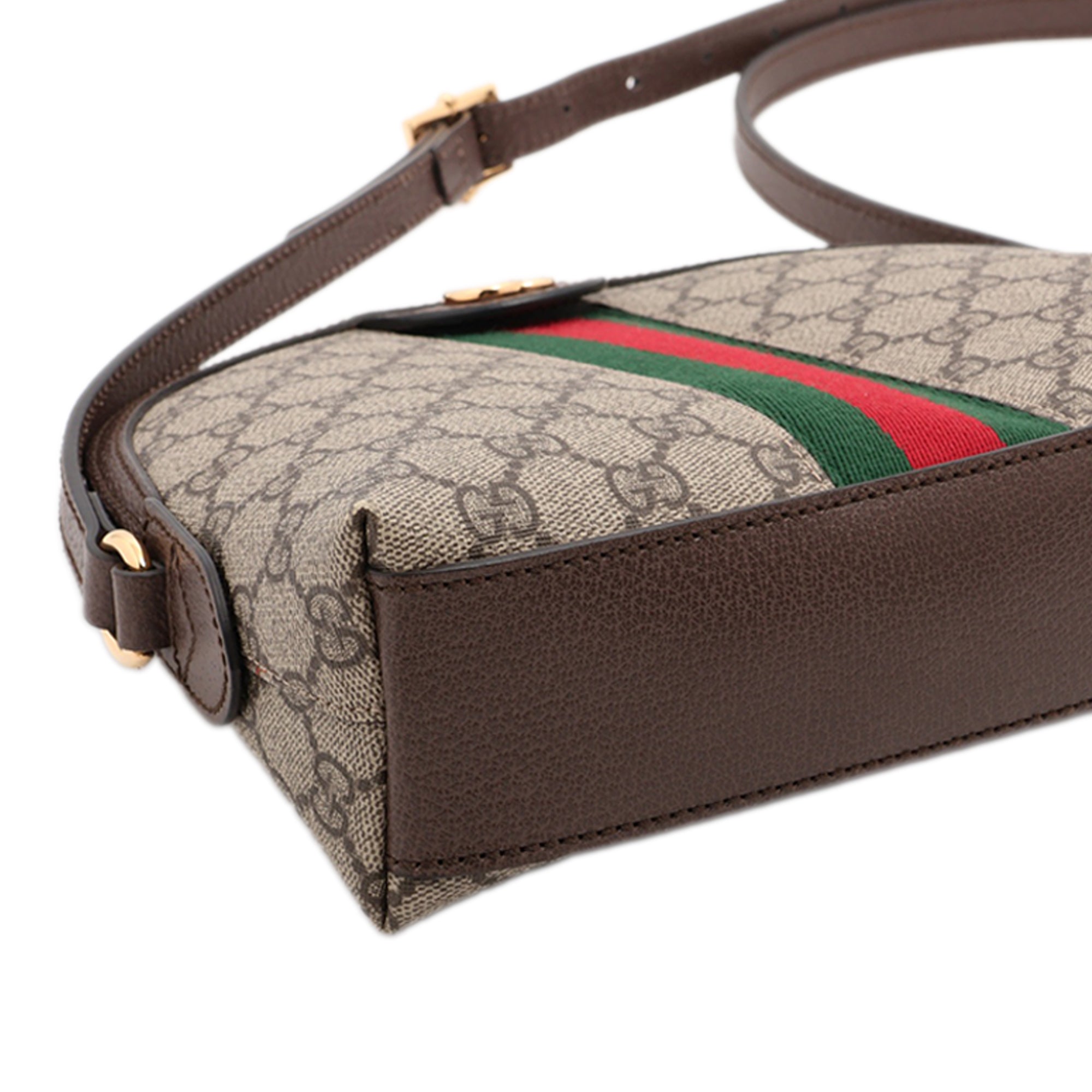 Product Details: Brown Gucci Small GG Supreme Ophidia Dome Crossbody. The Ophidia crossbody bag features a coated canvas body with leather trim and front web detail, a flat leather strap, a top zip closure, and an interior slip pockets. 7.5" L x 8.7" W x 3" D. Serial number 499621.
