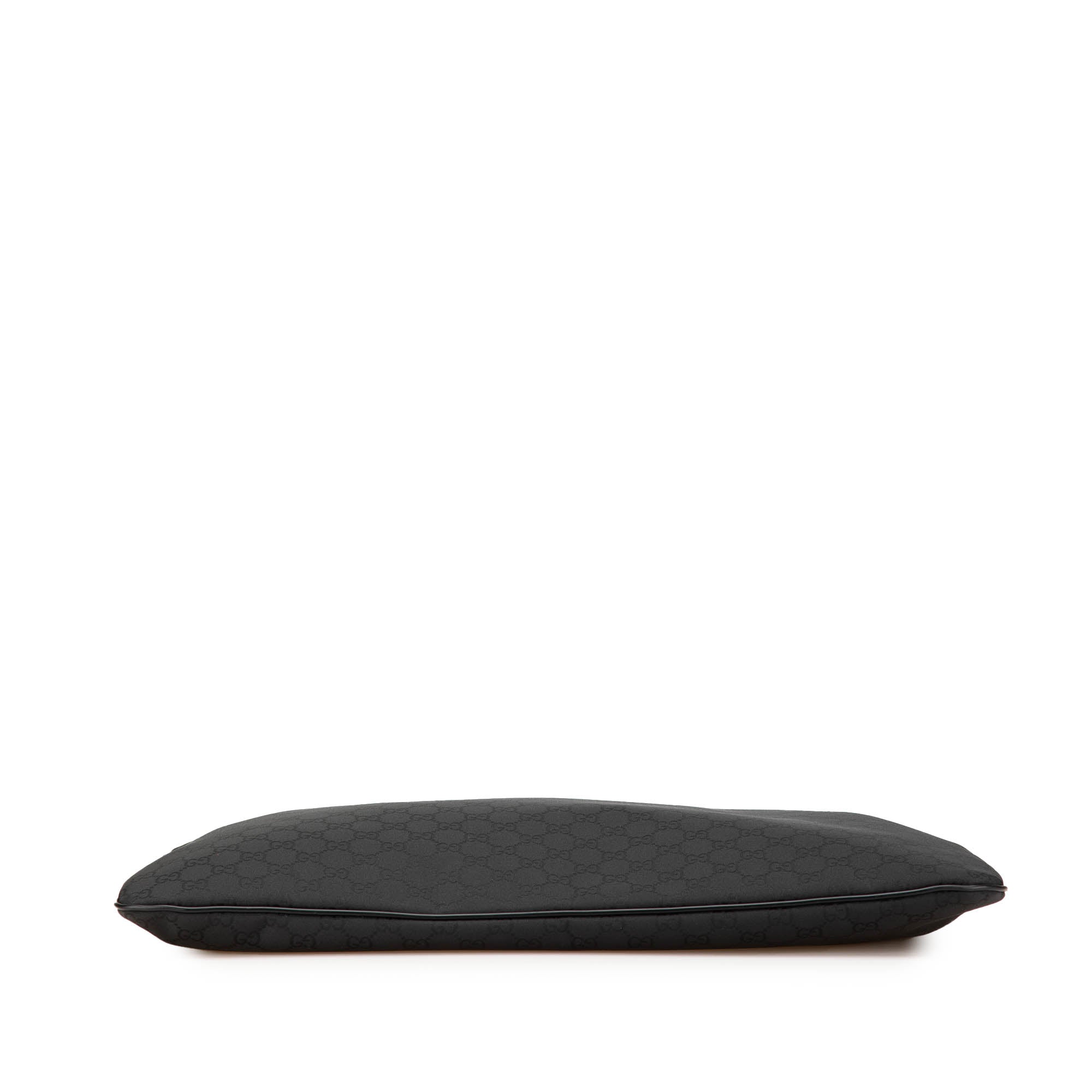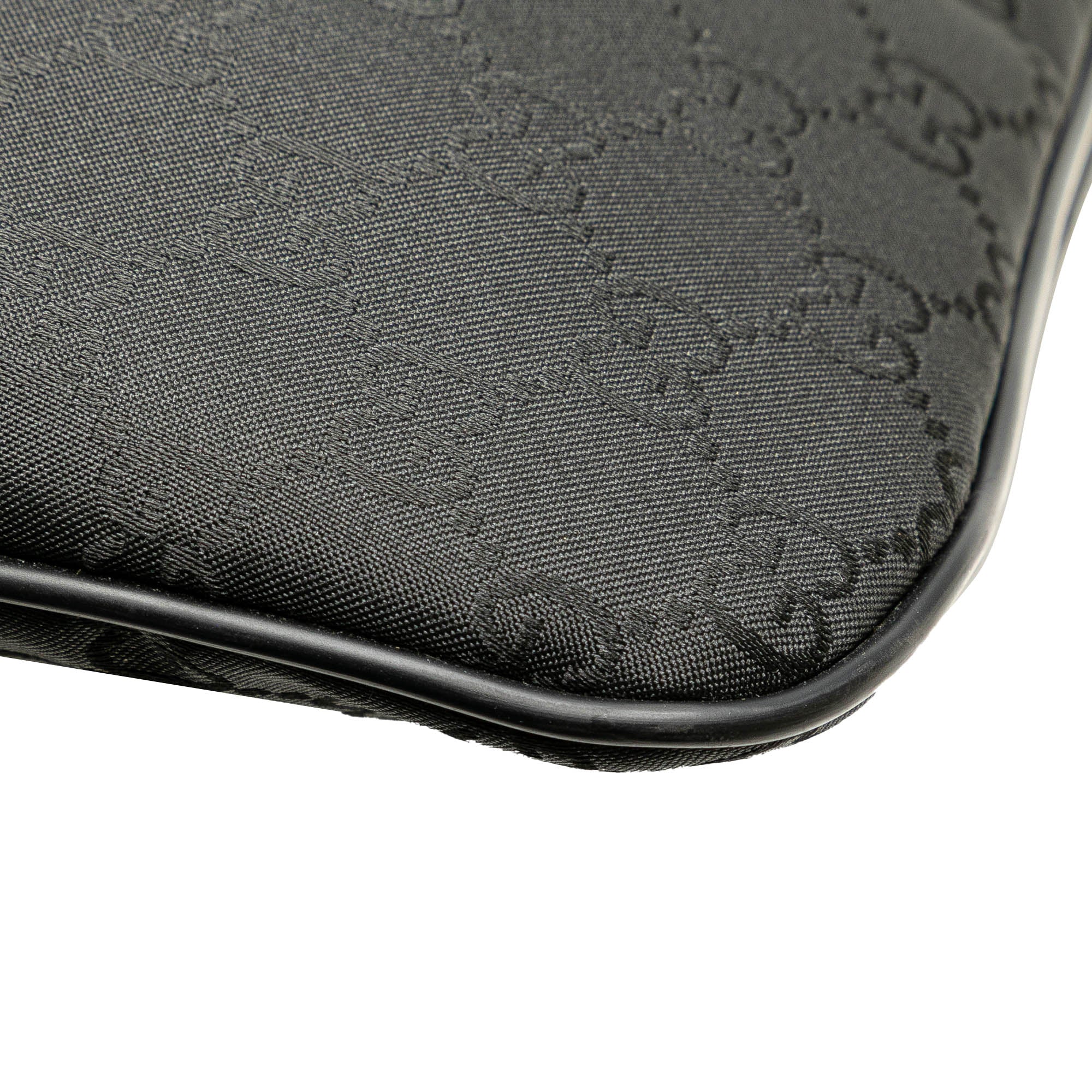 Product Details: Black Gucci GG Nylon Crossbody. This crossbody bag features a nylon body, a flat strap, a top zip closure and an interior zip pocket. 13.8" L x 18.1" W x 0.4" D. Serial number 190628 200047.