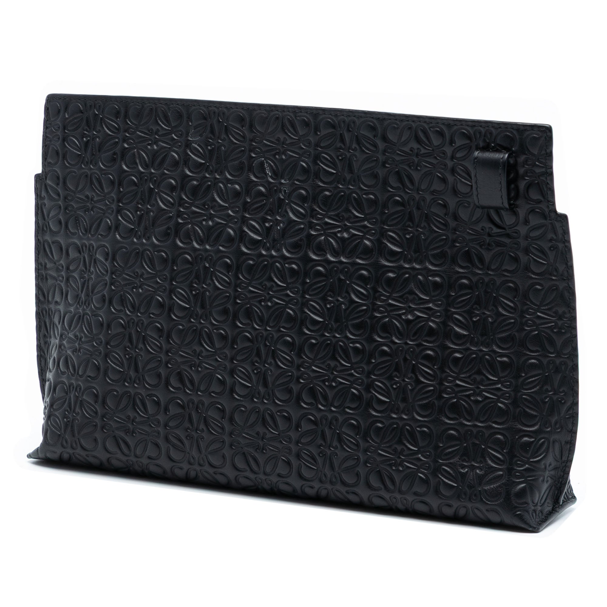 Product Details: Black LOEWE Embossed Anagram Leather Repeat T Clutch. This clutch bag features an embossed leather body, a front zip closure, and an interior slip pocket. 6.3" L x 9.4" W x 2" D. Serial number 061505.