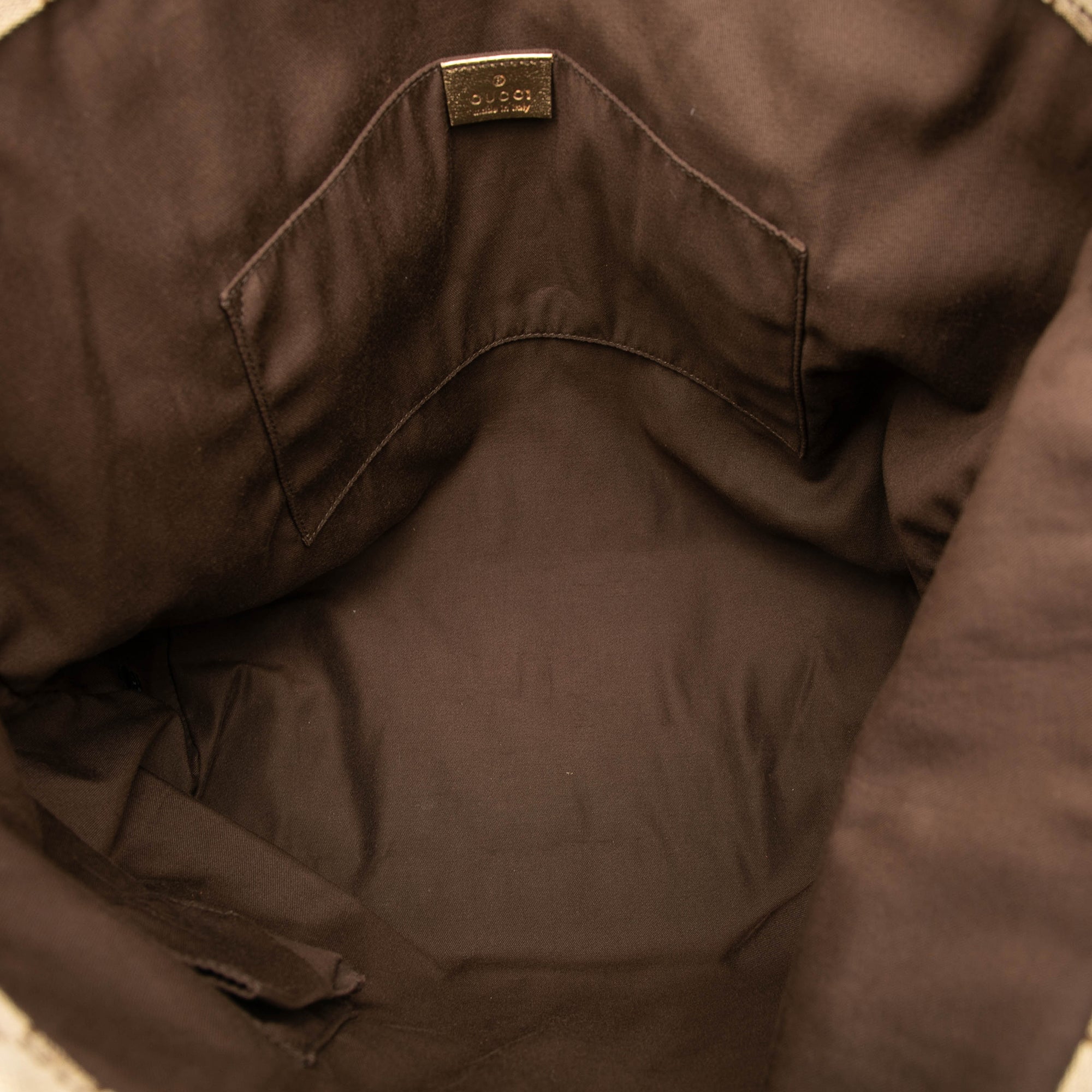 Product Details: Brown Gucci GG Canvas Web Tote. This tote bag features a canvas body, flat straps, an open top, and interior slip pockets. 14.2" L x 13.2" W x 4.9" D, 6.3" drop. Serial number 189669 467891.