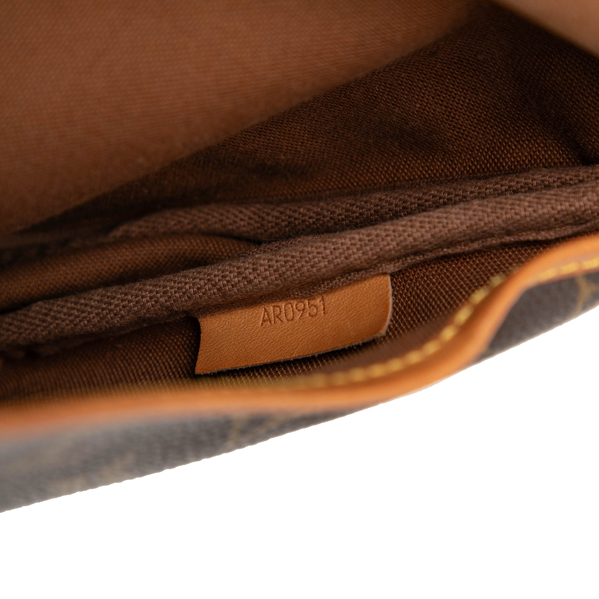 Product Details: Brown Louis Vuitton Monogram Saumur 30 Crossbody Bag. The Saumur 30 features a monogram canvas body with vachetta leather trim, a flat adjustable vachetta leather shoulder strap, double open compartments with front flaps and belt buckle closures, and an interior slip pocket. 8.7" L x 11.2" W x 4.7" D. Serial number AR0951.