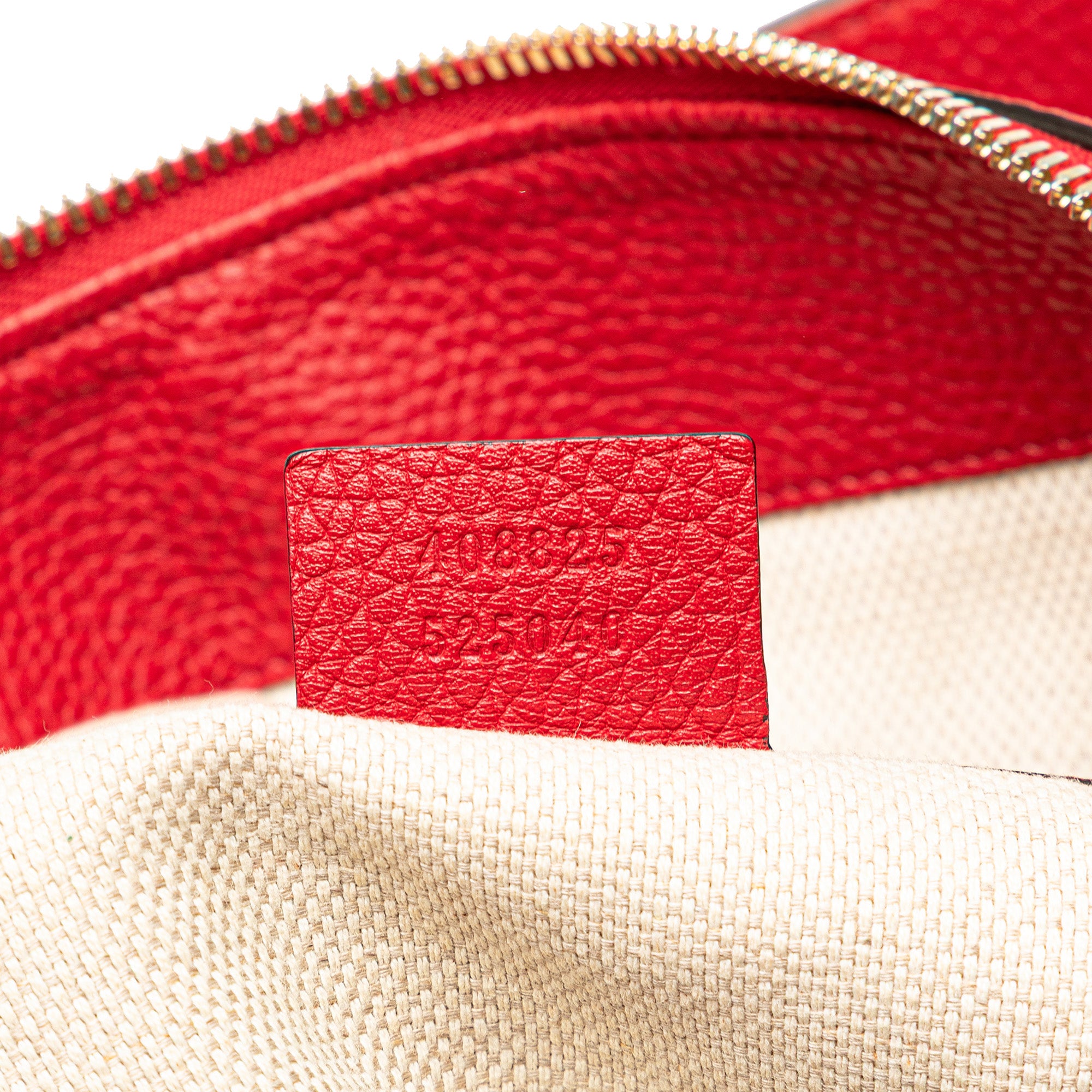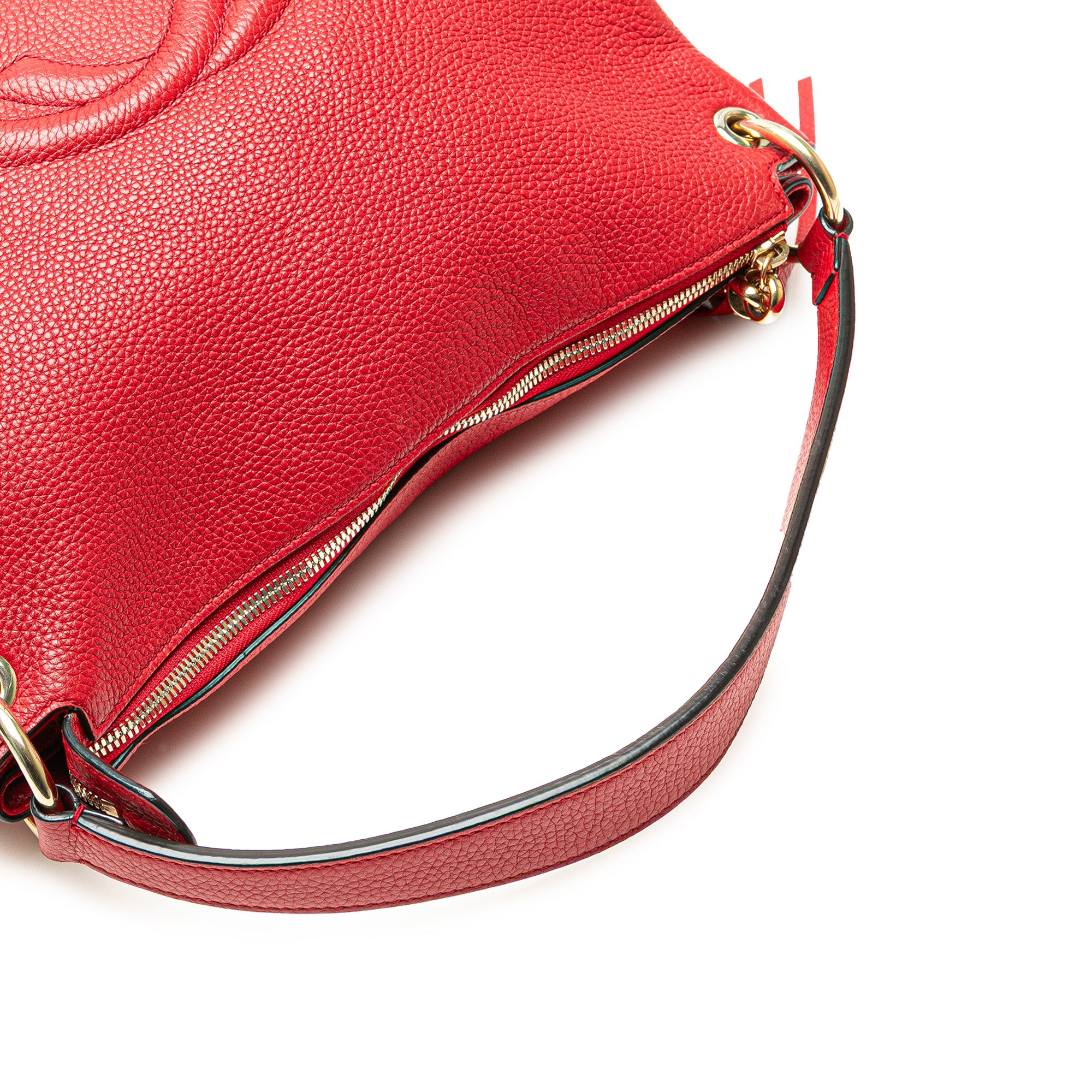 Product Details: Red Gucci Large Pebbled Calfskin Soho Convertible Hobo Satchel. The Soho features a leather body, a flat leather handle, a top zip closure with tassel details, and interior zip and slip pockets. 11.6" L x 13.4" W x 5.5" D. Serial number 408825 525040.