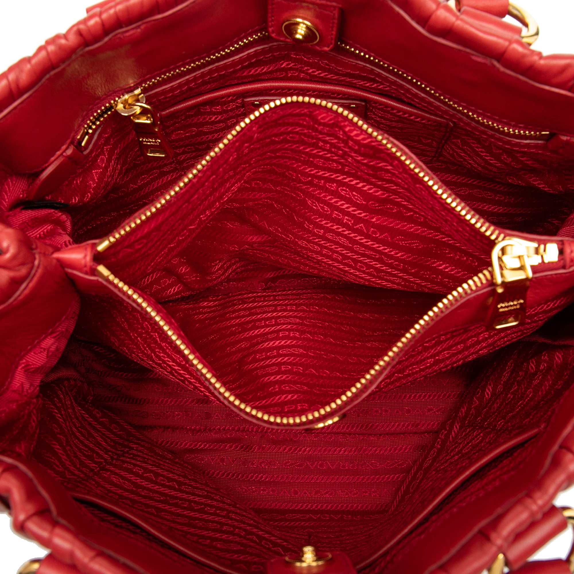 Product Details: Red Prada Nappa Gaufre Tote. This tote features a gathered lambskin leather body, rolled leather handles, an open top with snap button closure, an interior zip compartment, and interior zip and slip pockets. 10.6" L x 13.4" W x 5.1" D, 5.1" drop.