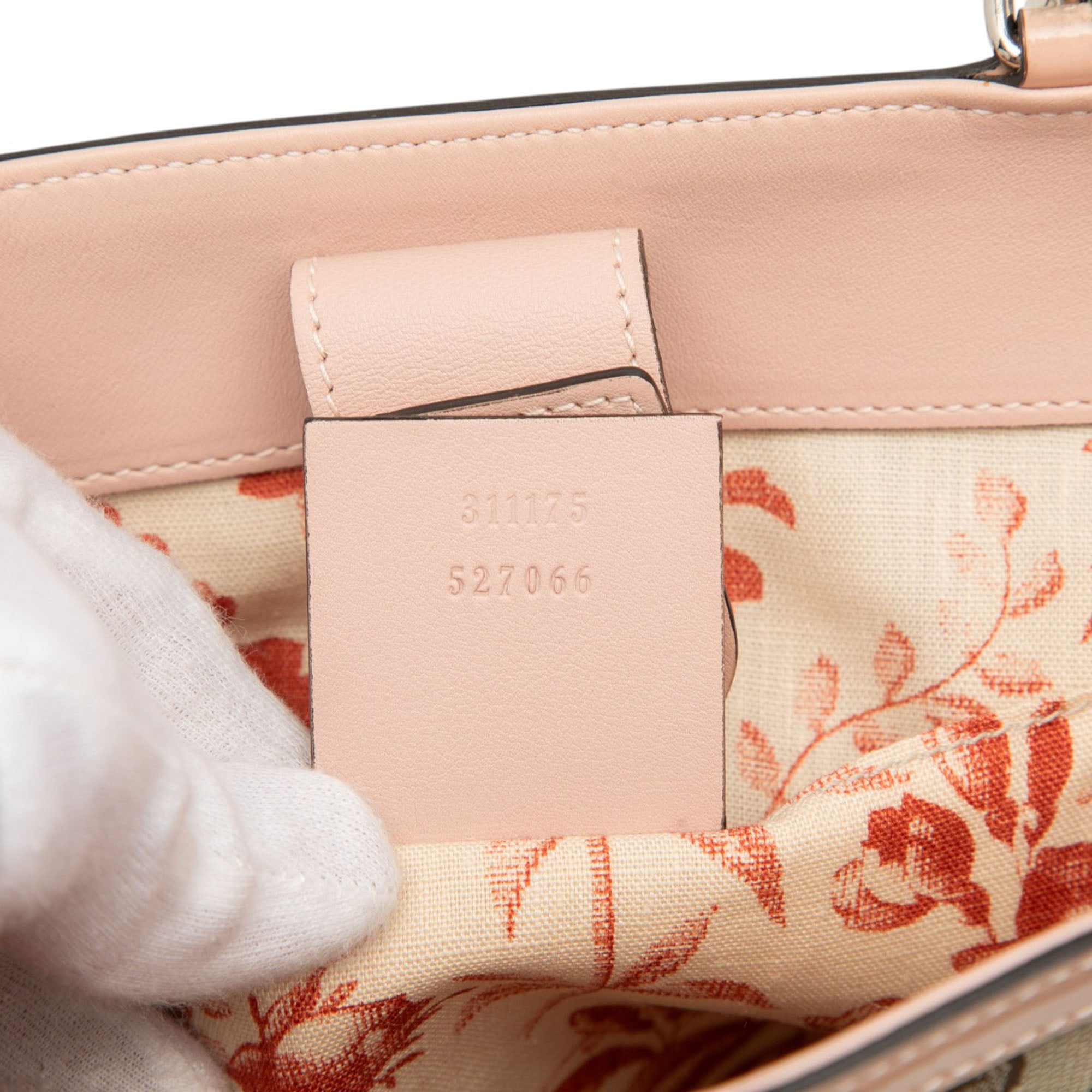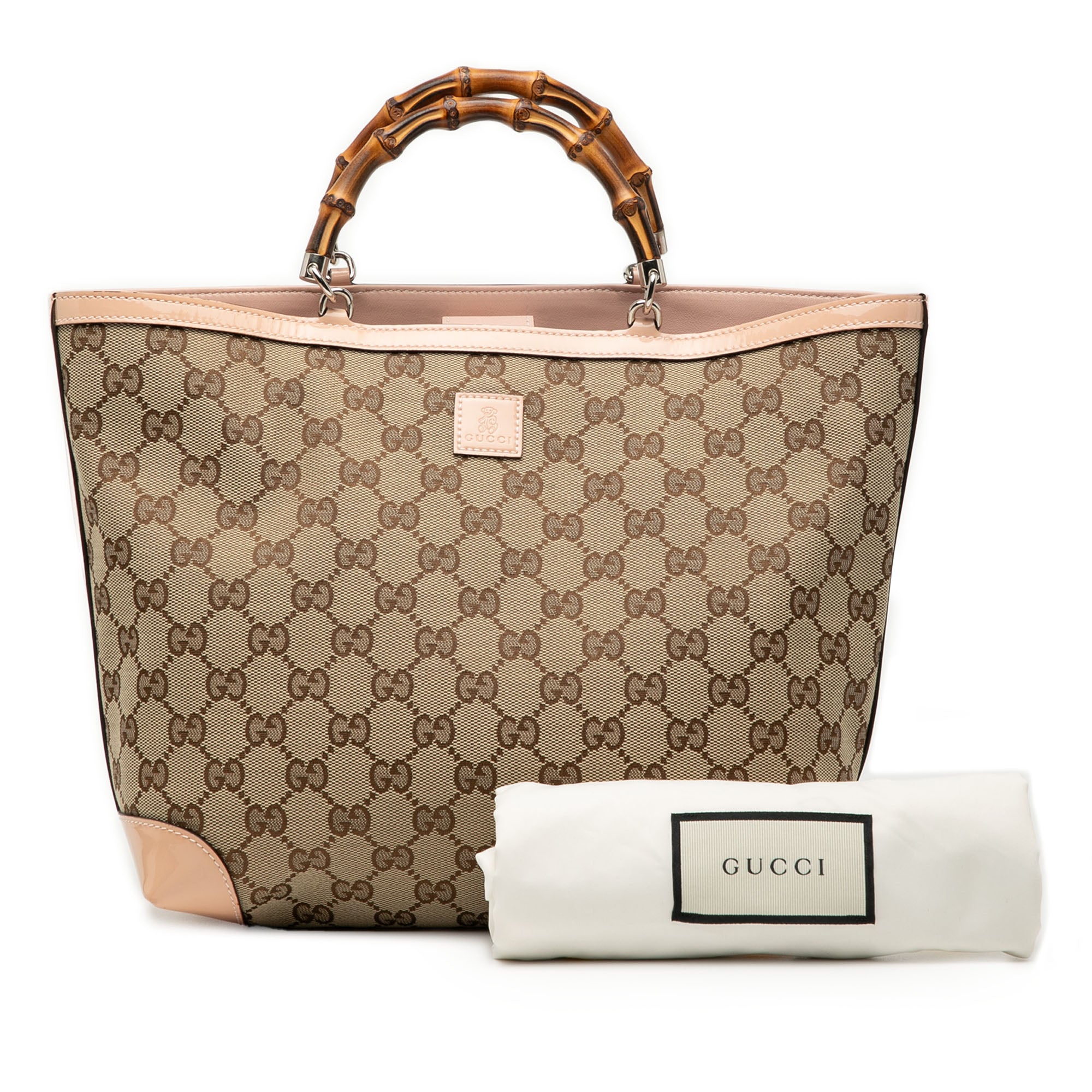 Product Details: Brown Gucci GG Canvas Bamboo Childrens Tote. This tote bag features a canvas body with patent leather trim, bamboo top handles, an open top, and an interior slip pocket. 8.7" L x 8.7" W x 4.7" D, 3.1" drop. Serial number 311175 527066.