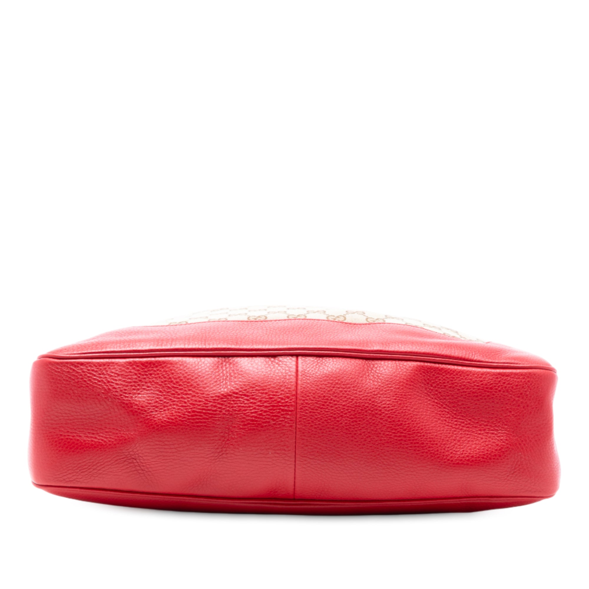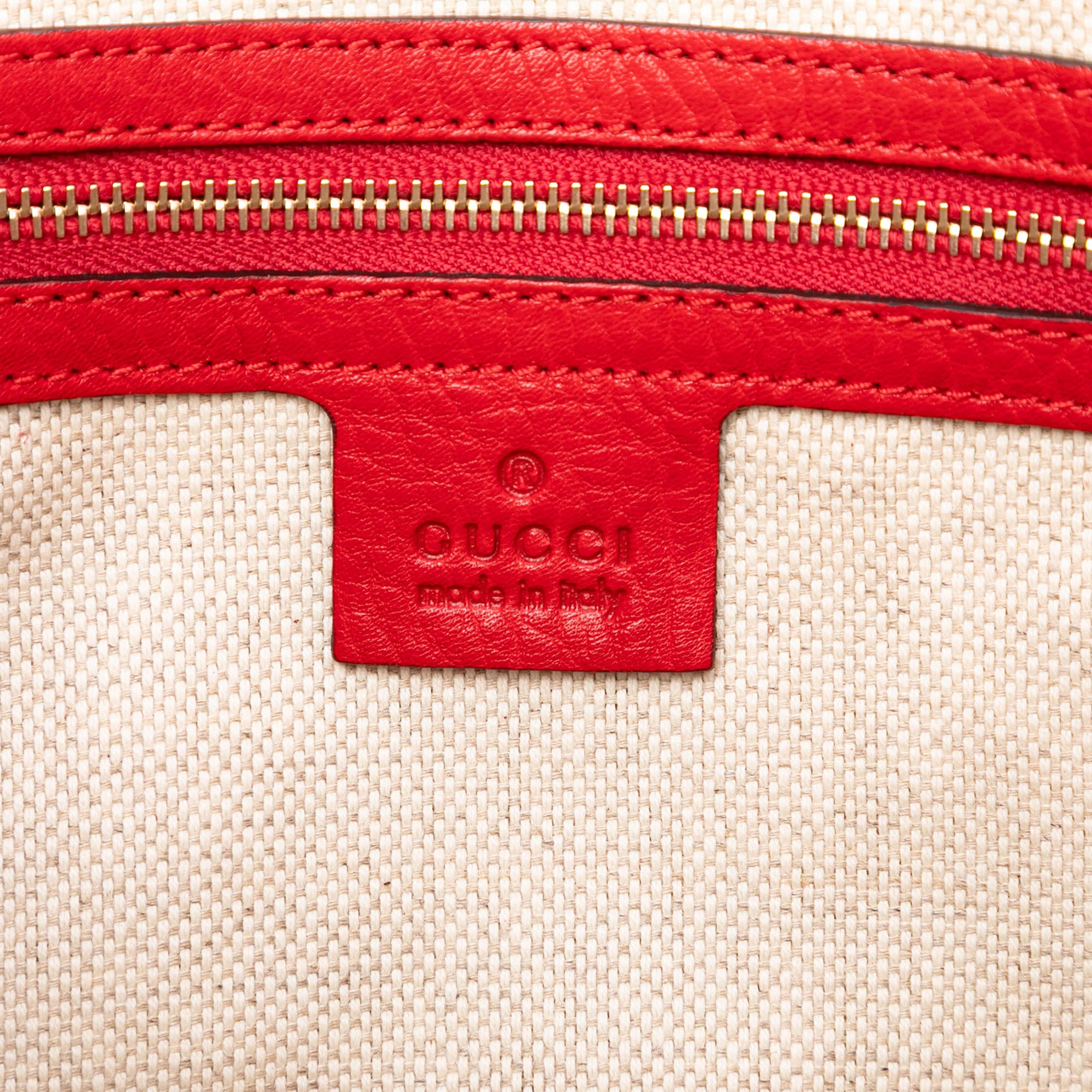 Product Details: Brown Gucci GG Canvas Bamboo Diana Satchel. The Diana satchel features a canvas body with leather trim, a bamboo top handle, a detachable flat leather strap, an open top, and interior zip and slip pockets. 13.2" L x 15.2" W x 4.3" D, 5.1" drop. Serial number 282315 520981.