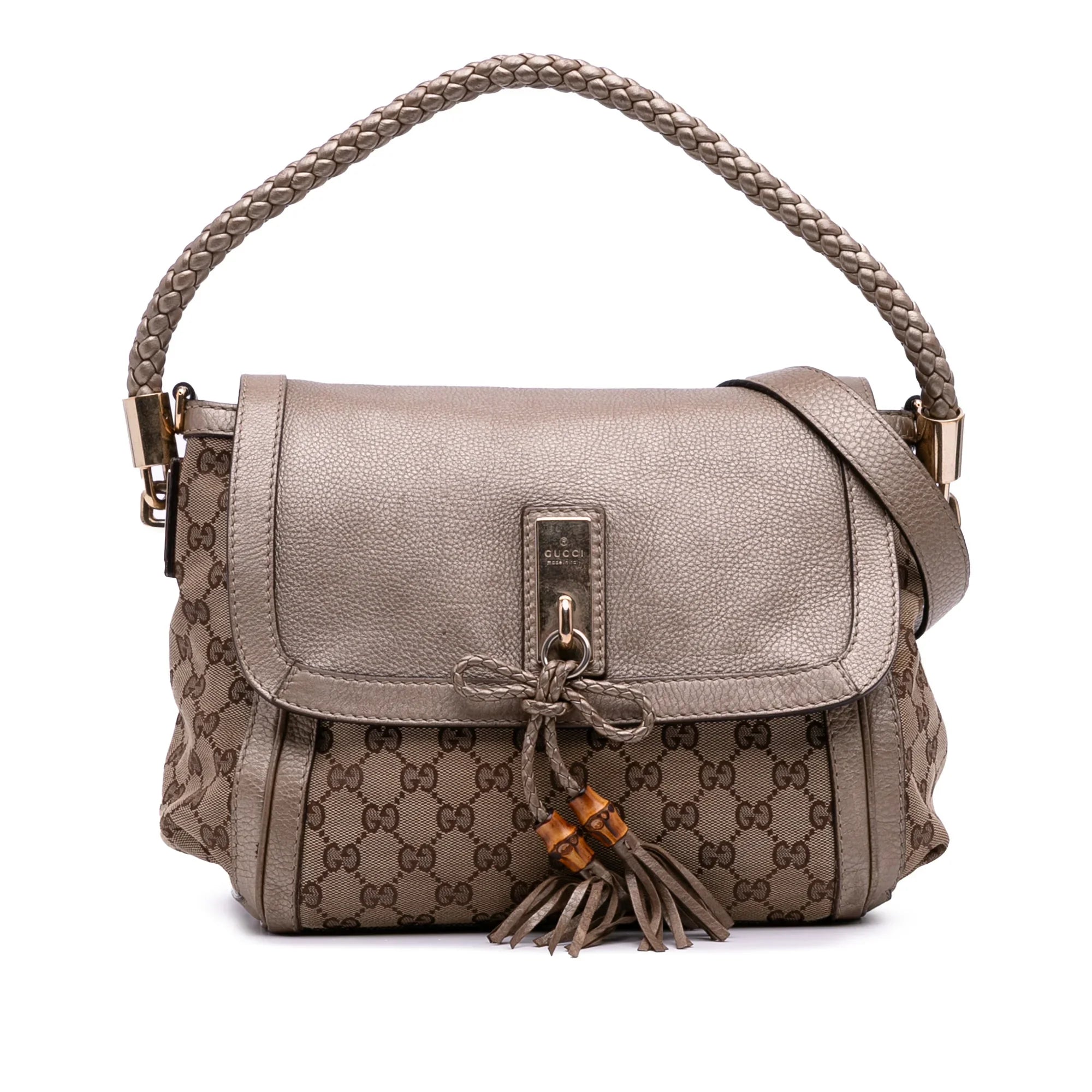 Product Details: Brown Gucci GG Canvas Bella Flap Satchel. The Bella satchel features a canvas body with leather trim, a braided leather handle, a detachable flat leather shoulder strap, a top flap with magnetic snap button closure, and interior zip and slip pockets. 9.4" L x 13.8" W x 5.1" D, 4.7" drop. Serial number 282301 001998.