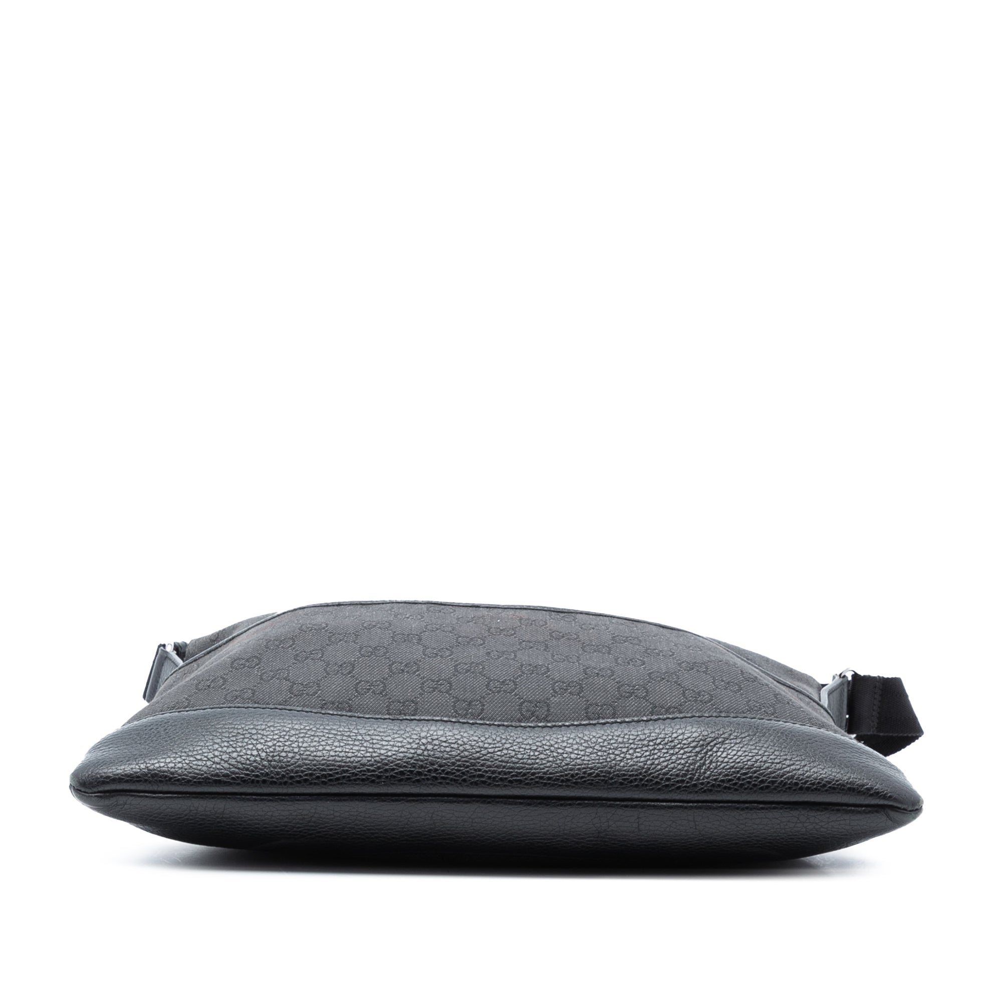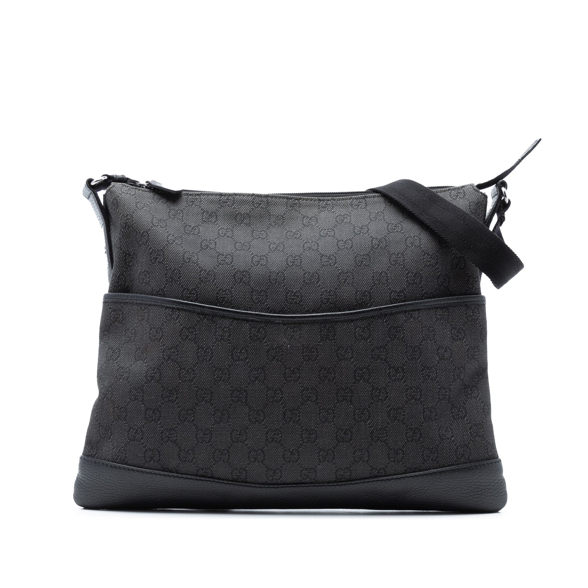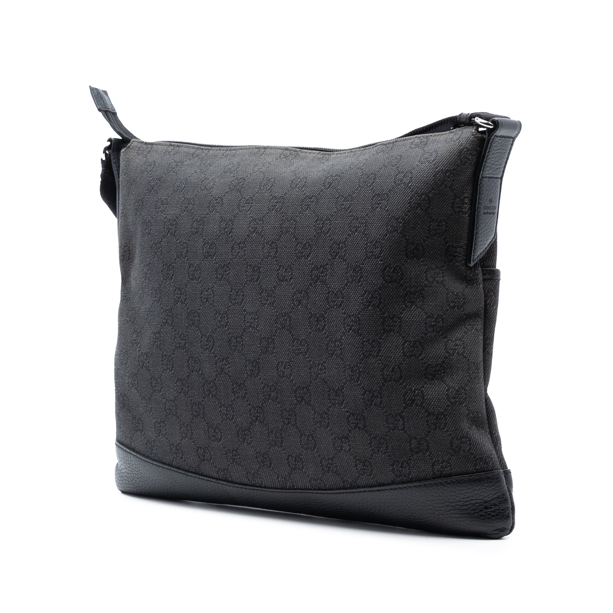 Product Details: Gray Gucci GG Denim Crossbody. This crossbody bag features a denim body with leather trim, an adjustable flat strap, a top zip closure, an exterior front slip pocket, and interior zip and slip pockets. The front, back, side and corners were repainted. 12.2" L x 14.2" W x 0.4" D. Serial number 374411 486628.