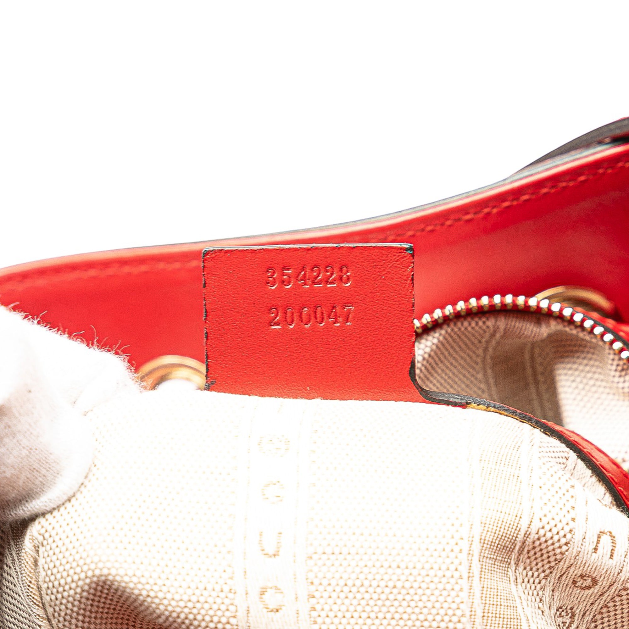Product Details: Red Gucci Medium Diamante Calfskin Studded Bright Bucket Bag. This bucket bag features a calf leather body with stud details, an adjustable flat leather strap, an open top with drawstring closure, and interior zip and slip pockets. 11" L x 9.3" W x 6.1" D. Serial number 354228 200047.