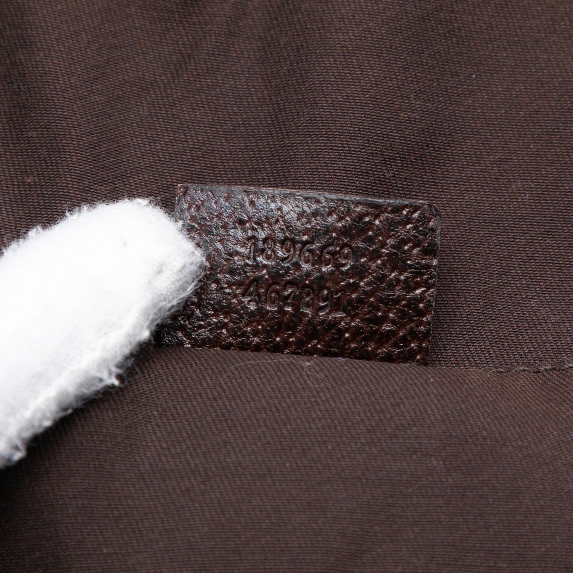 Product Details: Tan Gucci GG Canvas Tote. This tote bag features a canvas body with leather trim, flat canvas straps, an open top, and interior slip pockets. 14.6" L x 13.4" W x 5.5" D, 7.1" drop. Serial number 189669 467891.