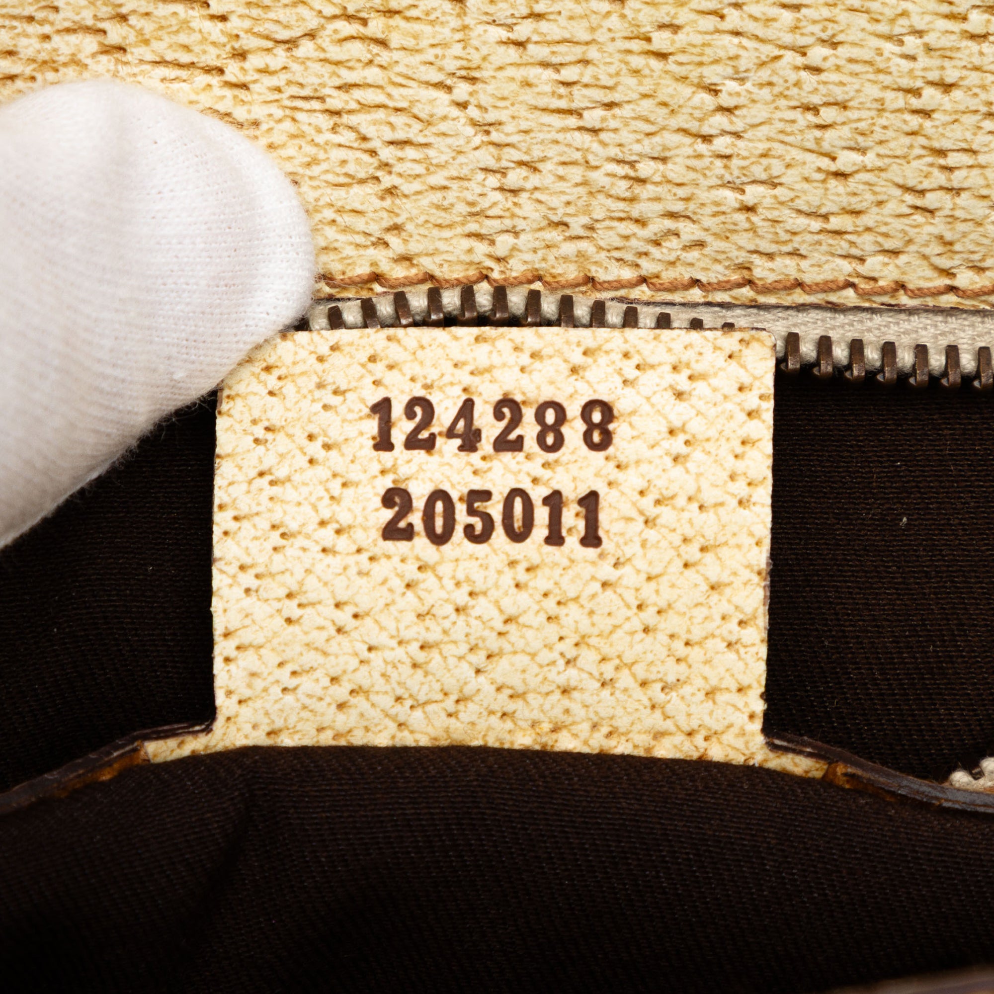 Product Details: Tan Gucci GG Canvas Turnlock Shoulder Bag. This shoulder features a canvas body with leather trim and panels, an adjustable flat strap, a top flap with turnlock closure, and an interior zip pocket. 7.5" L x 10.4" W x 3.1" D. Serial number 124288 205011.