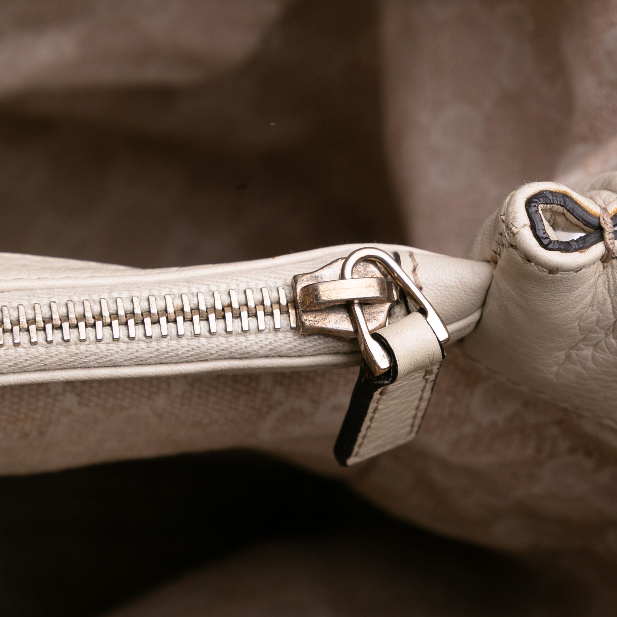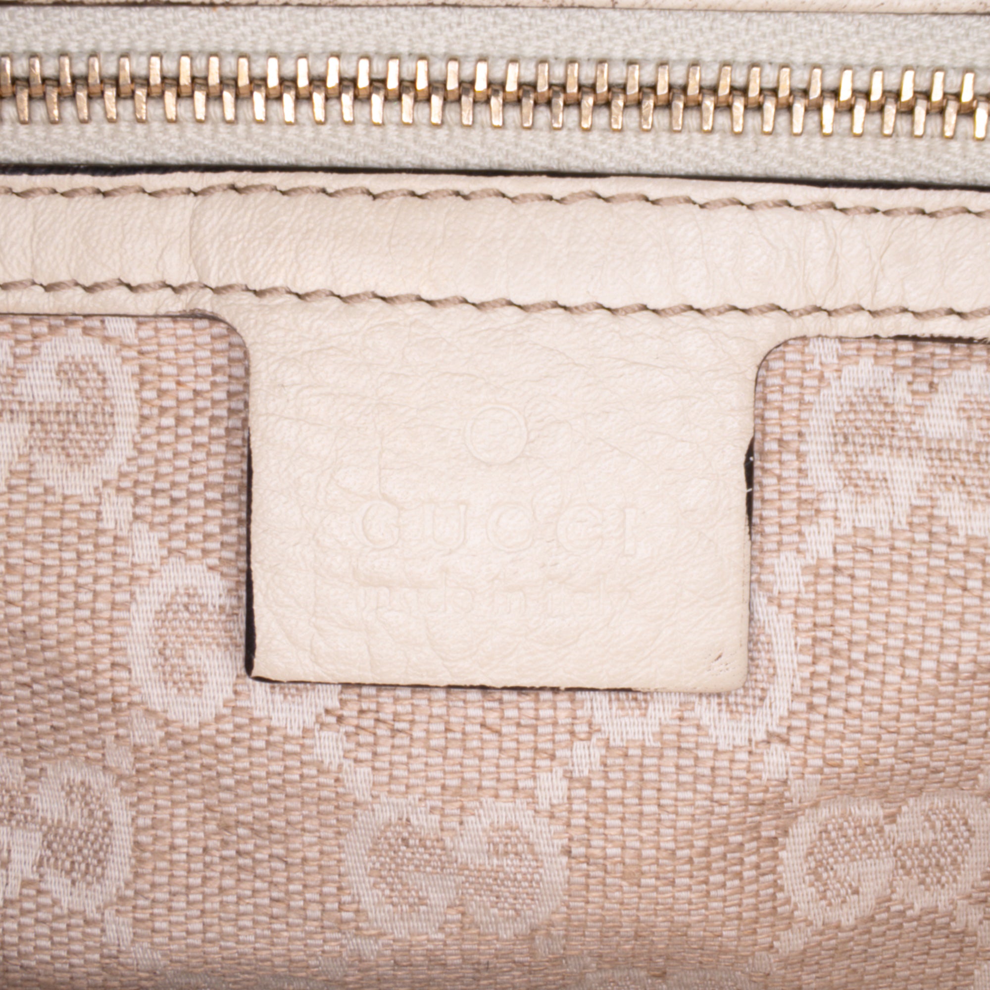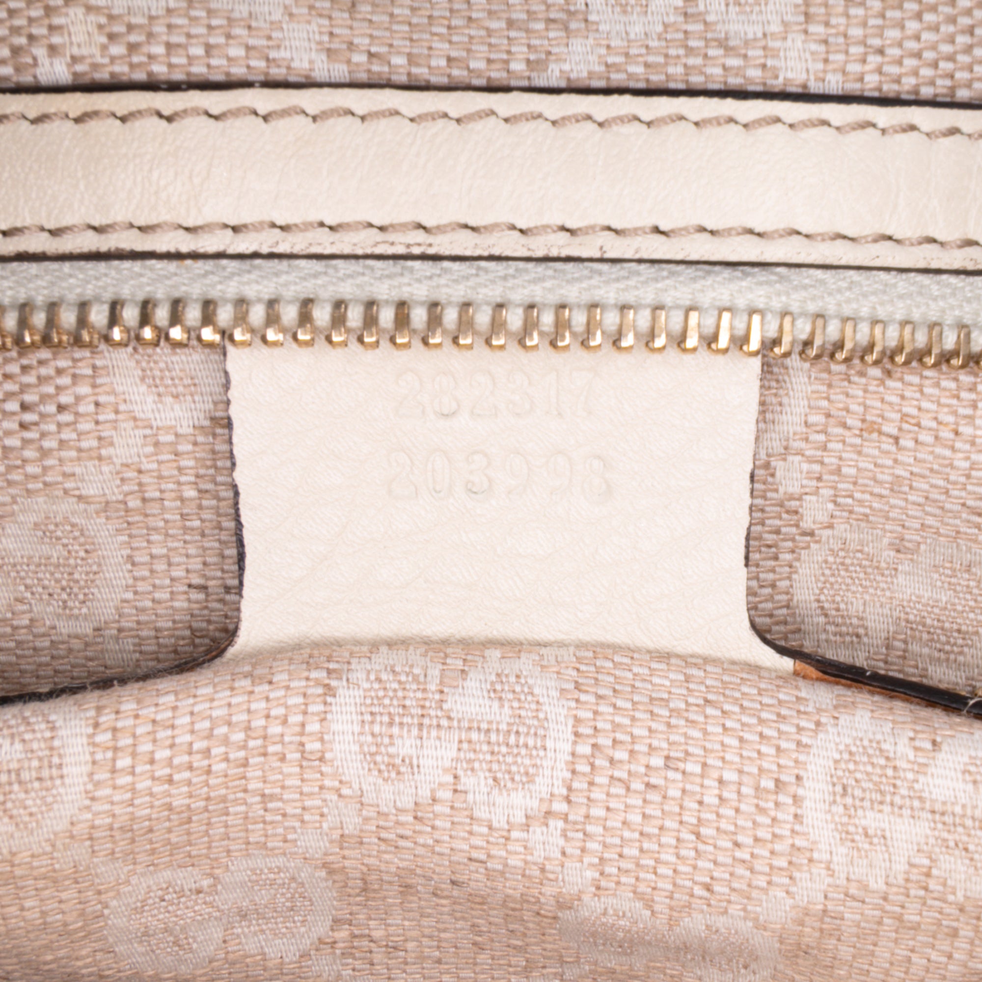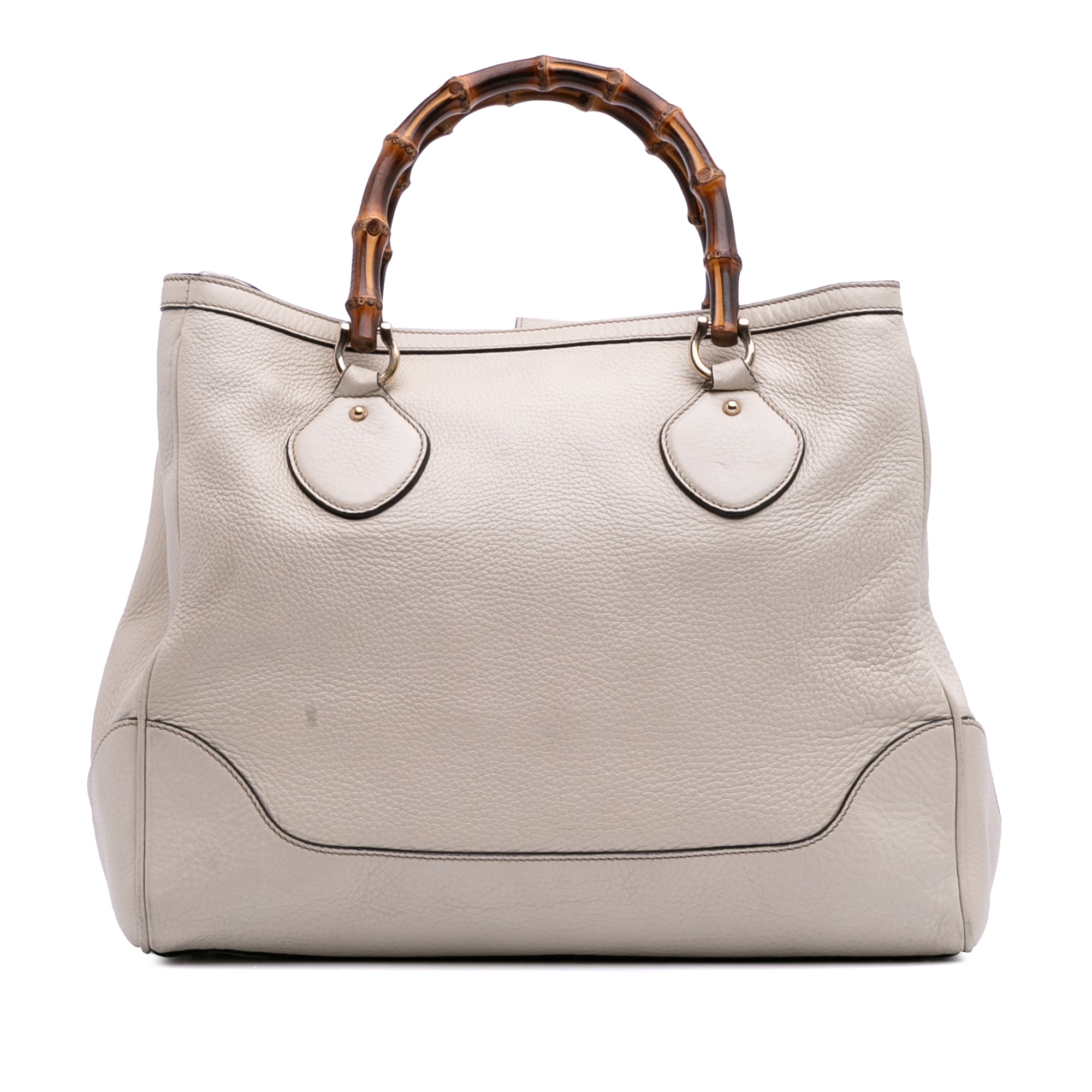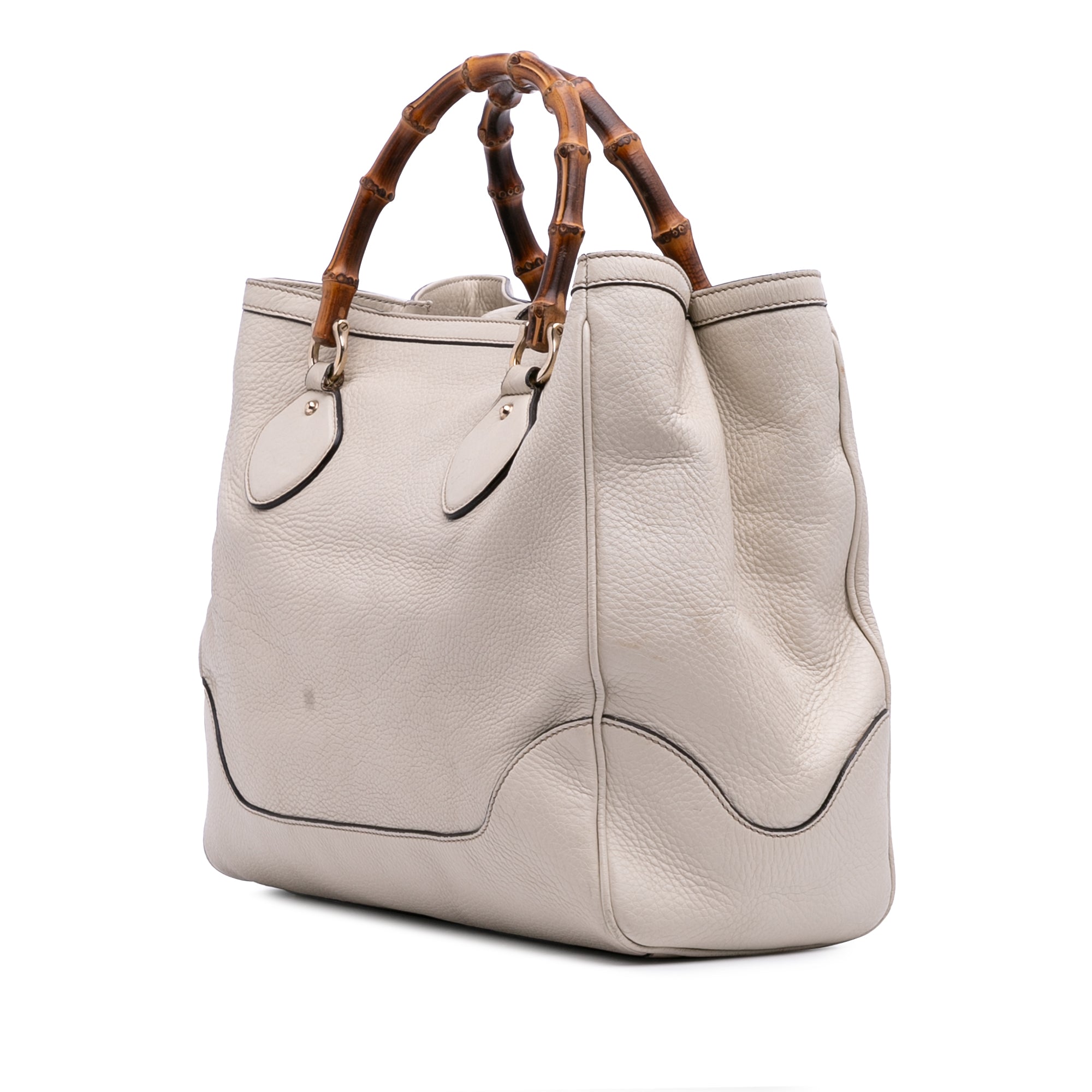 Product Details: White Gucci Medium Leather Bamboo Diana Tote. This tote features a leather body, bamboo top handles, an open top with flap tab and magnetic snap button closure, an interior zip compartment, and interior zip and slip pockets. 12" L x 14.2" W x 5.9" D, 4.1" drop. Serial number 282317 203998.