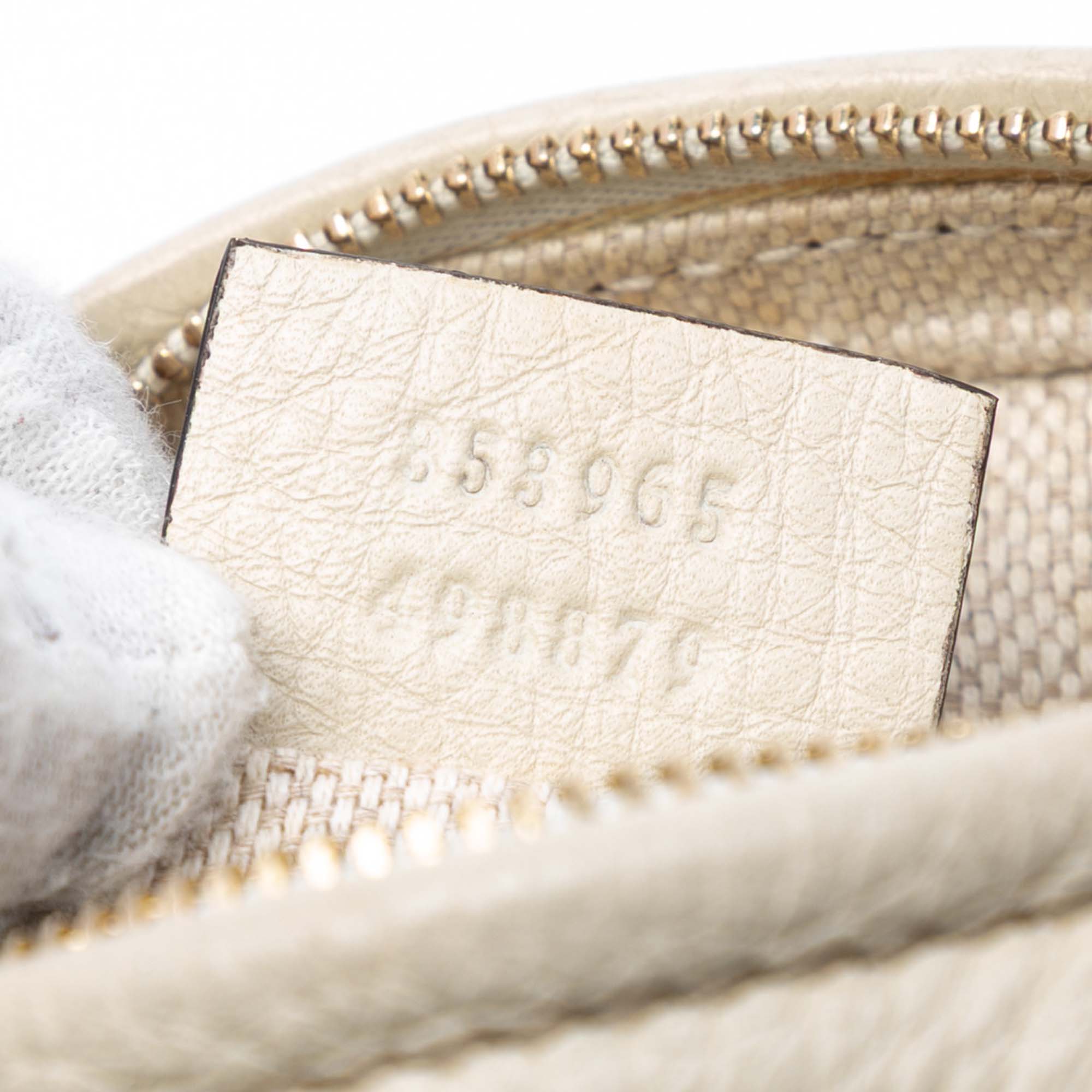 Product Details: White Gucci Mini Pebbled Calfskin Soho Chain Crossbody. The Soho Crossbody bag features a leather body, a tassel detail, a chain link strap, a top zip closure, and an interior slip pocket. 5.3" L x 6.7" W x 1.8" D. Serial number 353965 498879.
