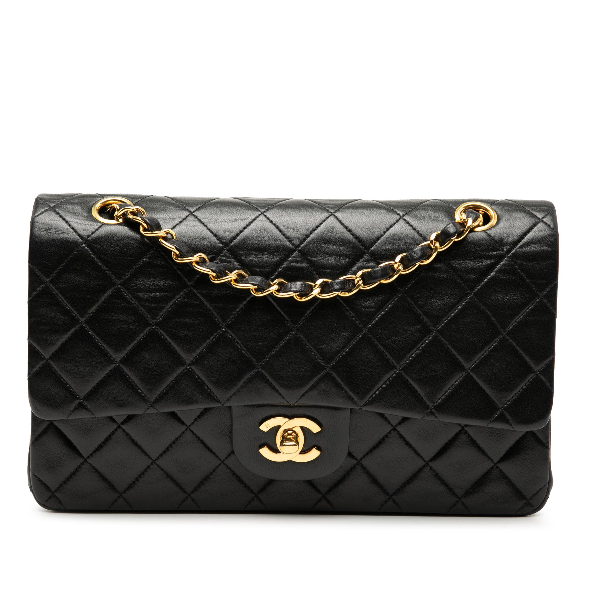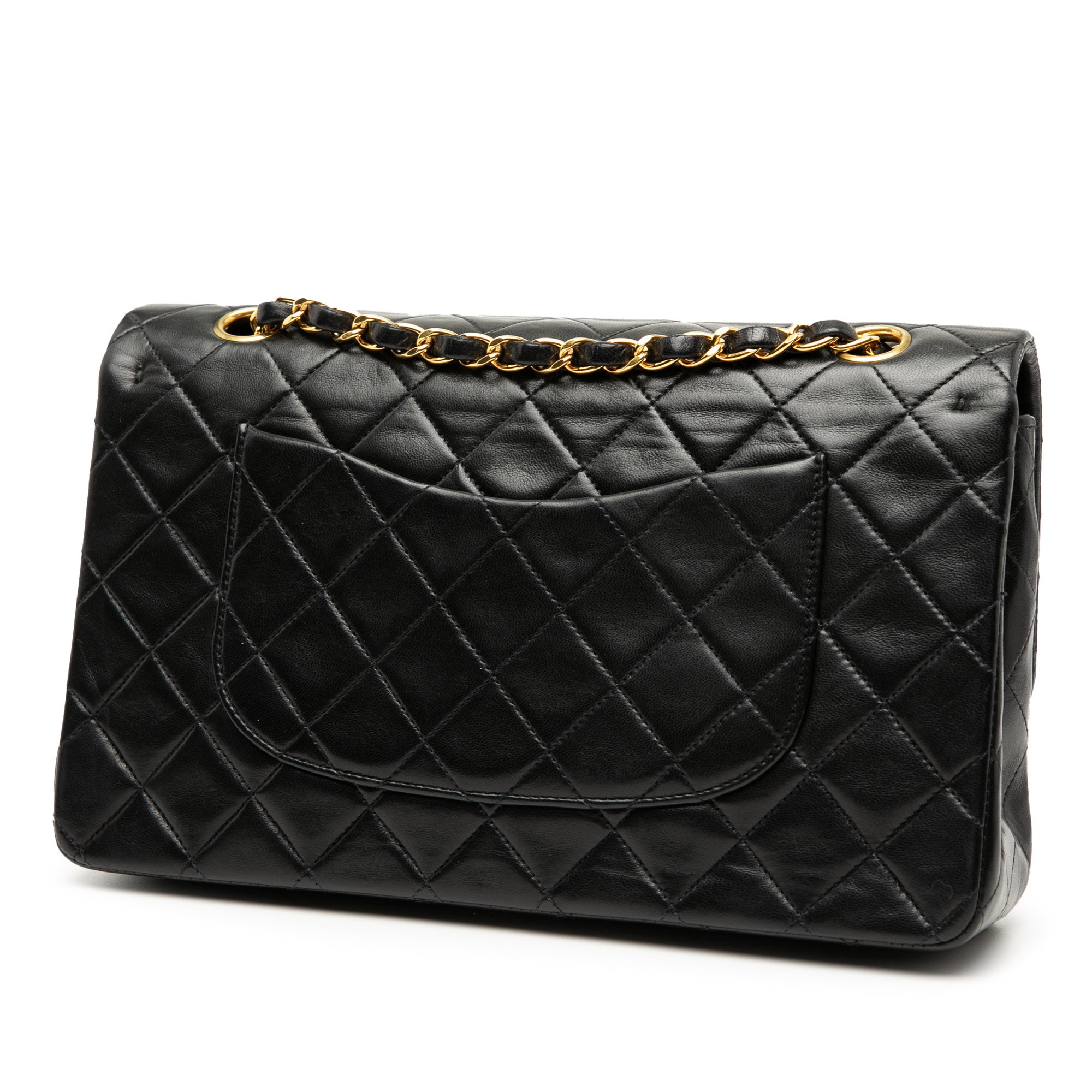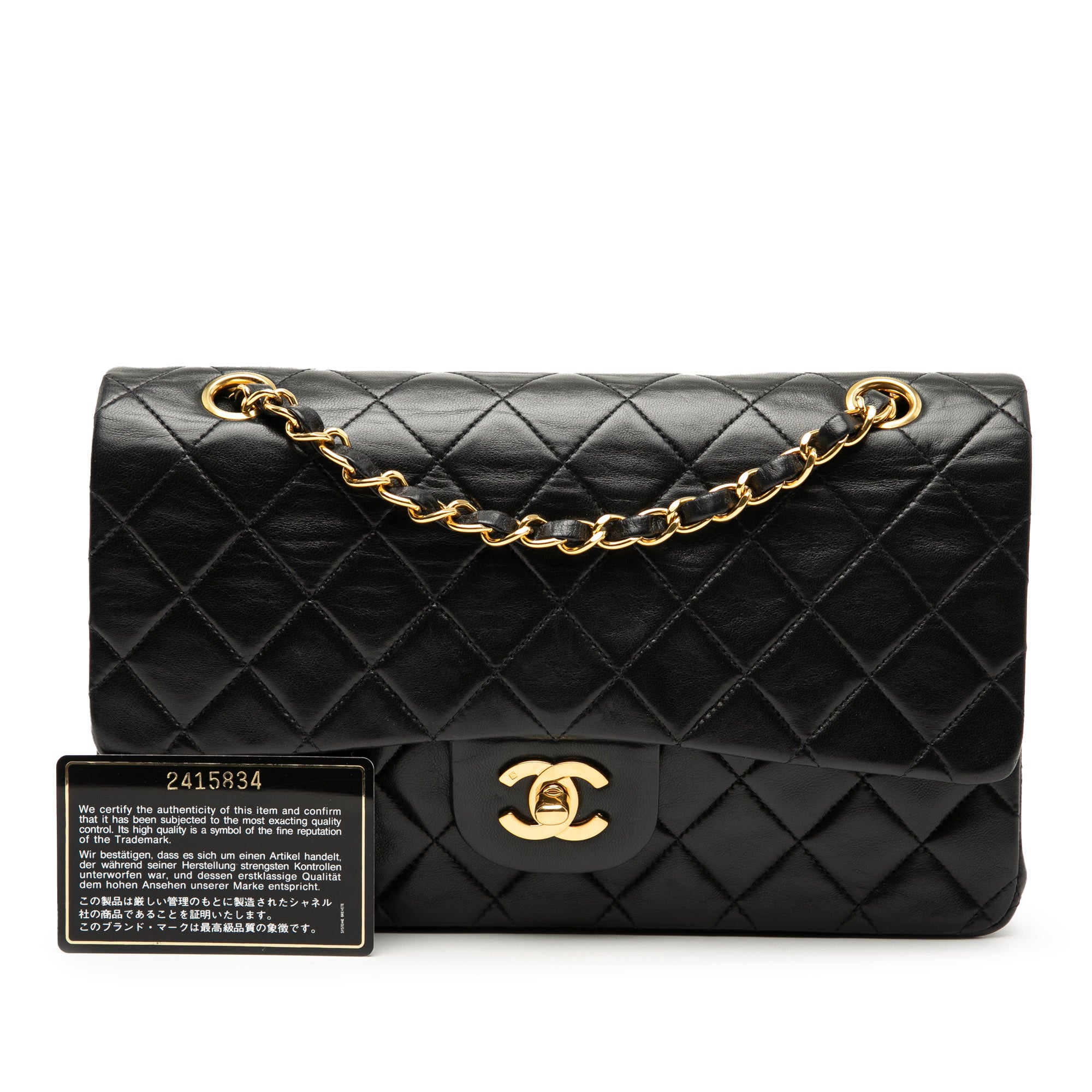 Product Details: Black Chanel Medium Classic Lambskin Double Flap Shoulder Bag. This shoulder bag features a quilted lambskin body, an exterior back slip pocket, leather woven chain straps, double front flaps with interlocking Cs and a twist lock closure, and interior zip and slip pockets. 5.9" L x 10" W x 2.8" D. Serial number 2415834.