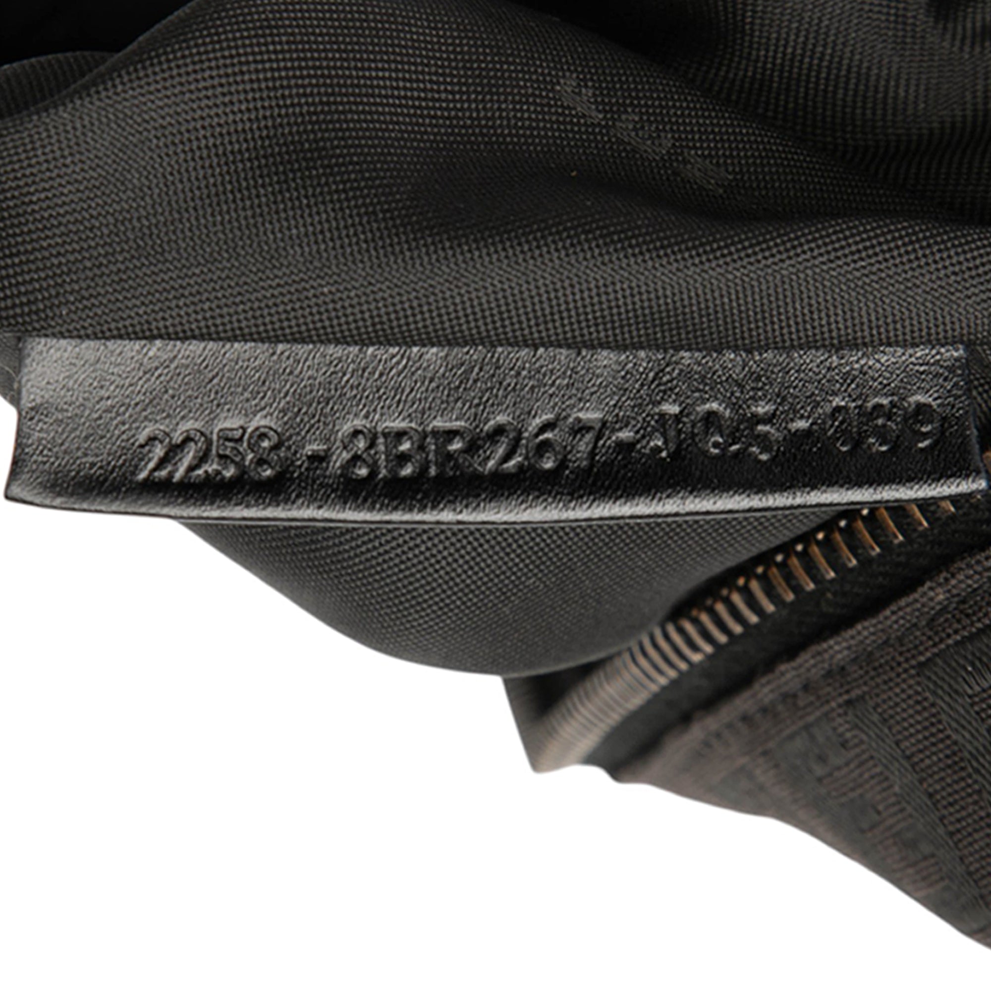 Product Details: Black Fendi Zucchino Canvas Shoulder Bag. This shoulder bag features a canvas body, flat leather strap, a top zip closure, and an interior zip pocket. 5.9" L x 9.4" W x 3.5" D. Serial number 2258 8BR267 JQ5 393.
