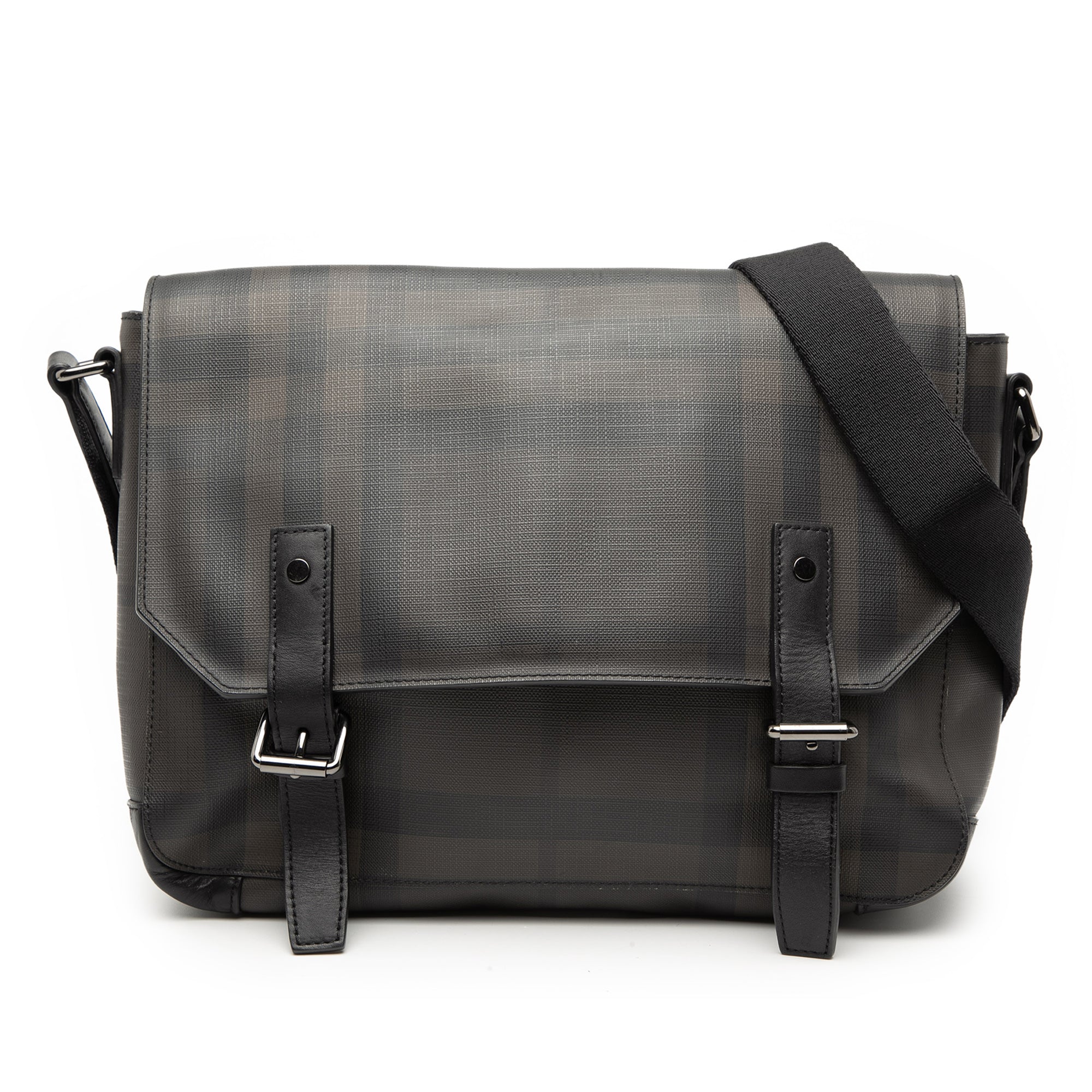 Product Details: Brown Burberry Smoke Check Coated Canvas Hendley Messenger Bag. This crossbody bag features a coated canvas body with leather trim, an adjustable flat strap, a front flap buckle closures, and interior zip and slip pockets. 9.8" L x 12.8" W x 4.1" D. Serial number CNSANQITDON.