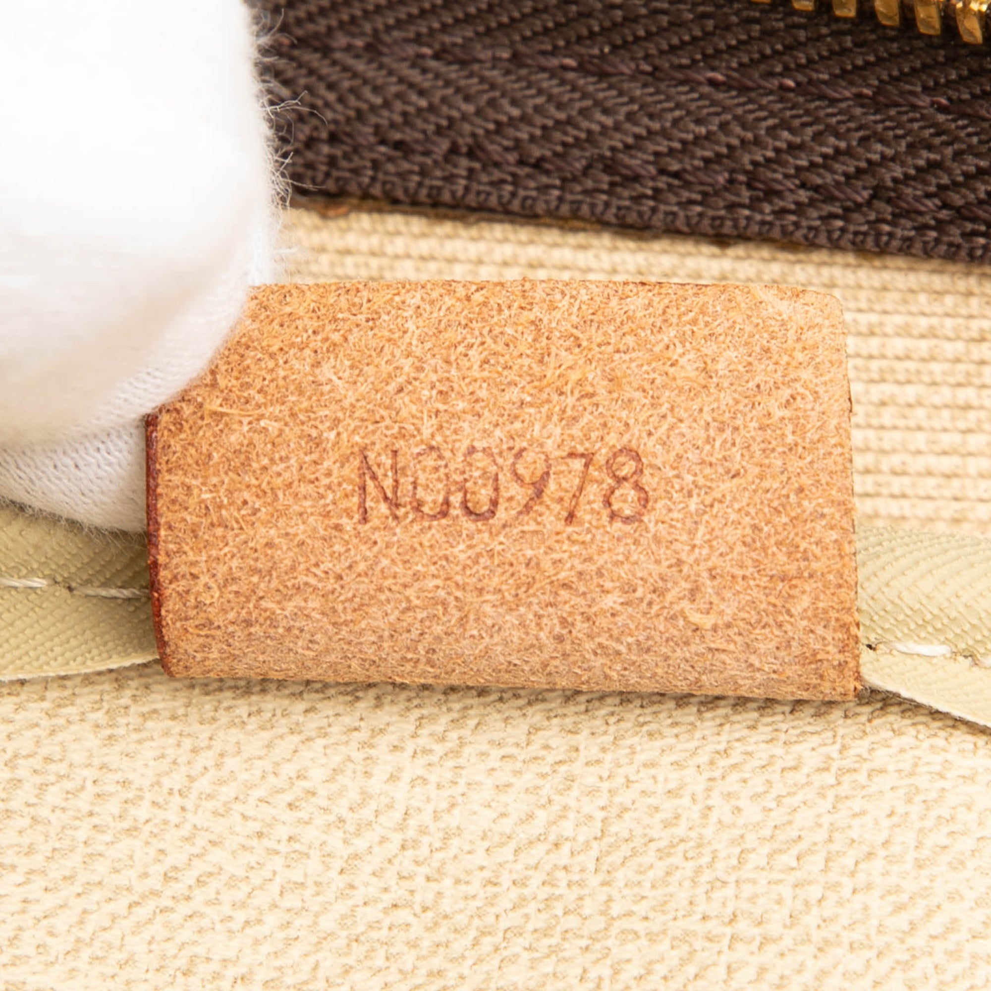 Product Details: Brown Louis Vuitton Monogram Deauville Handbag. The Deauville features a monogram canvas body with vachetta leather trim, rolled vachetta leather top handles, an exterior slip pocket, a top zip closure, and interior open pockets. 10.2" L x 13.4" W x 5.1" D, 3.9" drop. Serial number NO0978.