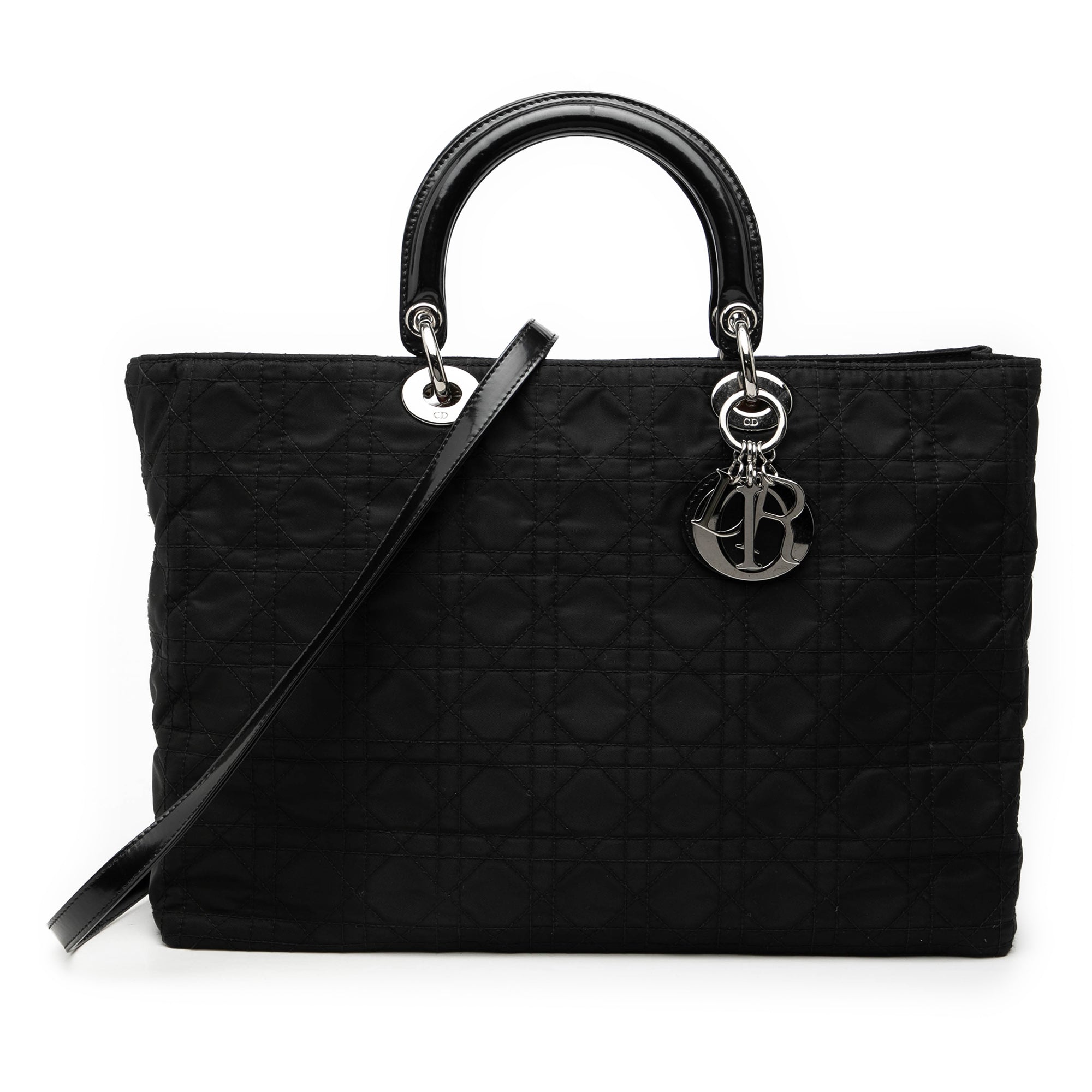 Product Details: Black Dior Extra Large Nylon Cannage Lady Dior Satchel. The Lady Dior features a quilted nylon body, flat leather handles, a detachable flat leather strap, a top zip closure, and interior zip and slip pockets. 9.8" L x 14.2" W x 3.5" D, 3.7" drop. Serial number 01RU 0063.