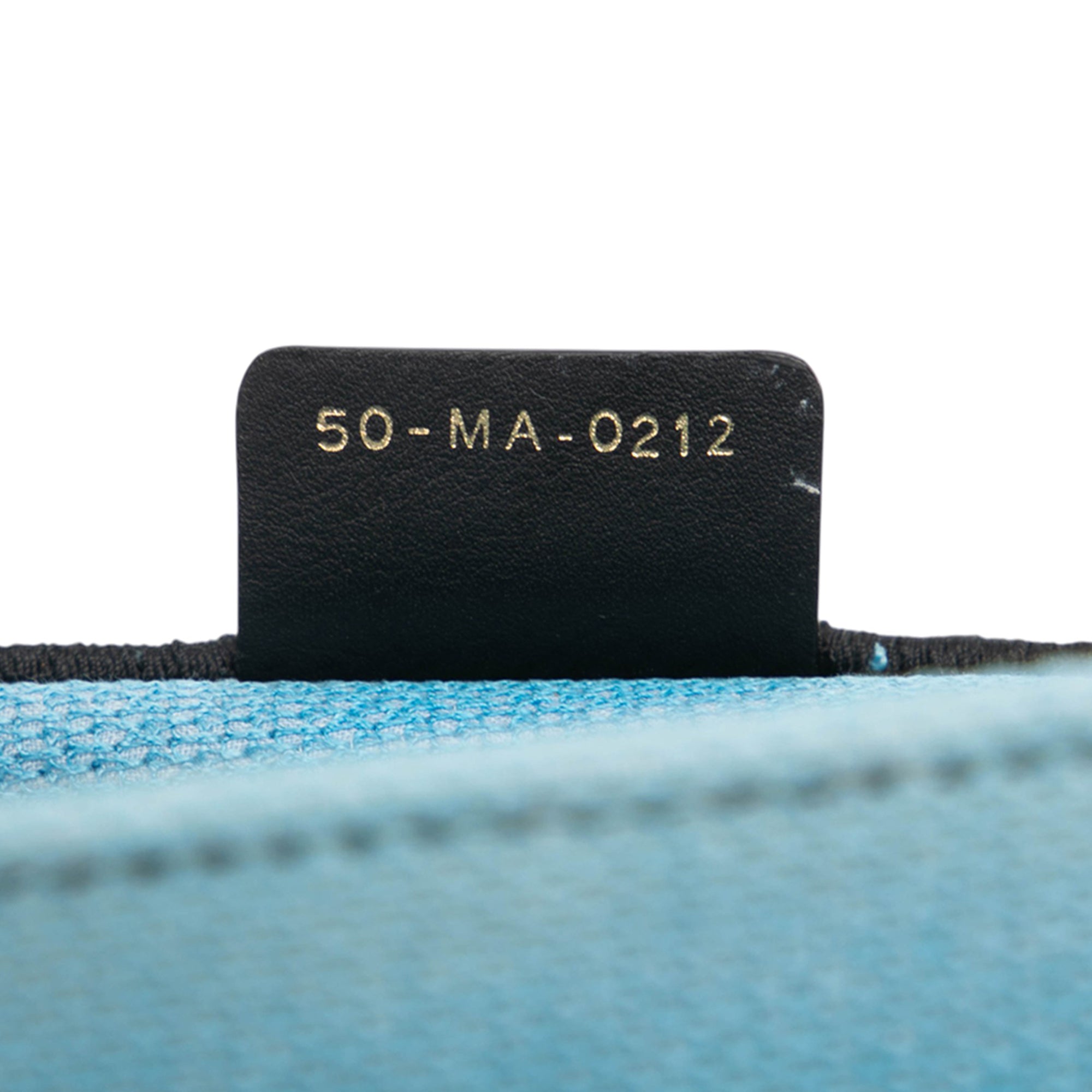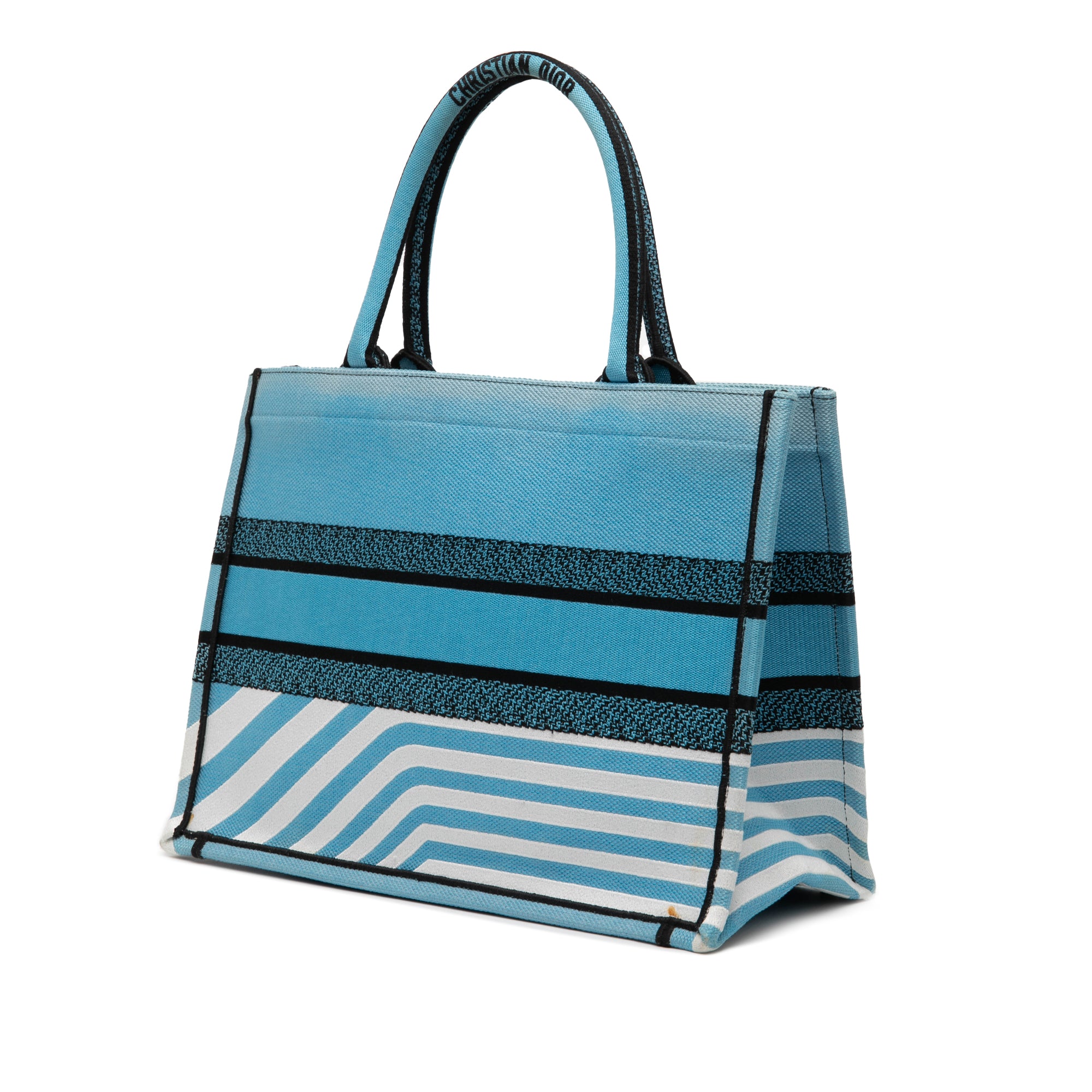 Product Details: Blue Dior Medium Embroidered Canvas Zebra D Jungle Pop Book Tote. The Book Tote features an embroidered canvas body, rolled top handles, and an open top. 10.6" L x 14.2" W x 2.8" D, 6.1" drop. Serial number 50-MA-0212.
