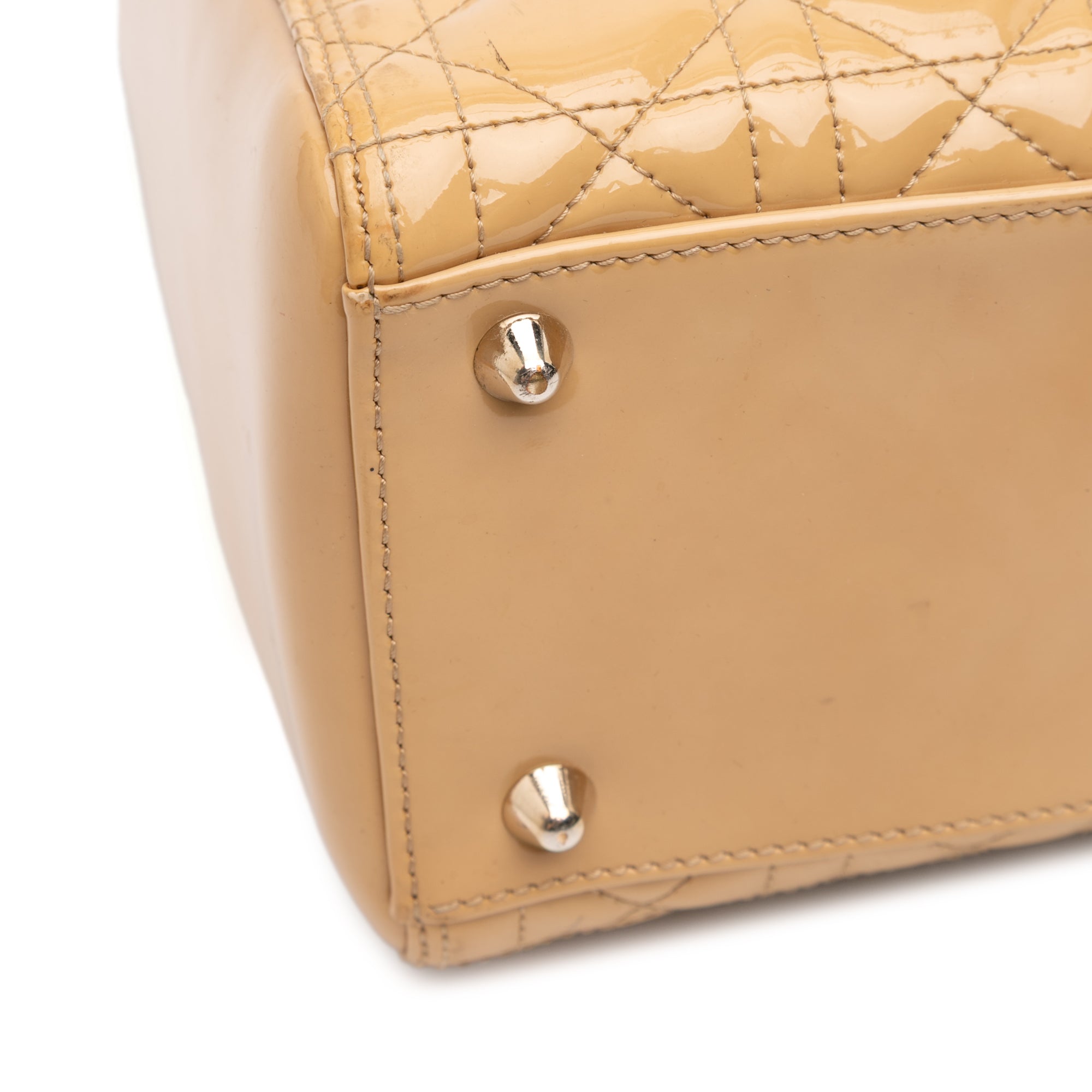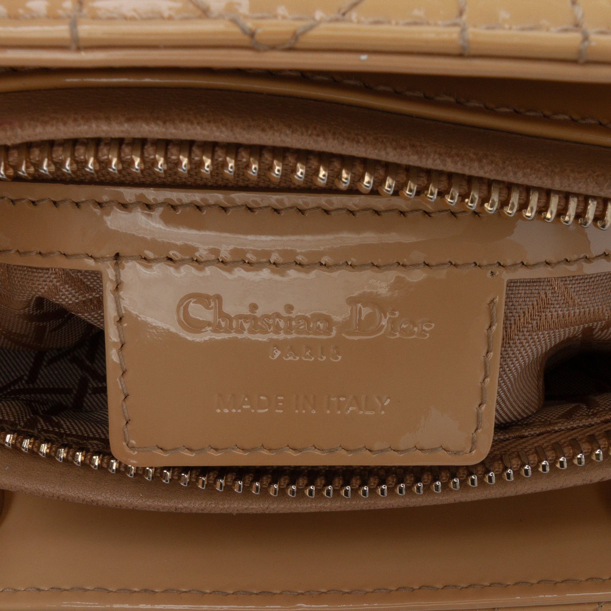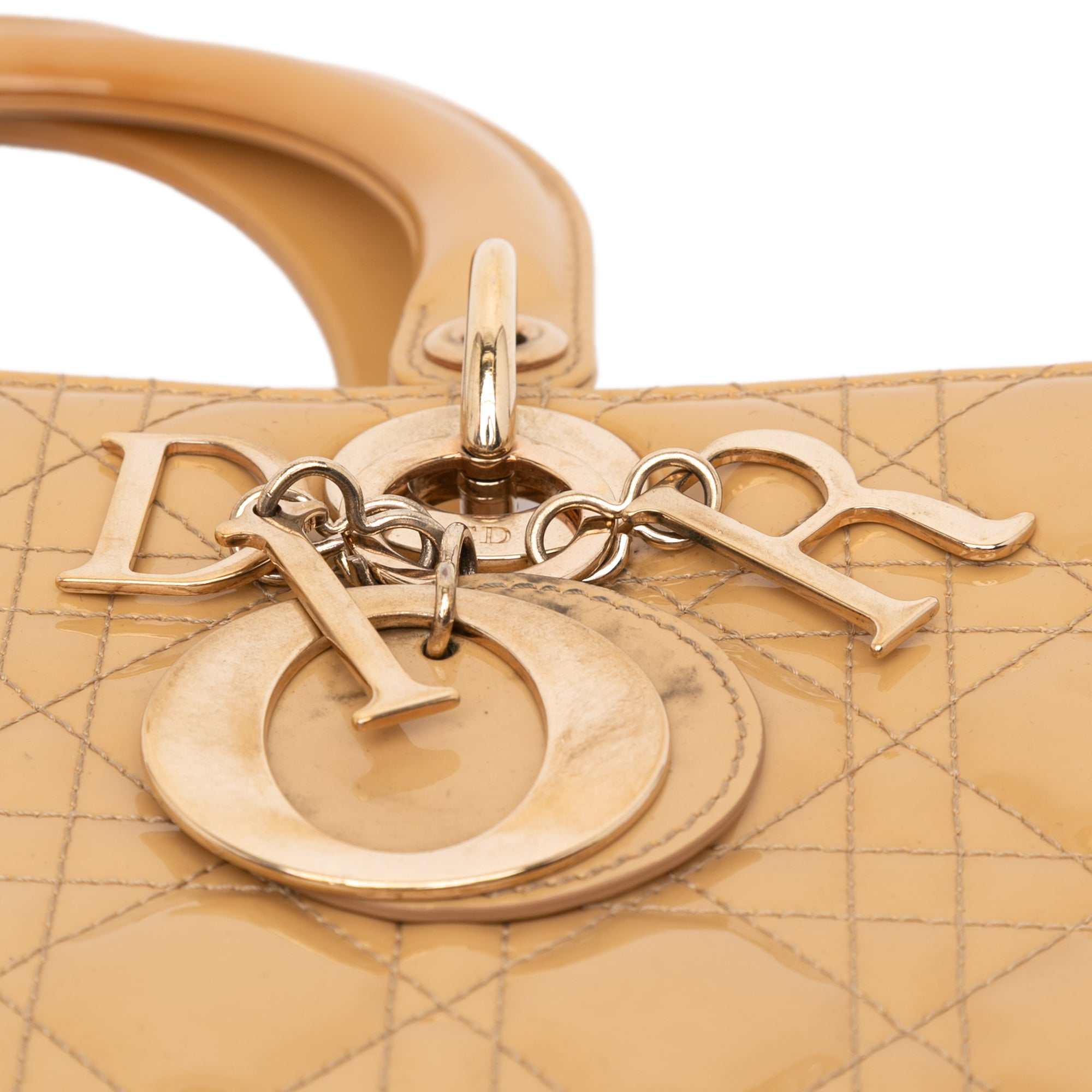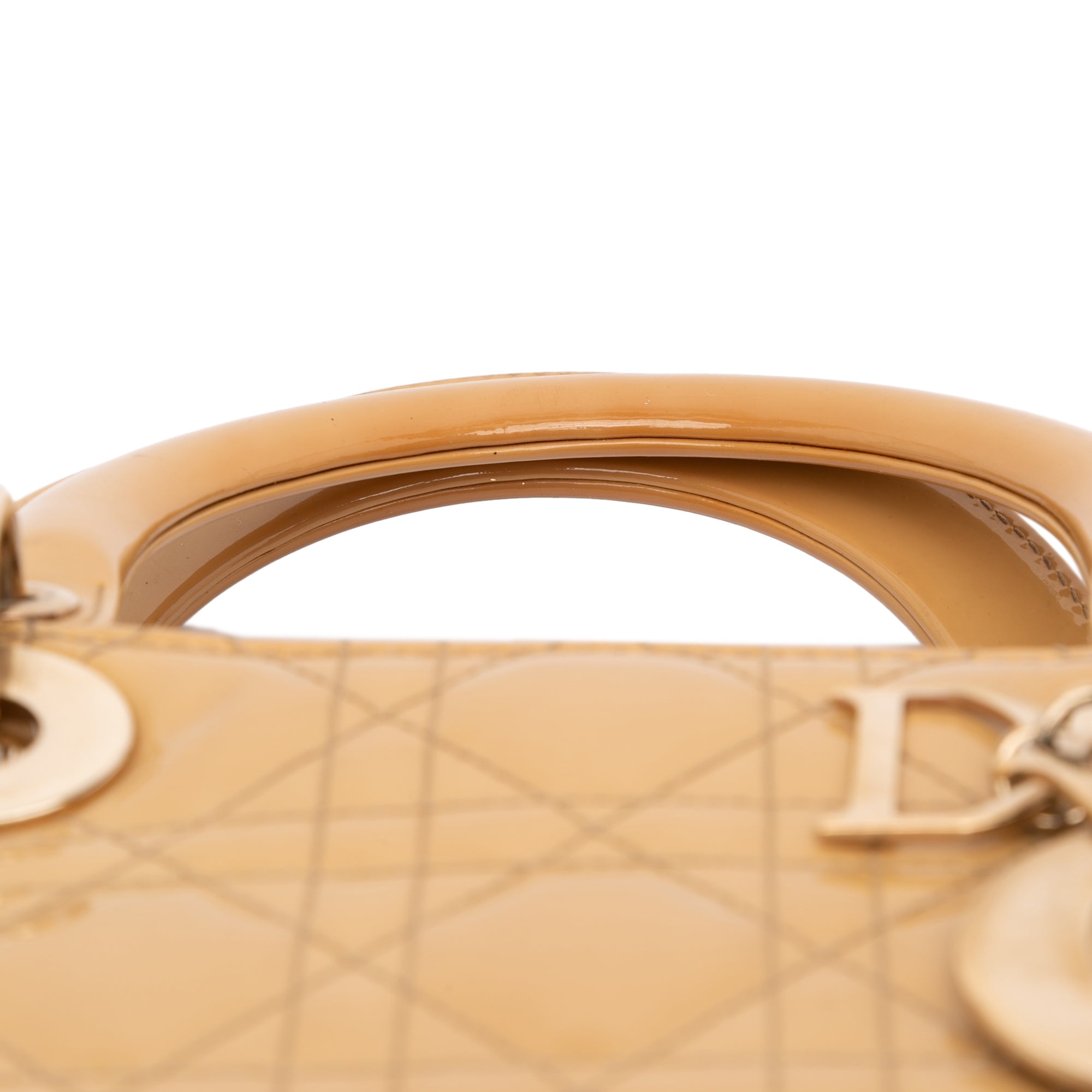 Product Details: Gold Dior Large Patent Cannage Lady Dior Satchel. The Lady Dior features a patent leather body, flat leather handles, a detachable flat leather strap, a top zip closure, and an interior zip pocket. 9.8" L x 12.6" W x 4.7" D, 4.7" drop. Serial number 05BMA-0142.
