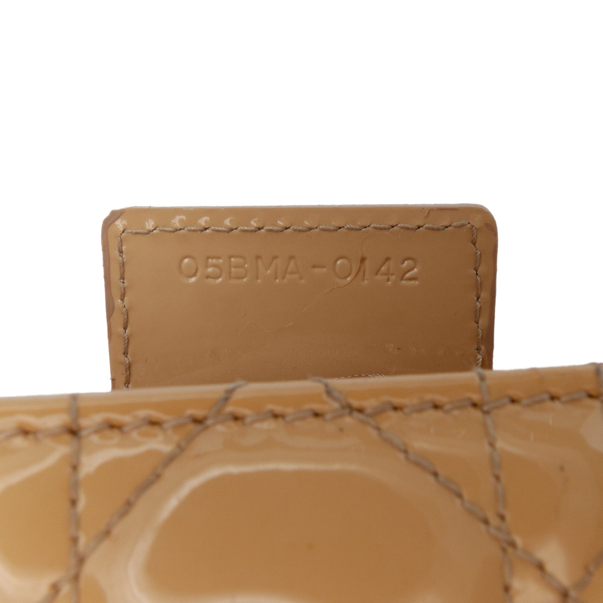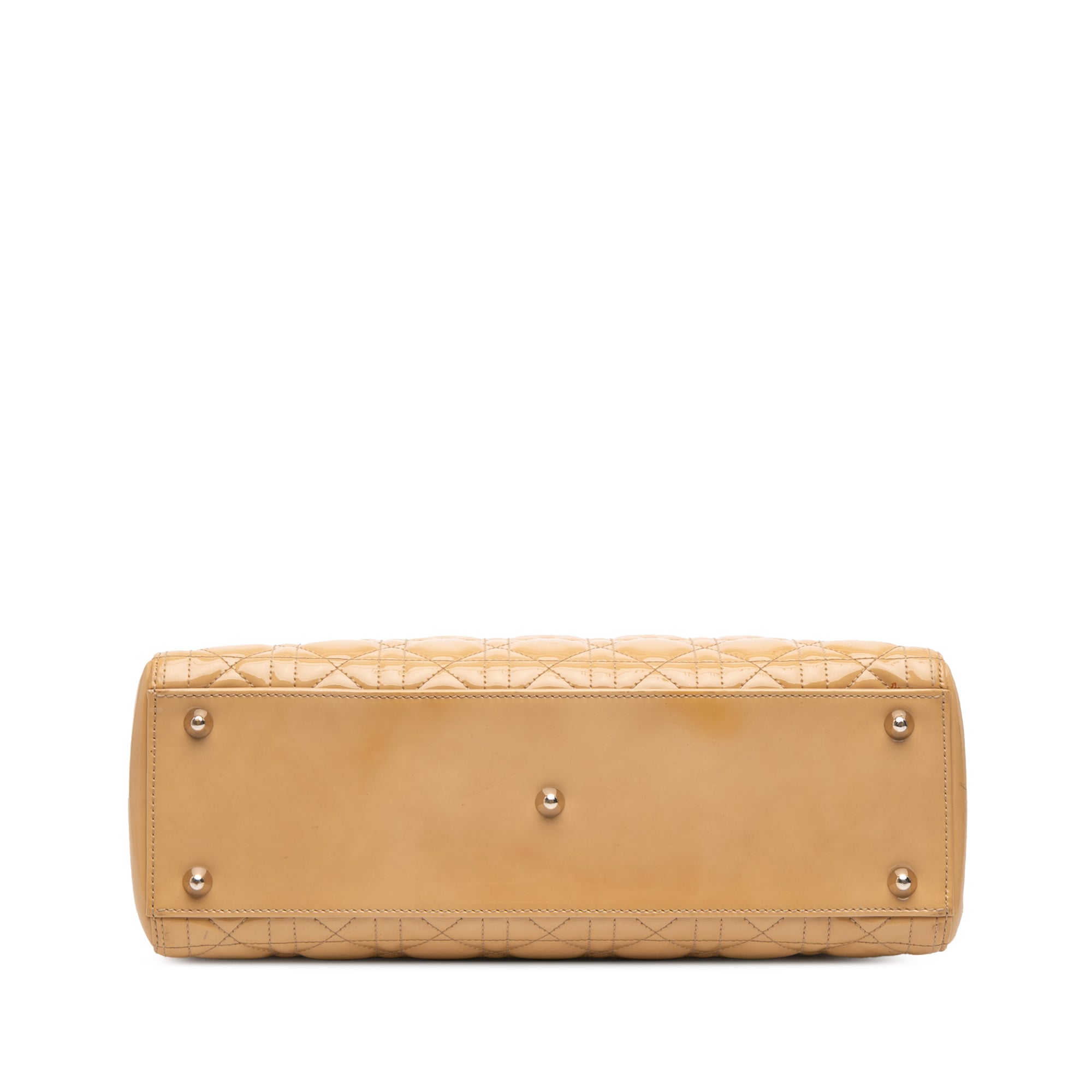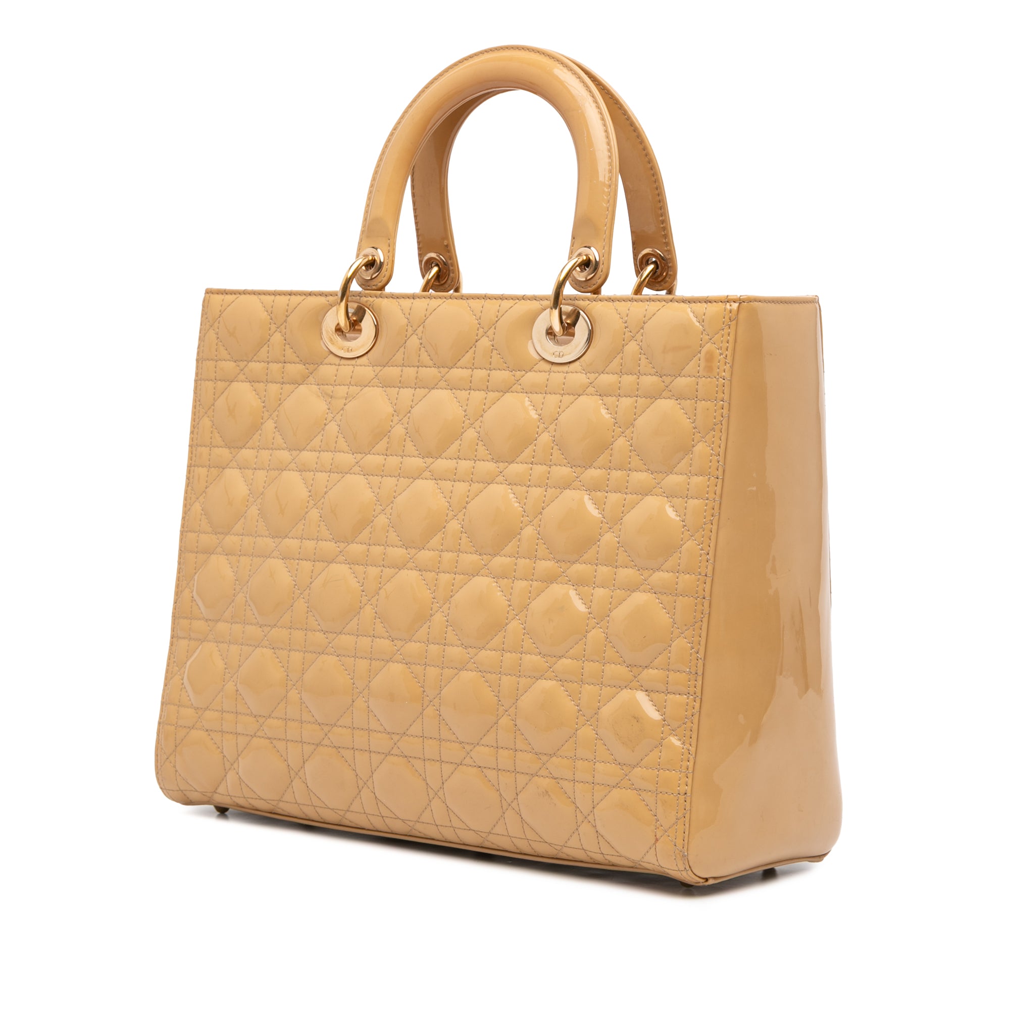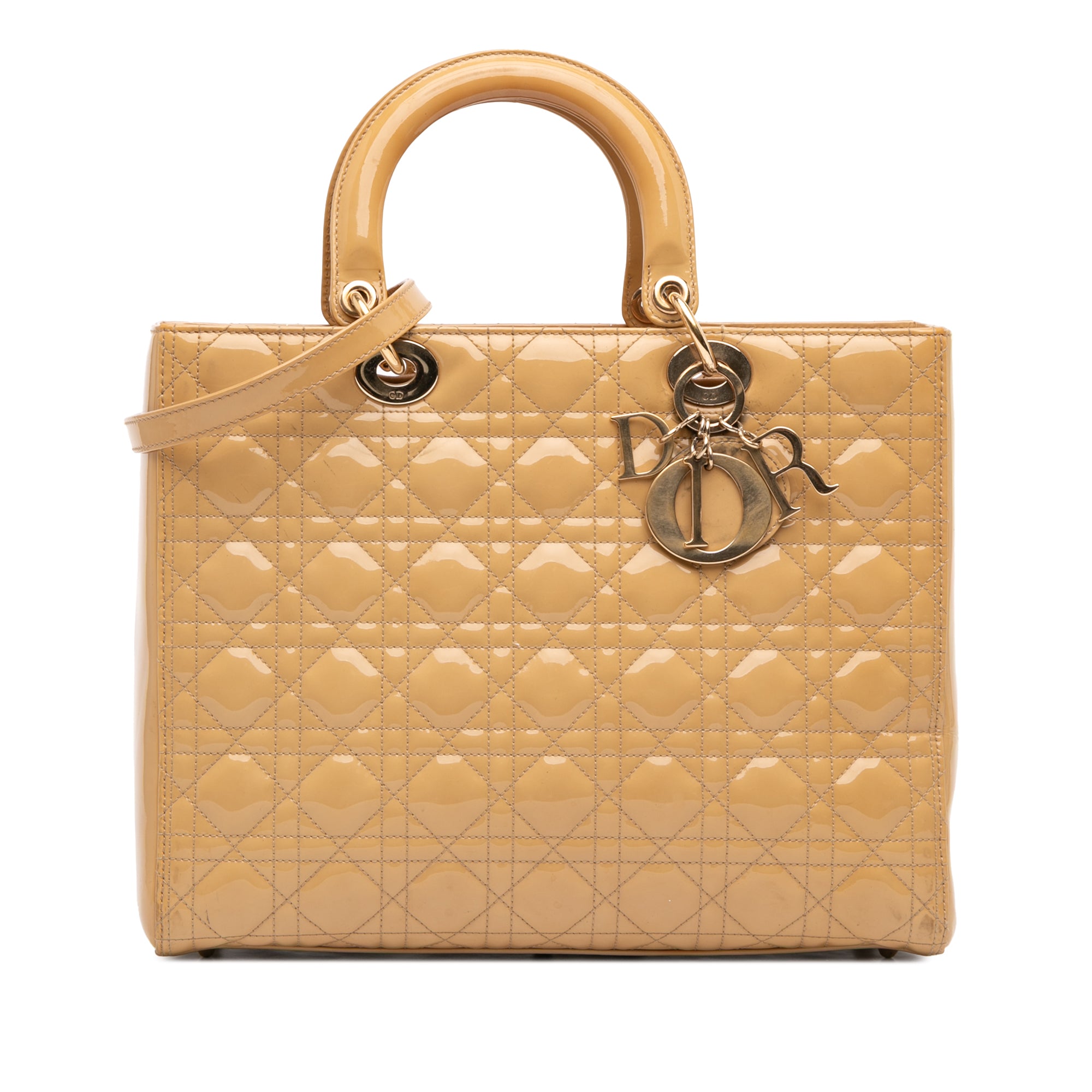 Product Details: Gold Dior Large Patent Cannage Lady Dior Satchel. The Lady Dior features a patent leather body, flat leather handles, a detachable flat leather strap, a top zip closure, and an interior zip pocket. 9.8" L x 12.6" W x 4.7" D, 4.7" drop. Serial number 05BMA-0142.