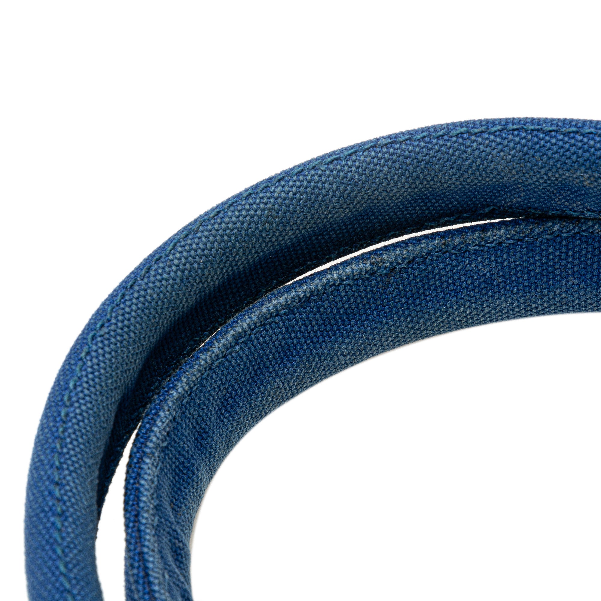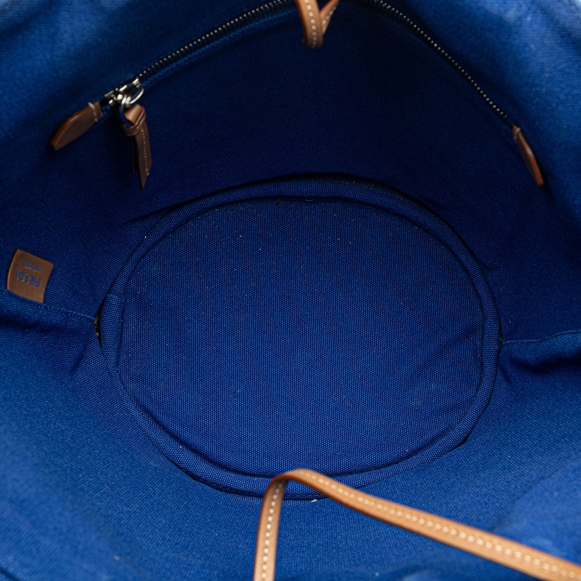 Product Details: Blue Prada Canvas Canapa Logo Satchel. This satchel features a canvas body, rolled handles, a detachable flat strap, an open top, and interior zip and slip pockets. 10.2" L x 9.1" W x 7.1" D, 4.7" drop. Serial number 1BG186.