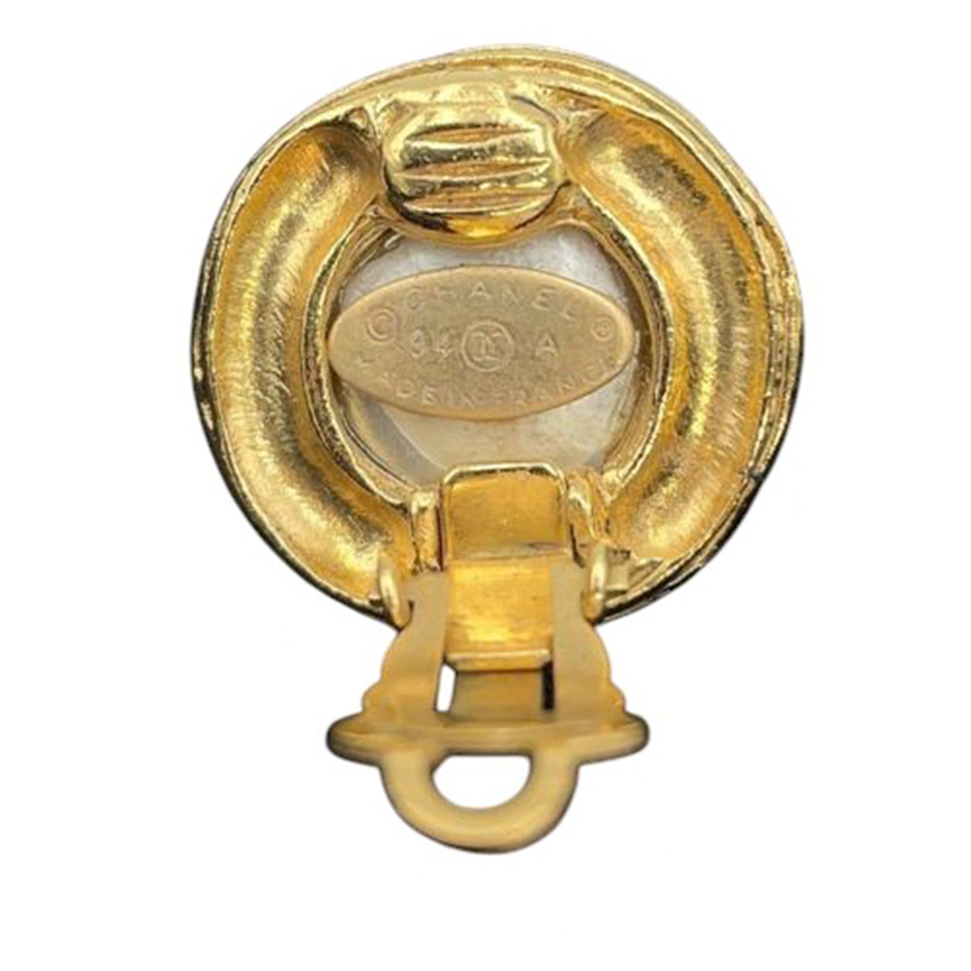 Product Details: Gold Chanel Gold Plated CC Faux Pearl Round Clip on Earrings. These earrings feature a gold-plated metal body with CC logo and faux pearl details, and a clip on closure. 0.8" L x 1" W x 0" D. Serial number 94A.
