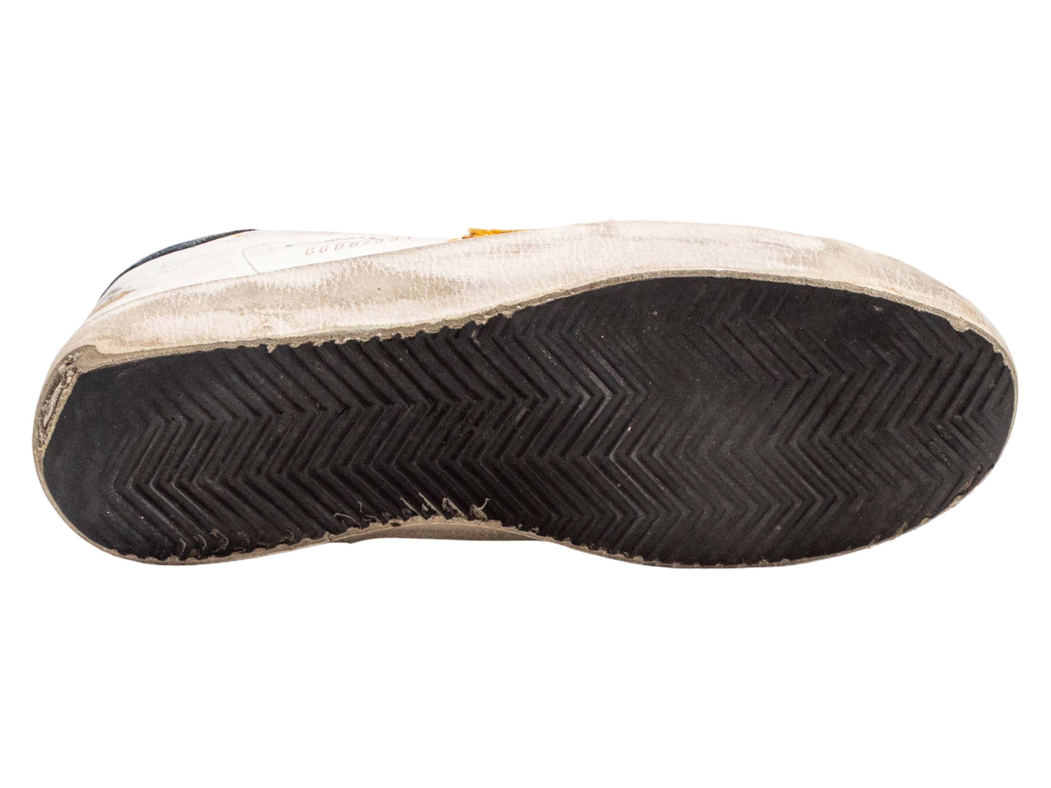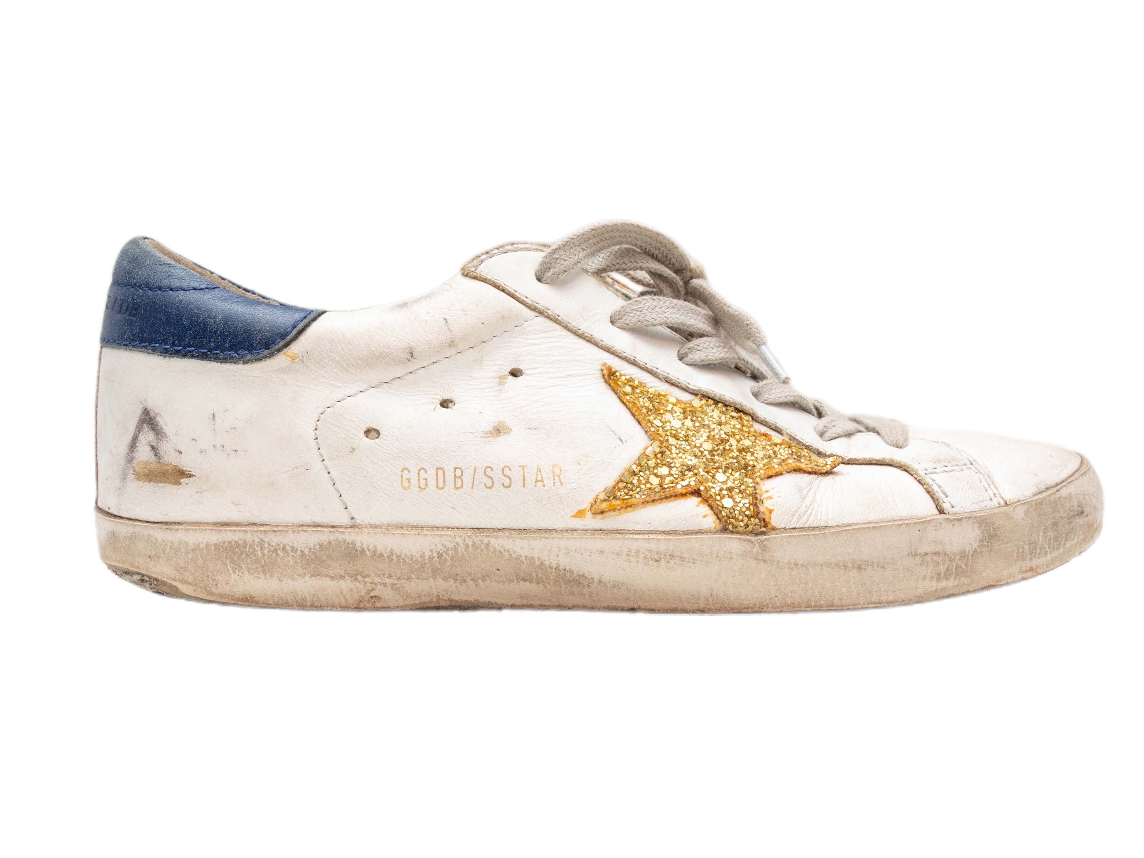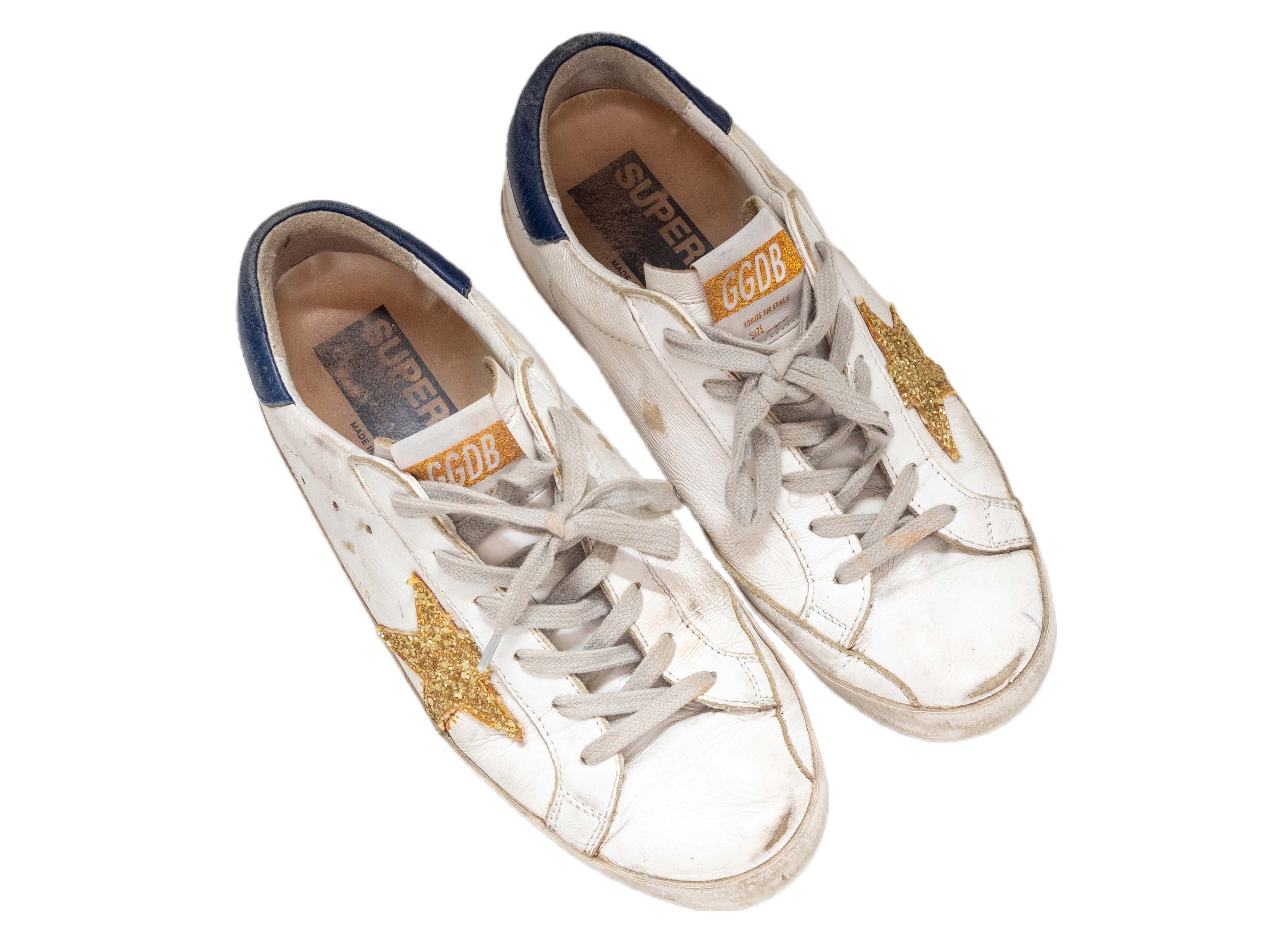 Product Details: White and navy leather low-top gold glitter star sneakers by Golden Goose. Rubber heels. Lace-up tie closures at tops. 0.75" platform height, 1" heel height.