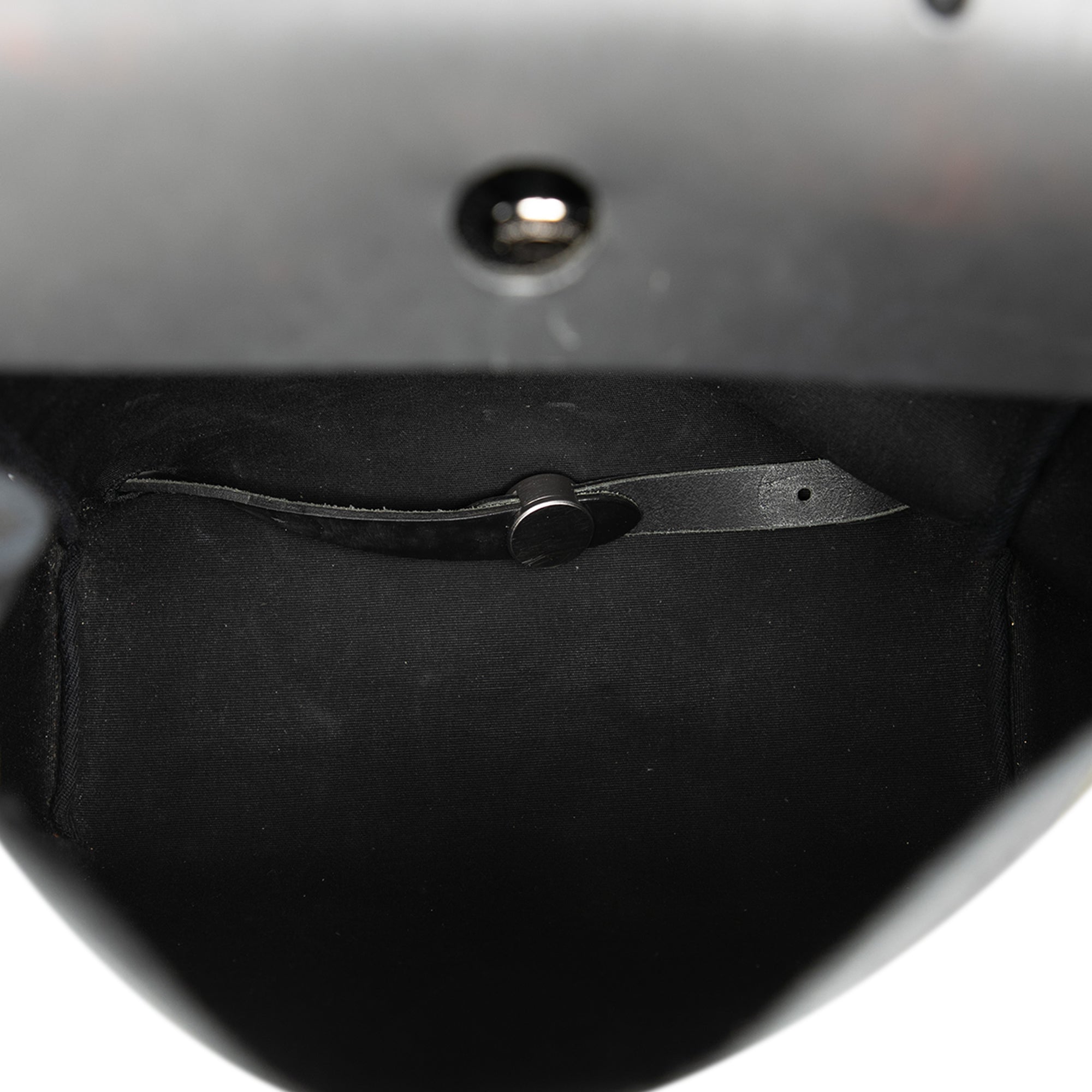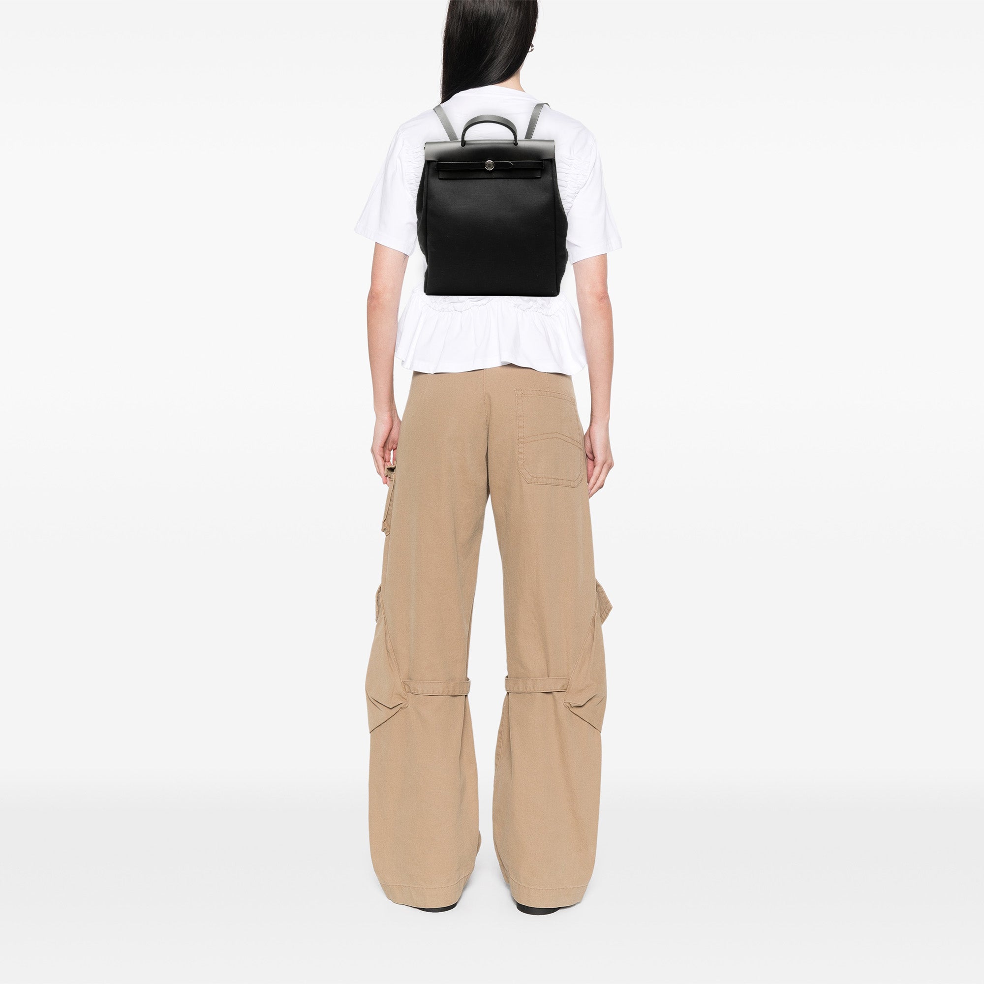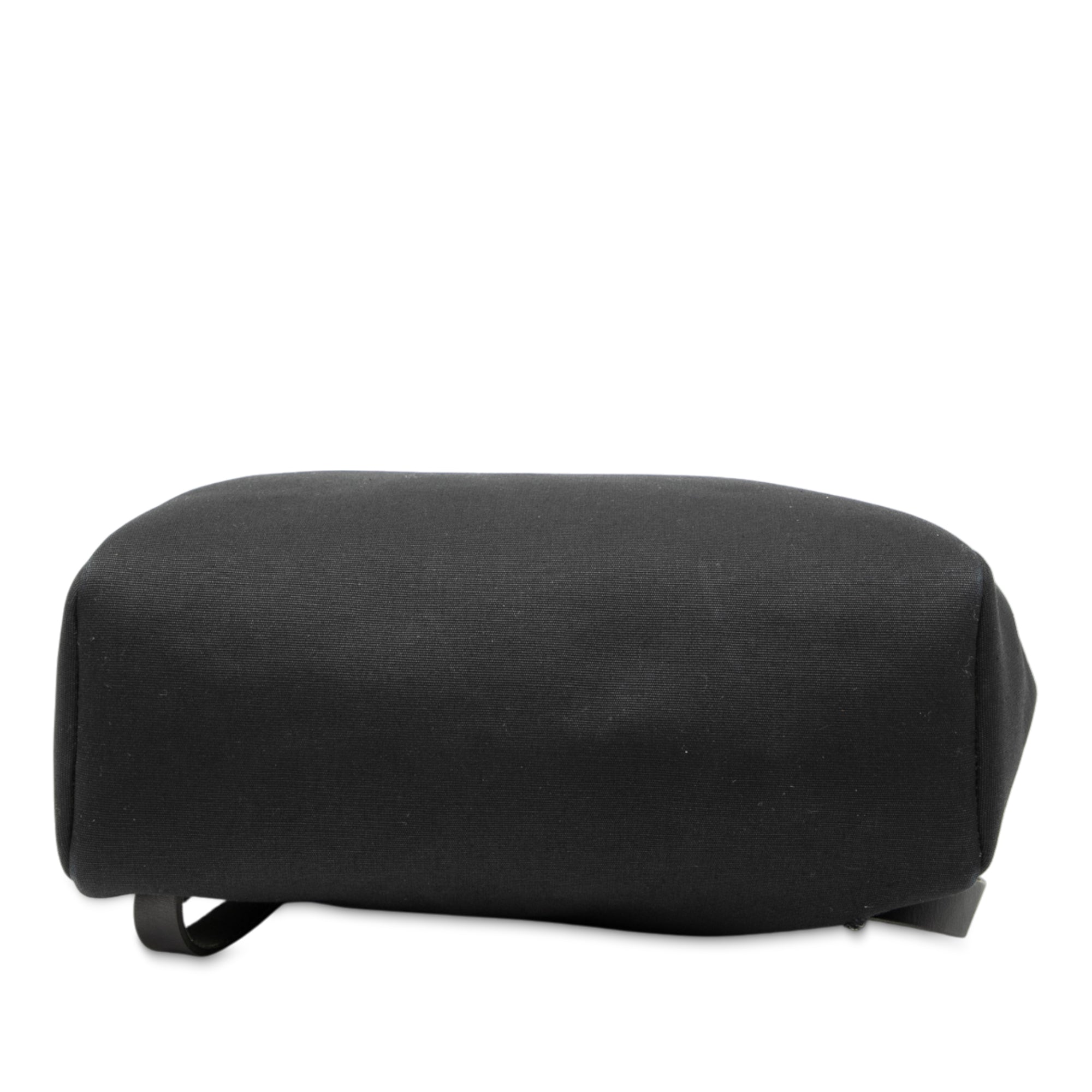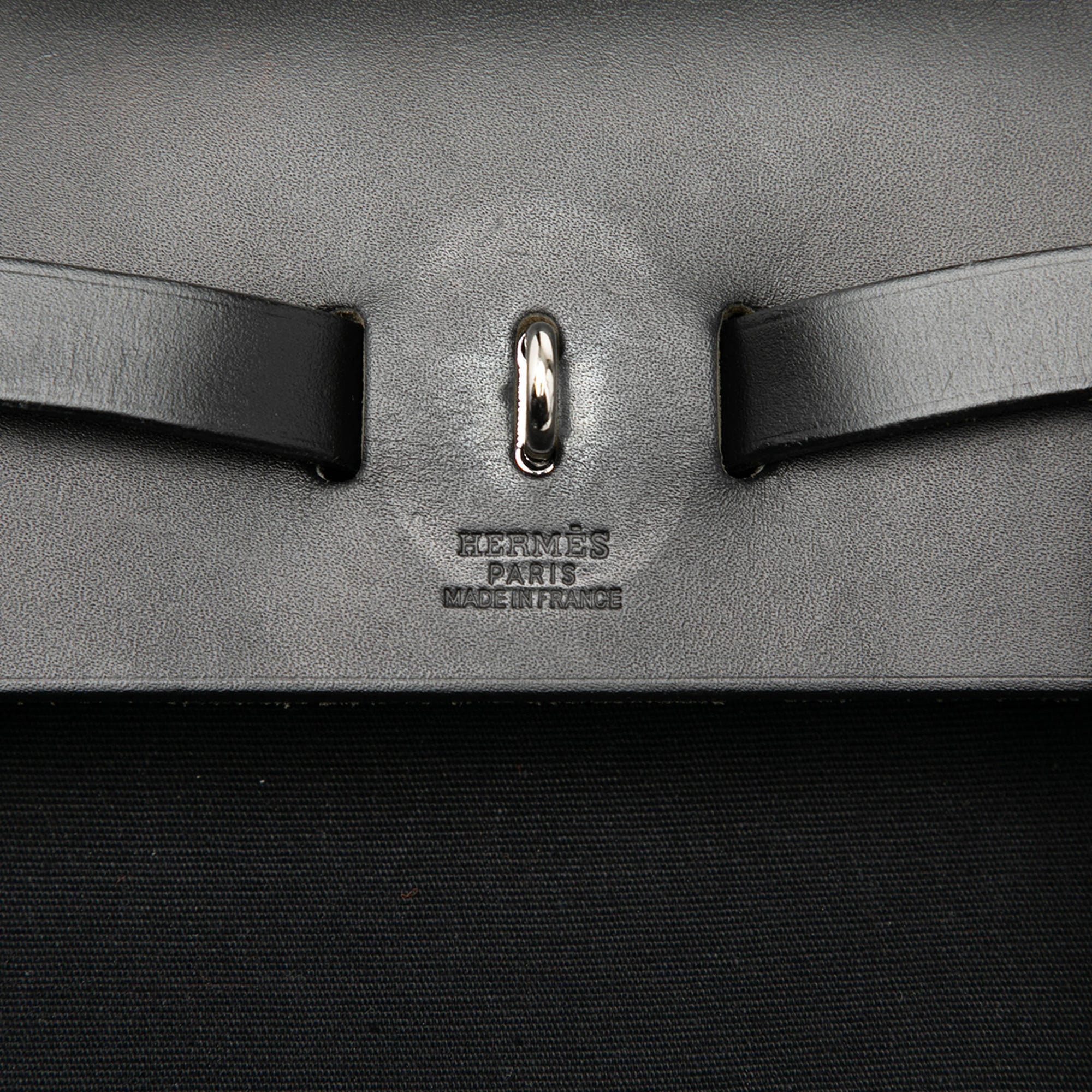 Product Details: Black Hermès Toile Herbag GM Backpack. The Herbag backpack features a canvas body with leather trim, a flat leather top handle, a flat leather back straps, a clochette, a front leather flap, and a top drawstring closure. 13" L x 11.4" W x 4.5" D, 2.6" drop. Serial number □G.