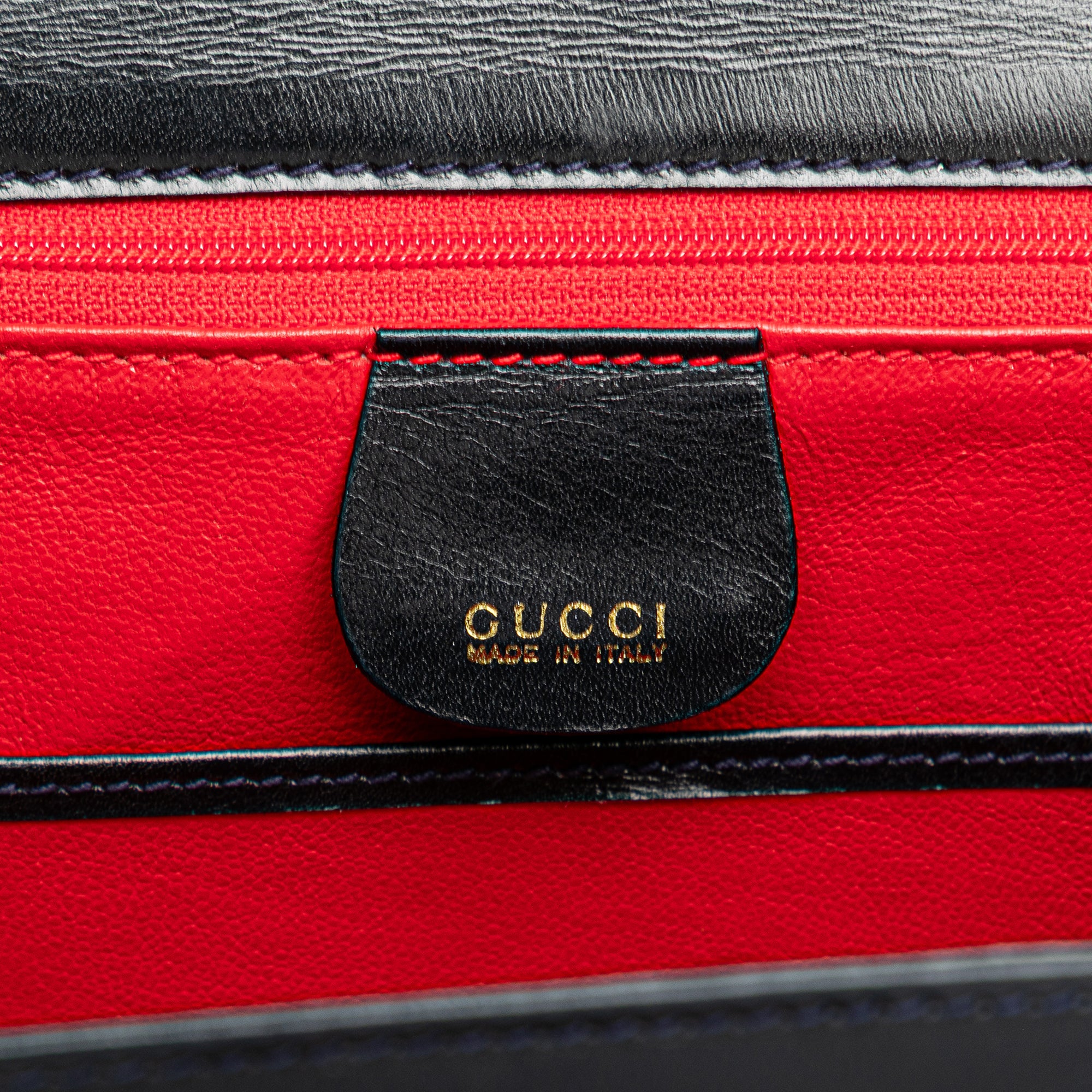 Product Details: Black Gucci Calfskin Bamboo Night Satchel. The Bamboo Night features a leather body, a bamboo top handle, a detachable flat leather shoulder strap, a flap with bamboo turn lock closure, and interior zip and slip pockets. 5.5" L x 8.7" W x 2.8" D, 4.1" drop. Serial number 000 20460188.