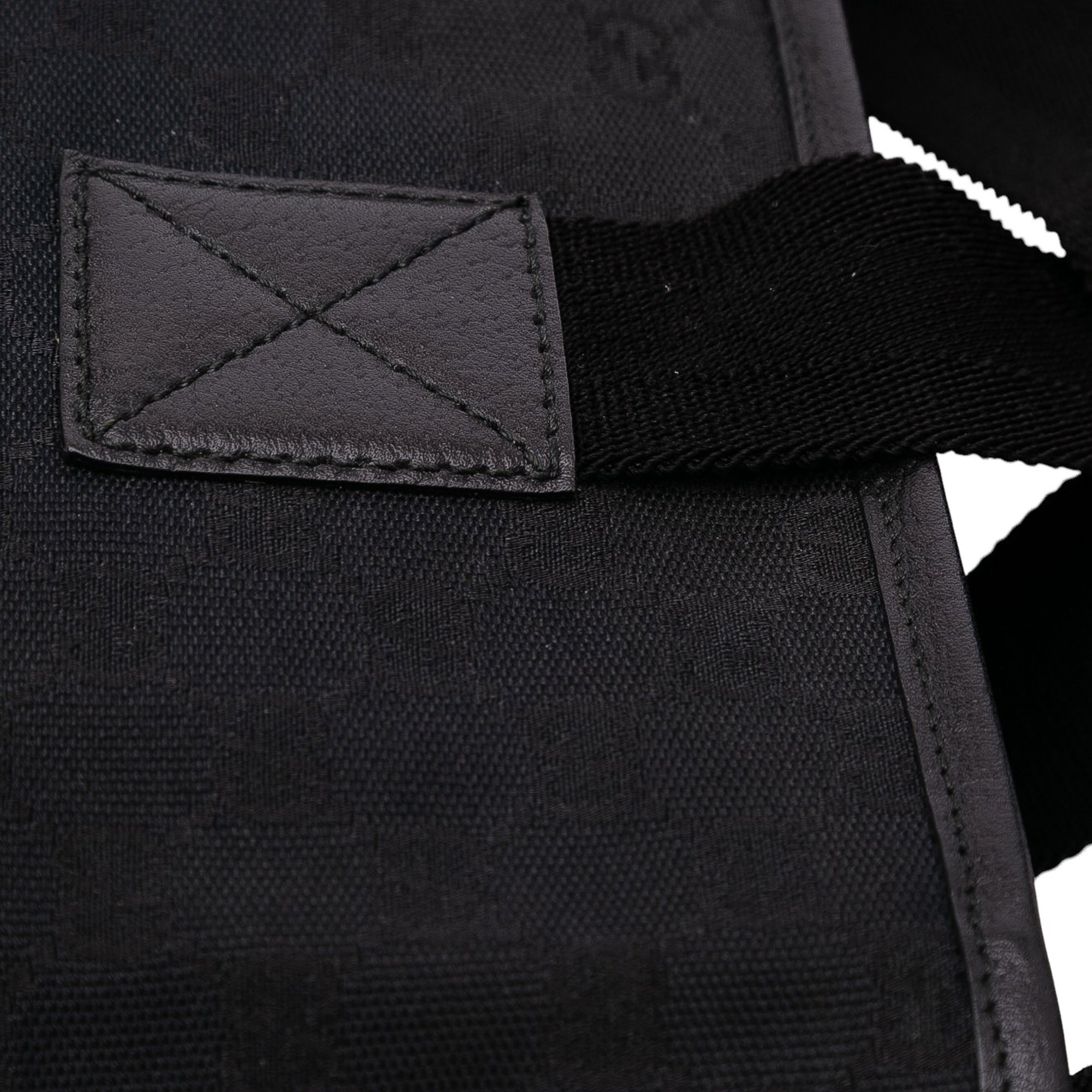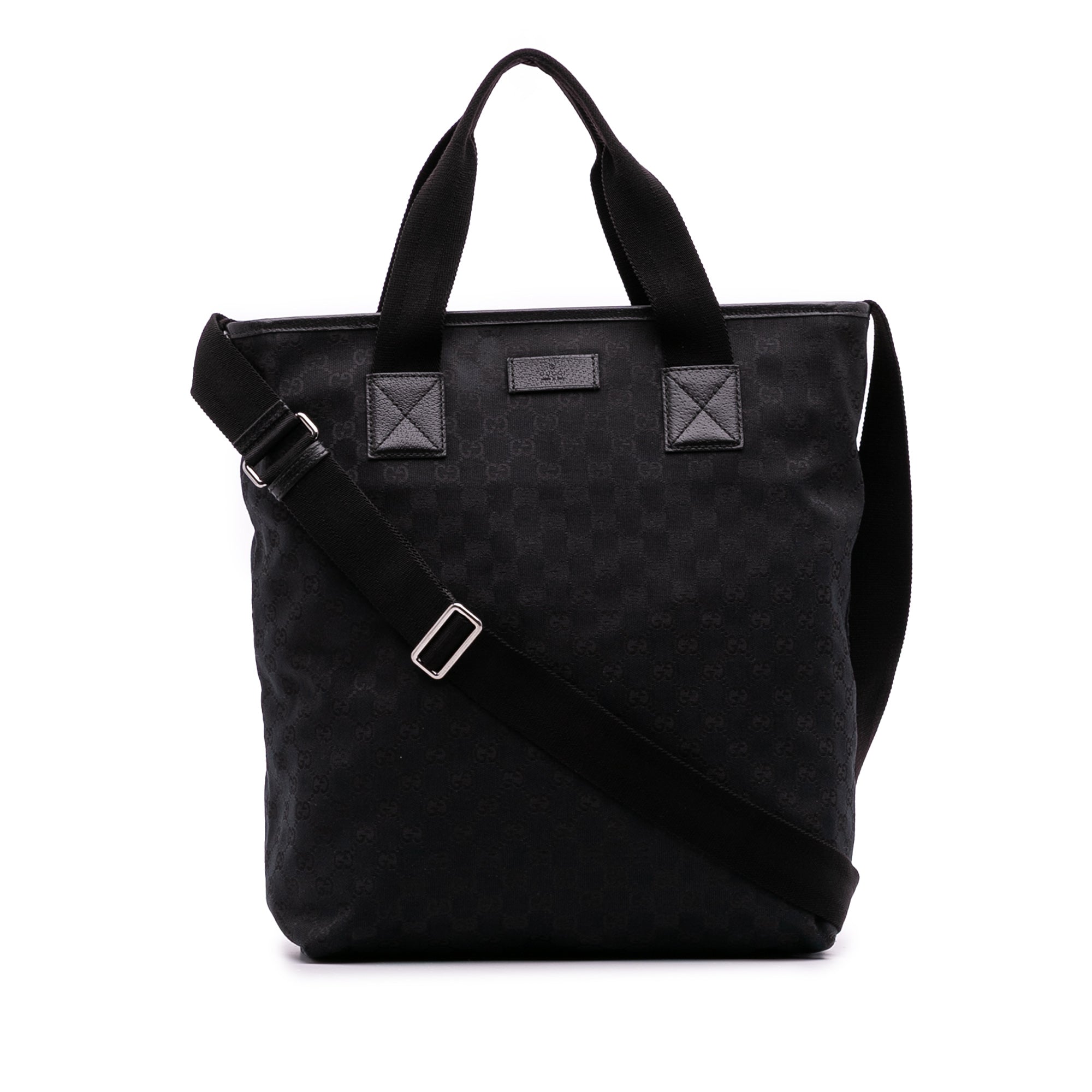 Product Details: Black Gucci GG Canvas Tote Satchel. This satchel features a canvas body with leather trim, flat handles, an adjustable and detachable flat strap, a top zip closure, and interior zip and slip pockets. 15.4" L x 12.8" W x 6.1" D, 6.1" drop. Serial number 256099 213048.